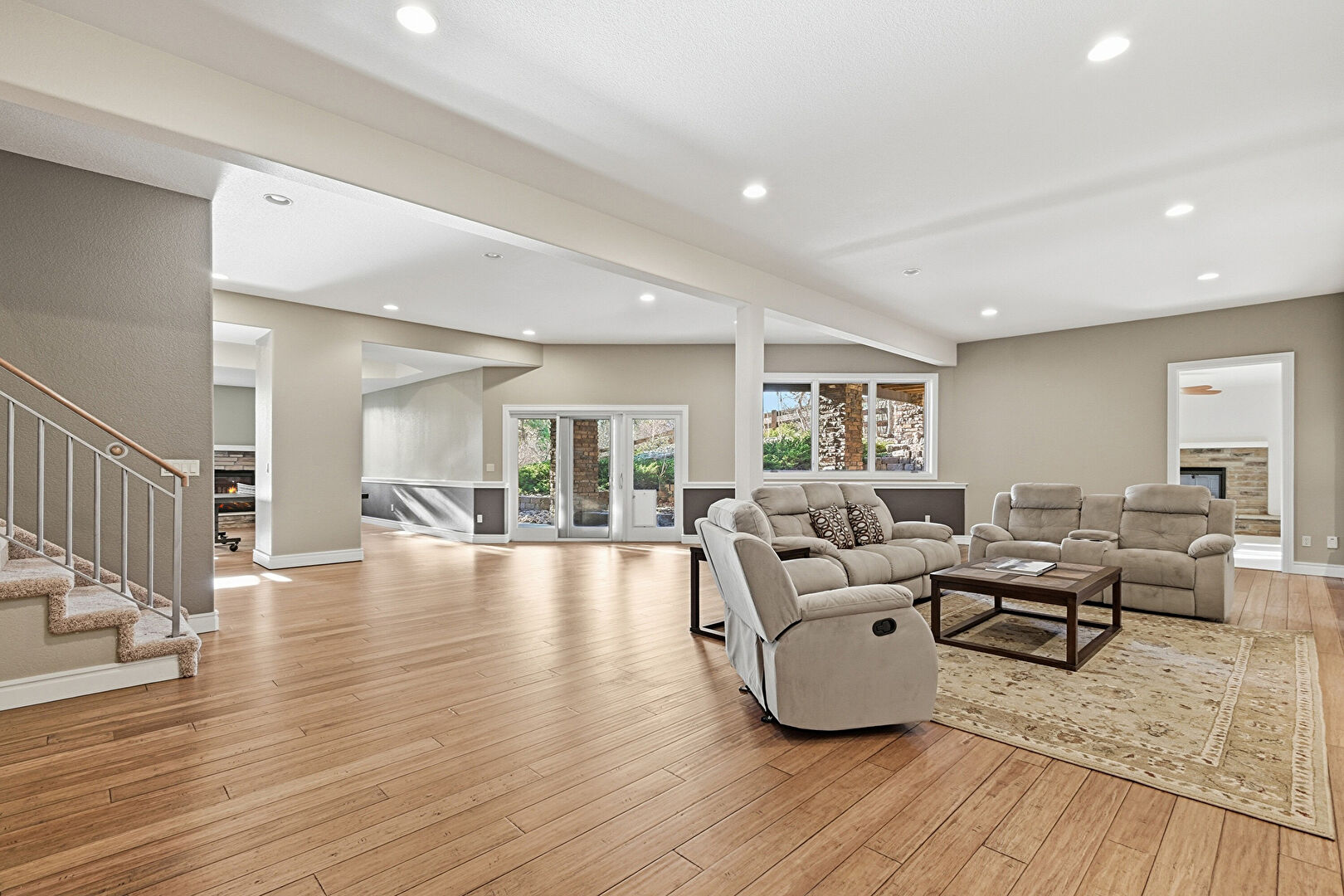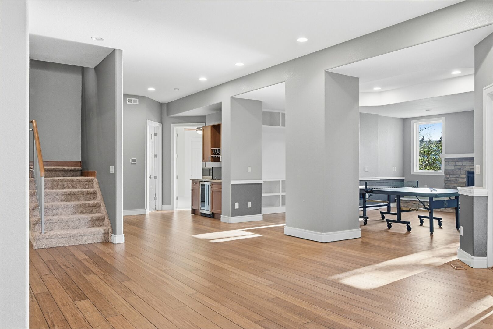 Baseboards Wall, Drywall, Fireplace, Natural Light, Recessed Lighting, Stairs, Vent, Wood Finish Floor, Wine Cooler