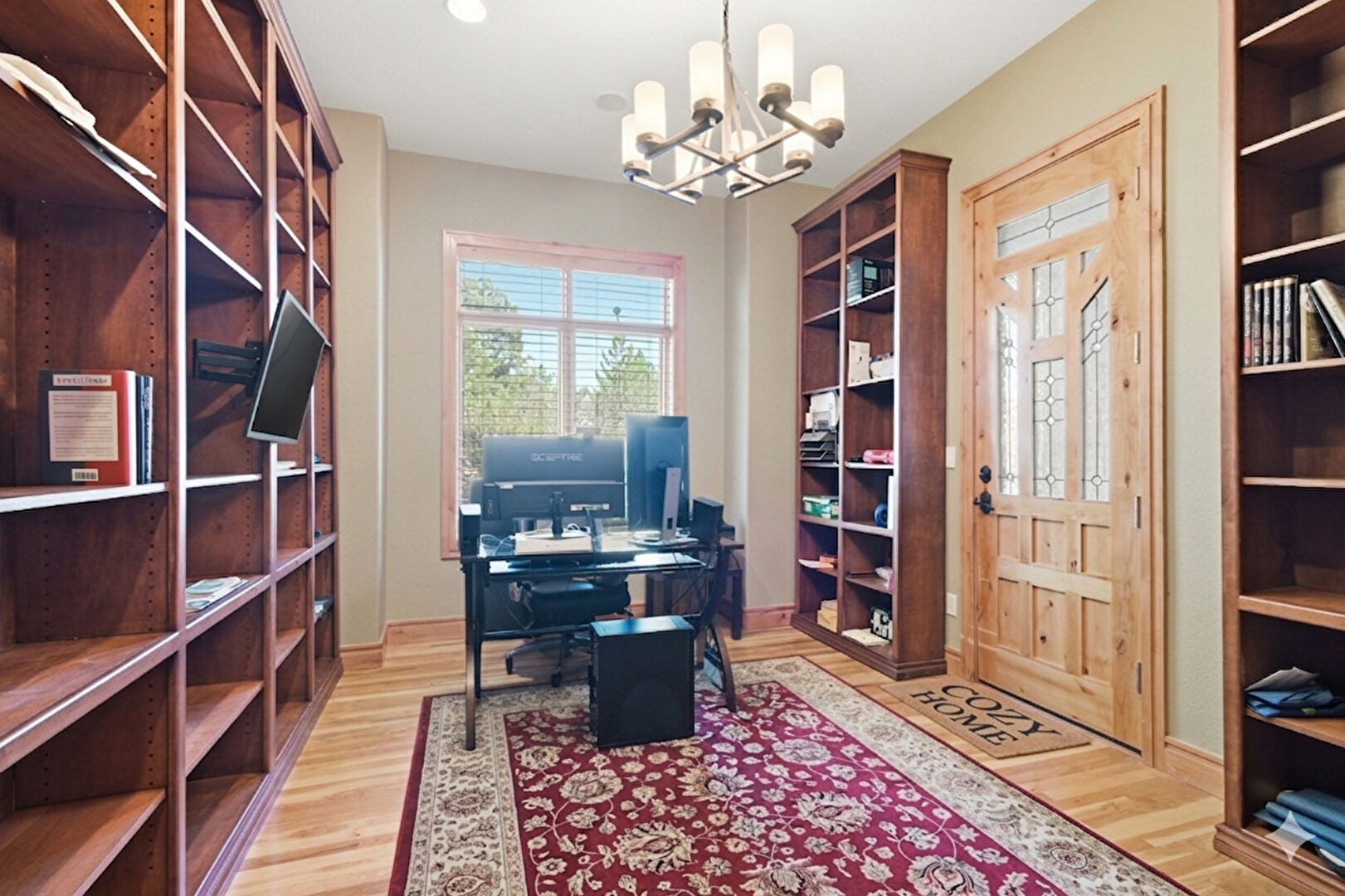 Baseboards Wall, Built In Shelves, Drywall, Notable Chandelier, Office Area, Wood Finish Floor, Natural Light