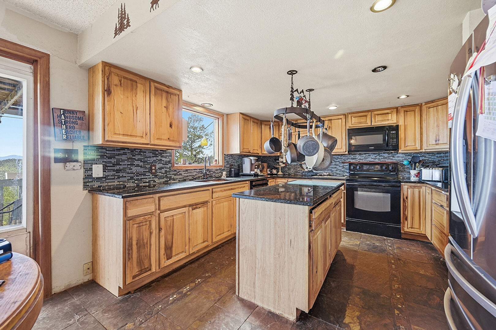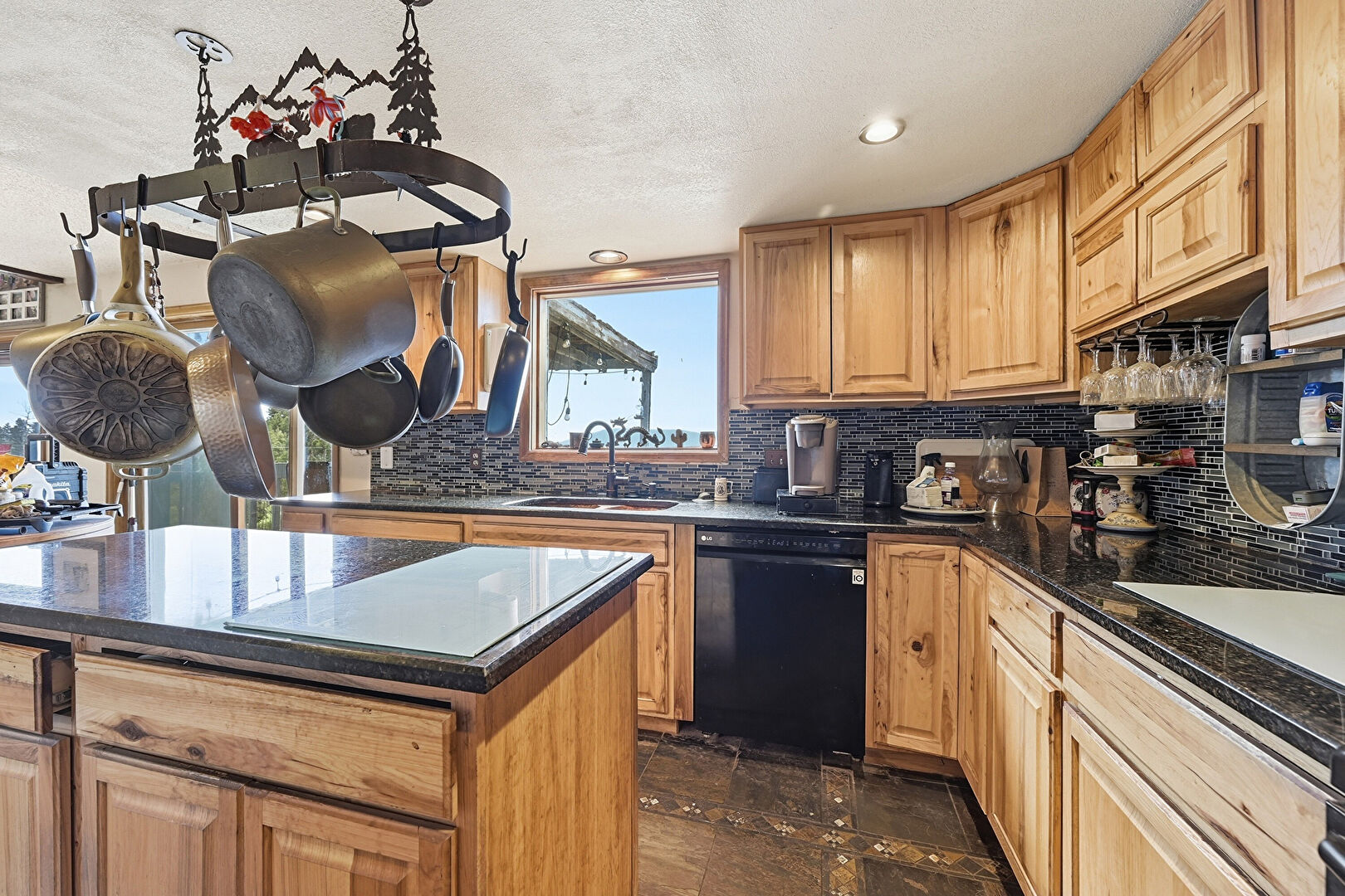 Drywall, Kitchen Island, Medium Brown Cabinets, Natural Light, Pendant Lighting, Raised Cabinets, Recessed Lighting, Stone Countertops, Stone Finish Floor, Textured Ceiling, Raised Cabinets, U Shaped Kitchen