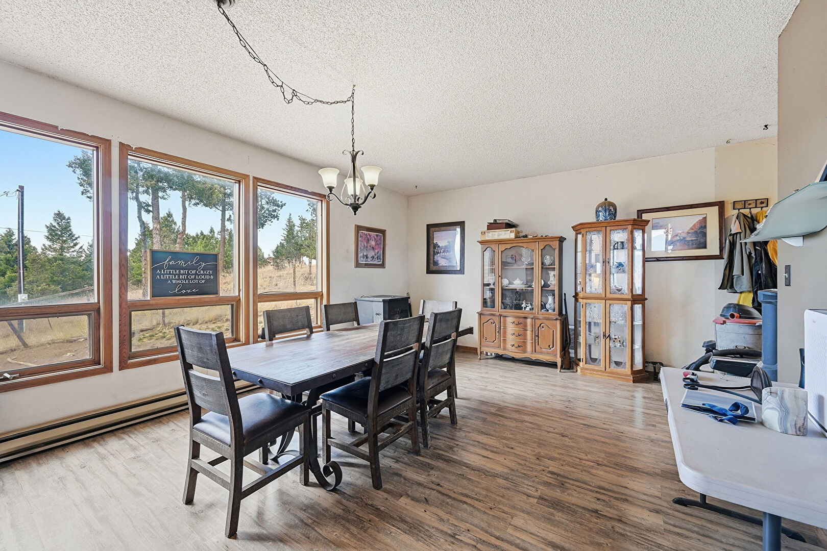Baseboard Radiator, Drywall, Natural Light, Textured Ceiling, Wood Finish Floor, Notable Chandelier