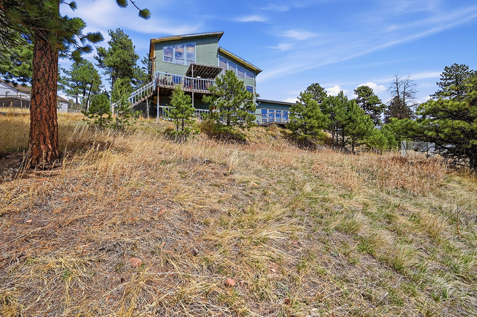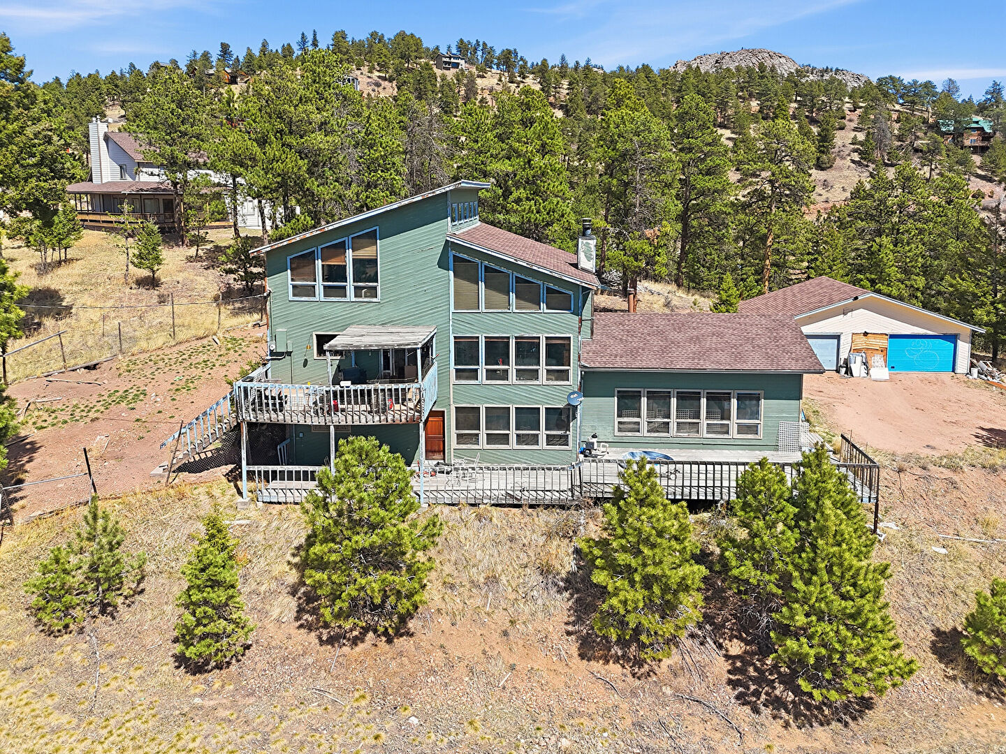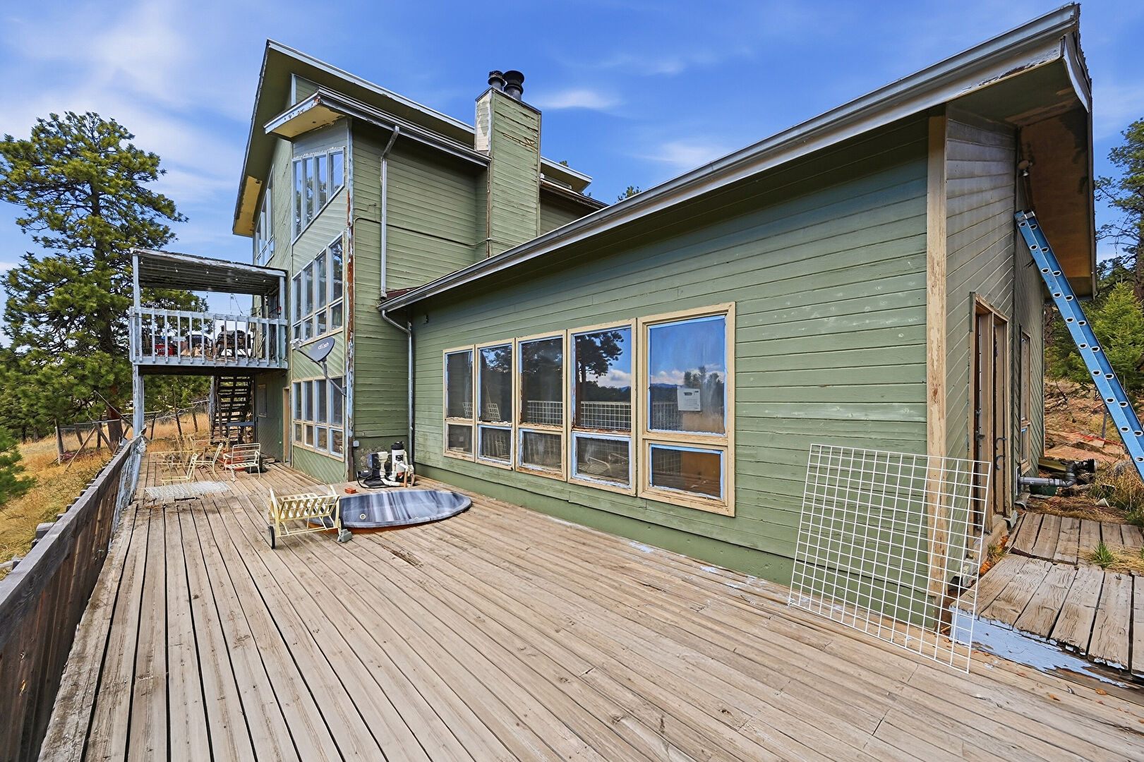 Chimney, Deck, Fence, Forest View, Garage, Horizontal Siding, Mountain View, Outdoor Structure, Rural View, Stairs, Sunroom, Woods View, Forest View, Glass Siding, Horizontal Siding, Mountain View, Water View, Woods View