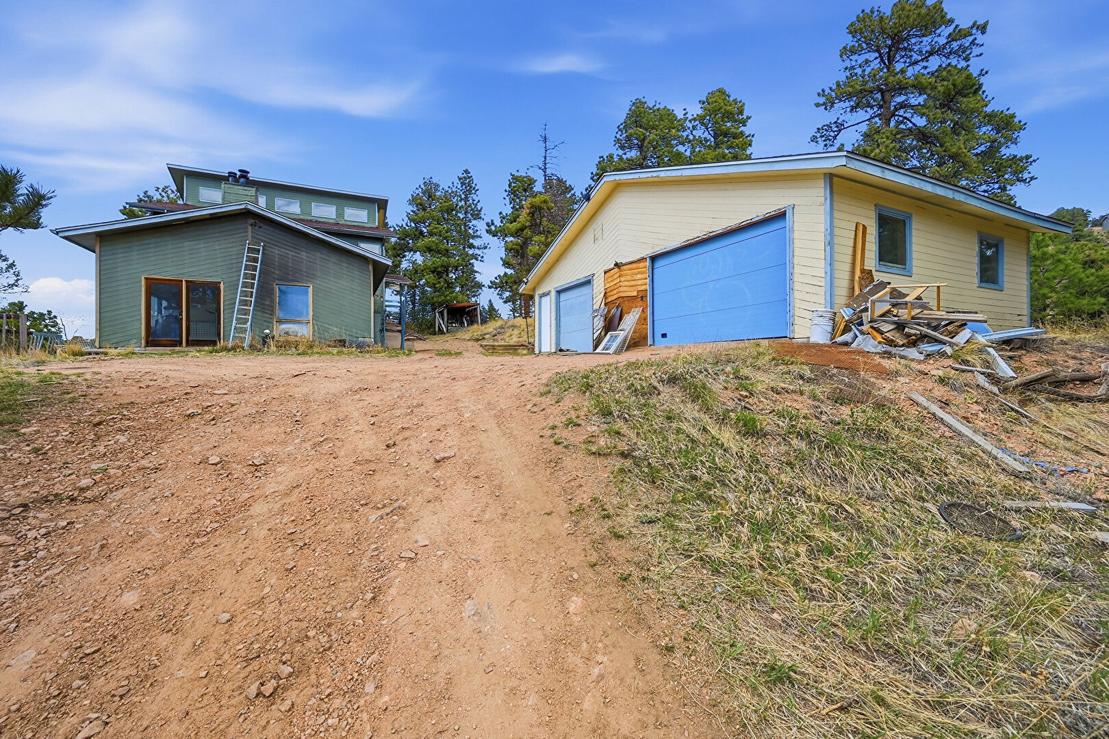 Chimney, Deck, Detached Garage, Entry Steps, Horizontal Siding, Outdoor Structure, Deck, Downspout, Horizontal Siding, Stairs