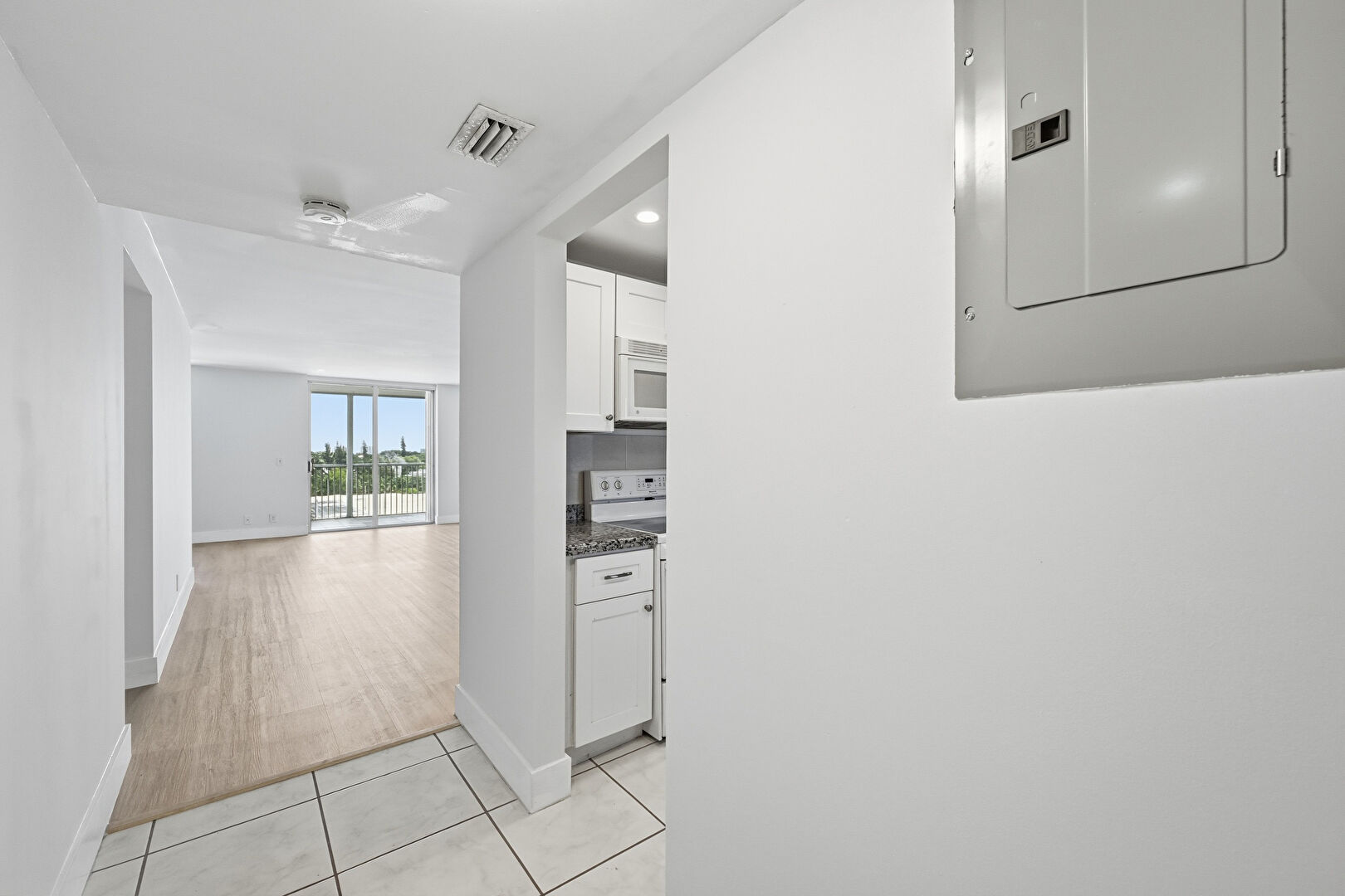 Baseboards Wall, Drywall, Electric Panel, Natural Light, Recessed Lighting, Tile Floor, Vent, Wood Finish Floor