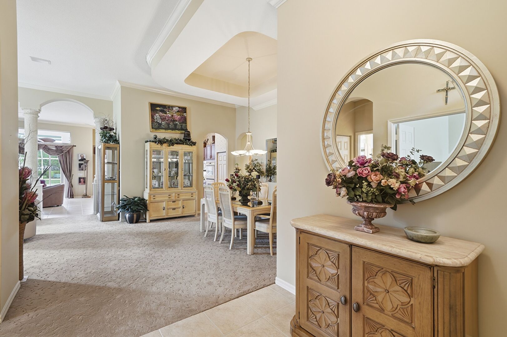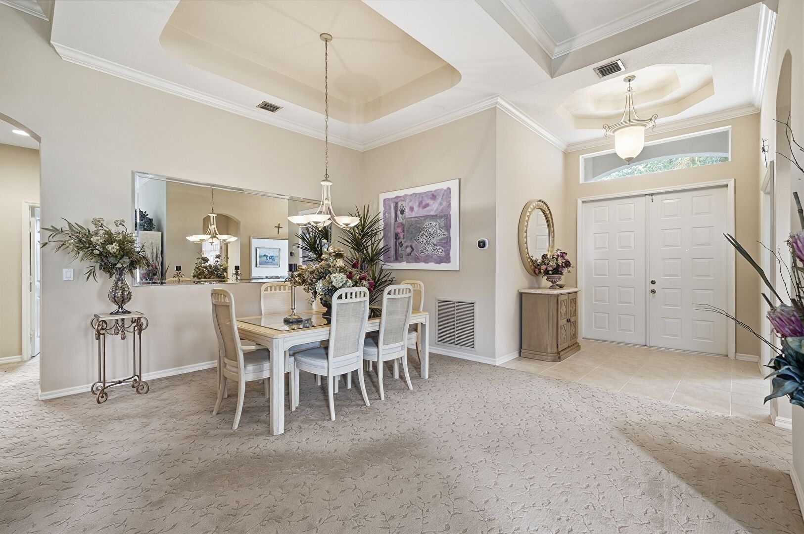 Arched Walkways, Baseboards Wall, Carpet, Crown Molding, Drywall, High Ceiling, Natural Light, Notable Chandelier, Tile Floor, Tray Ceiling, Vent, Ceiling Fan, Crown Molding, Drywall, Natural Light