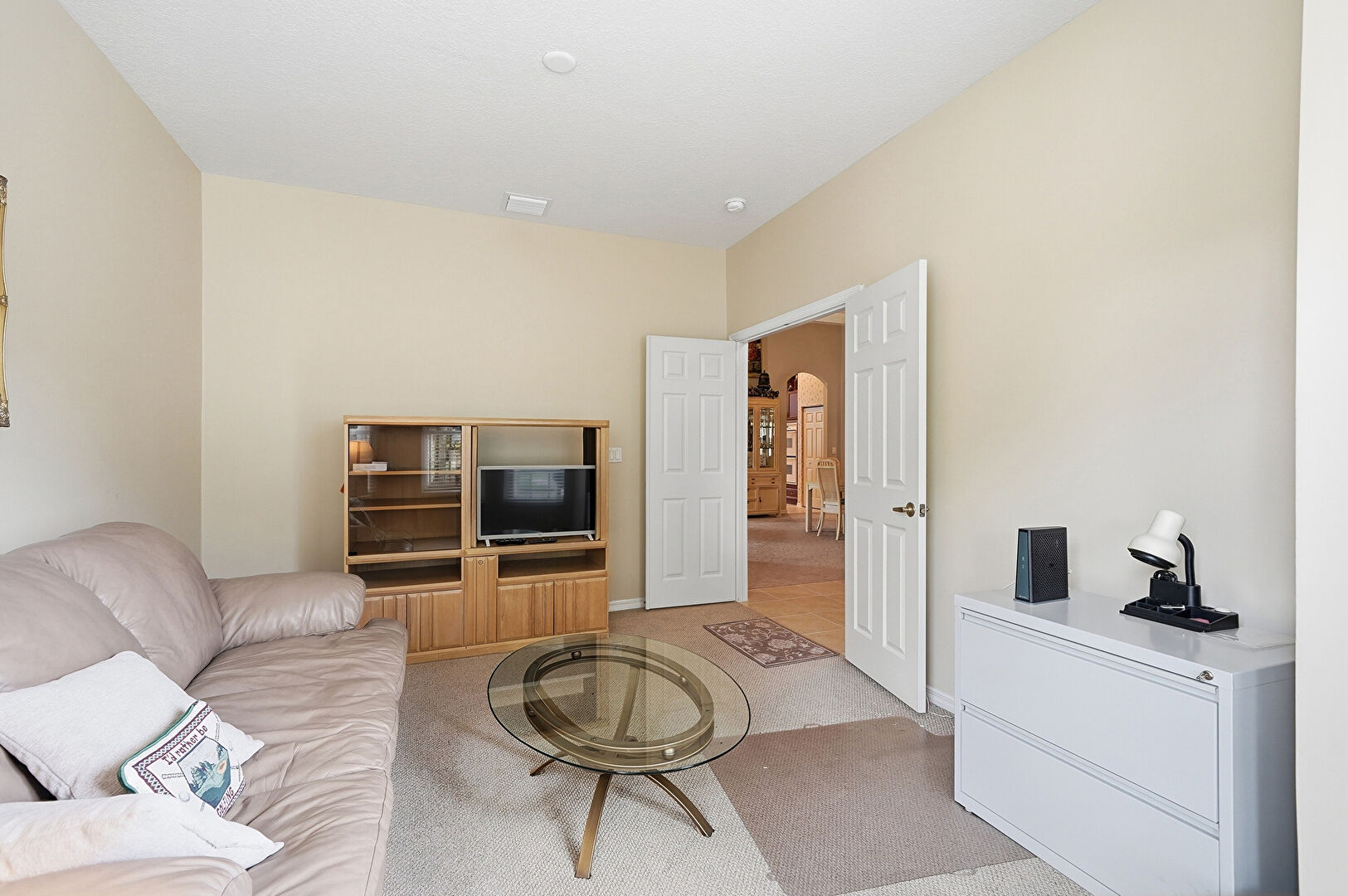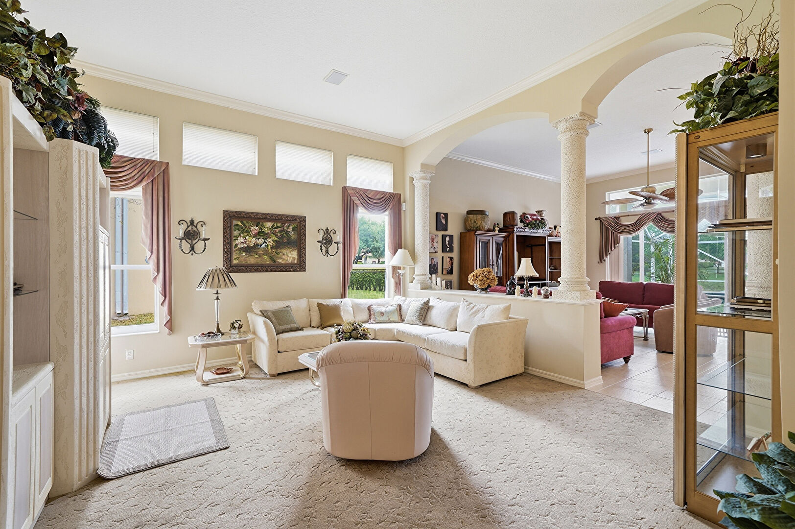Arched Walkways, Baseboards Wall, Carpet, Crown Molding, Decorative Columns, Drywall, Natural Light, Tile Floor, Vent, Carpet, Crown Molding, Vent