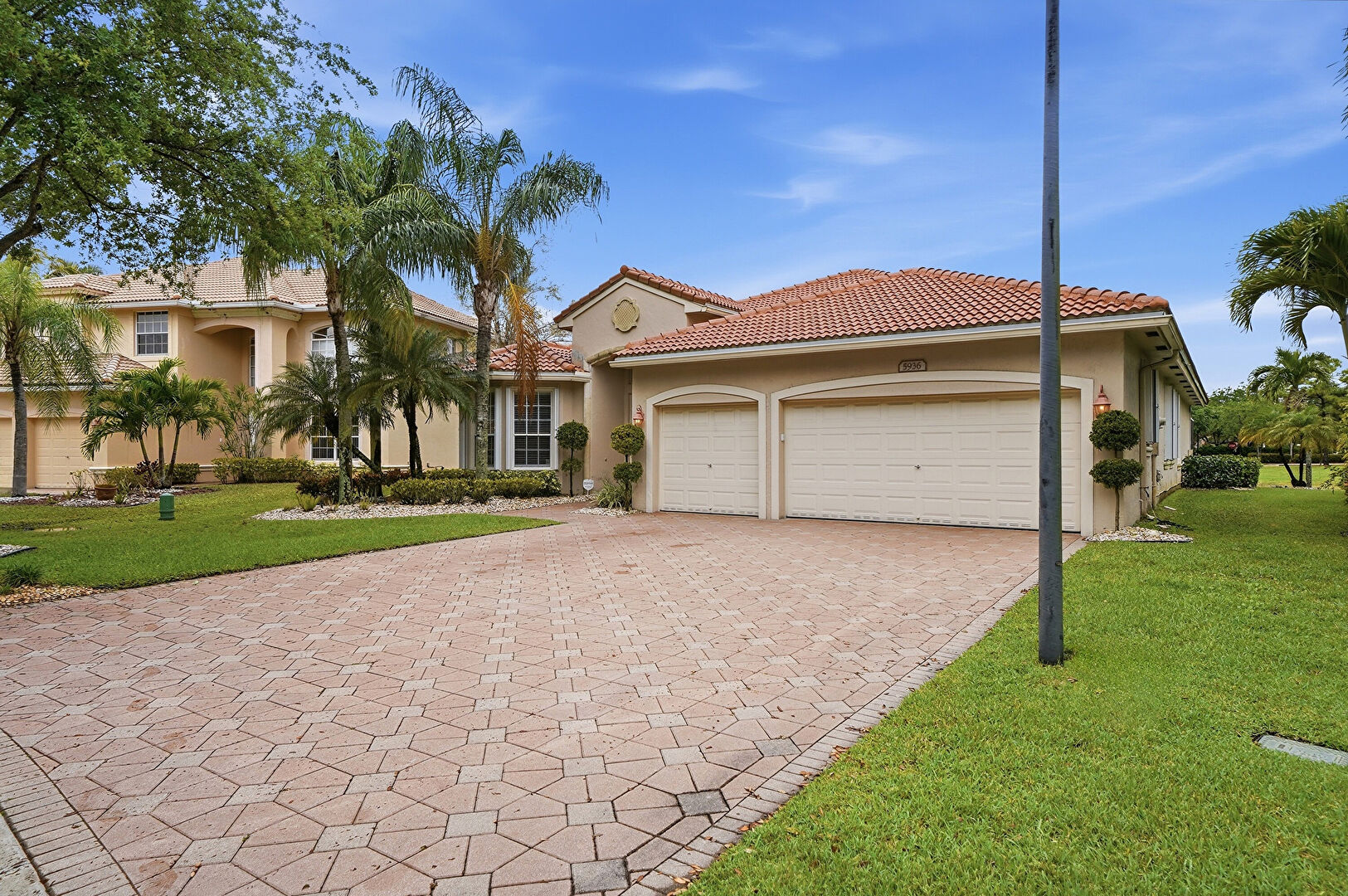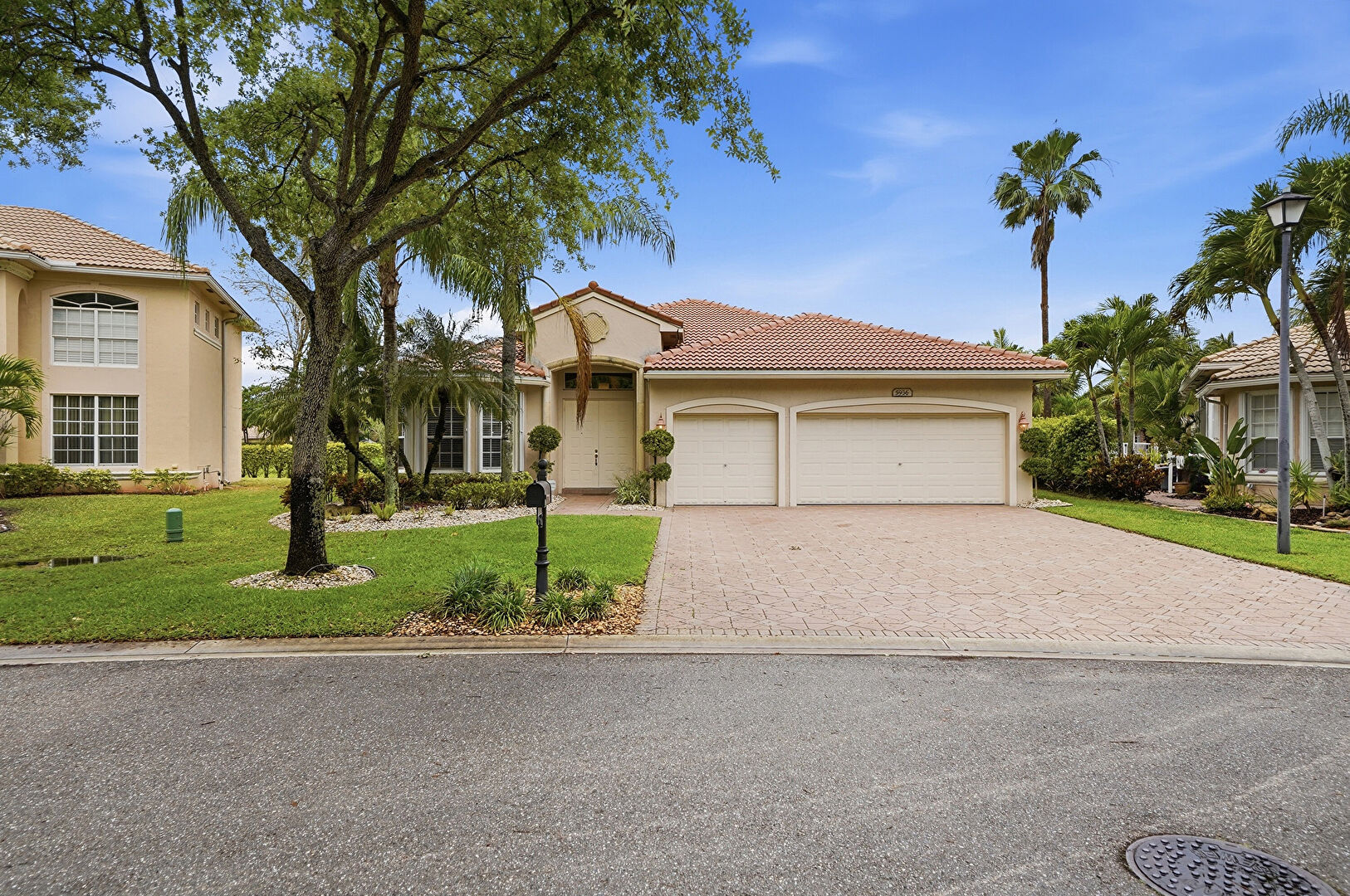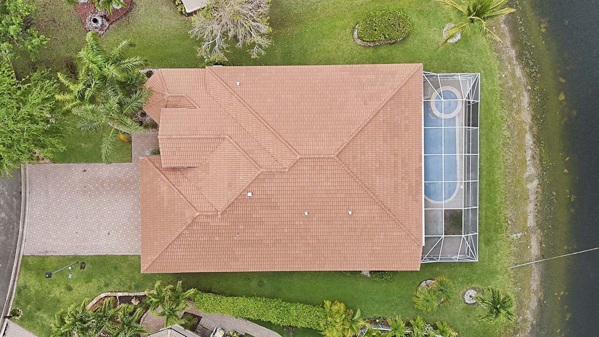 Downspout, Driveway, Lawn, Stucco Siding, Tile Roof, Driveway, Gutters, Lawn, Stucco Siding
