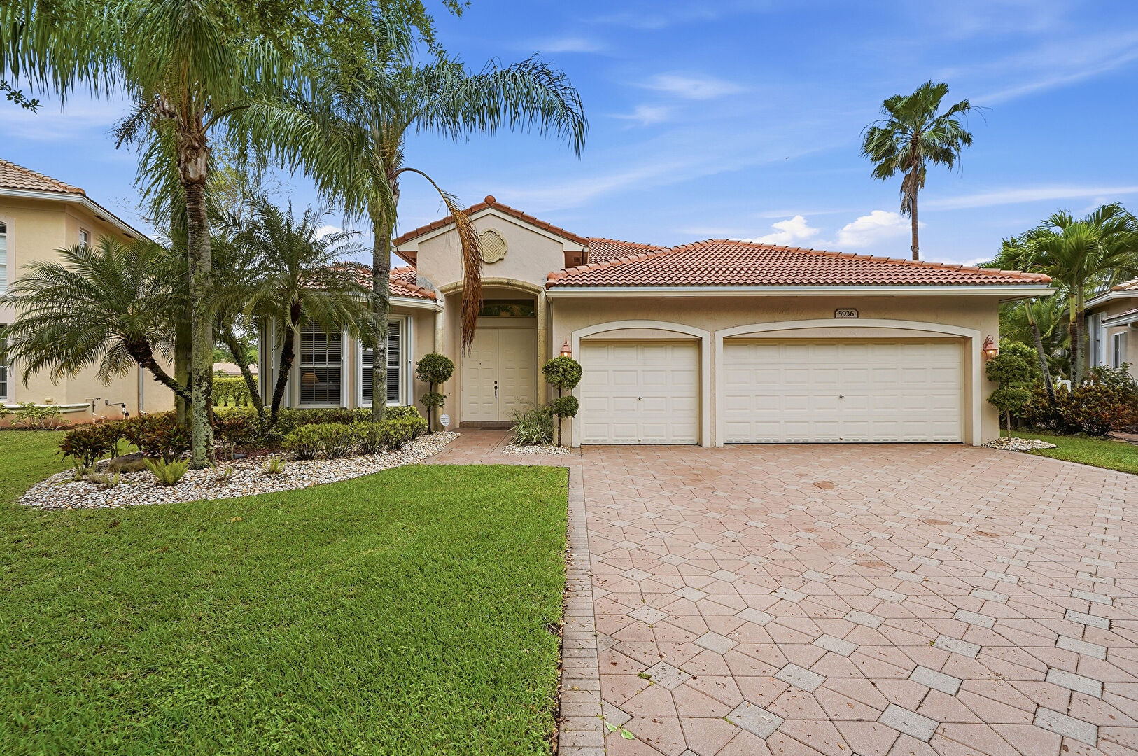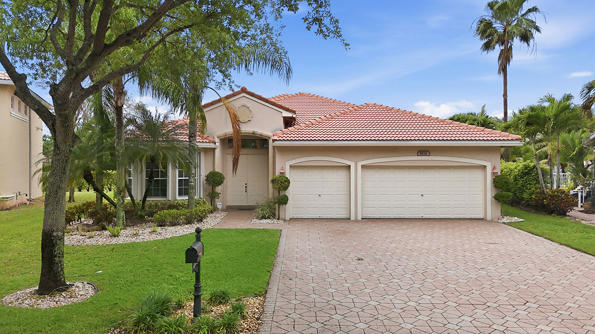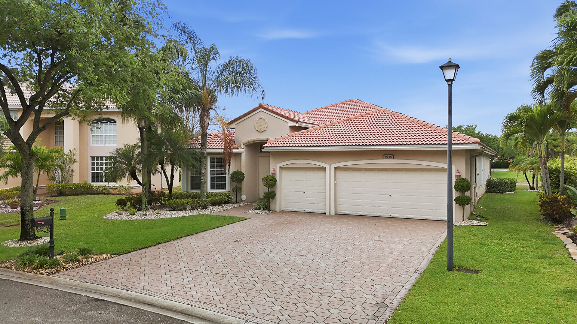 Downspout, Driveway, Lawn, Stucco Siding, Tile Roof, Driveway, Gutters, Lawn, Stucco Siding