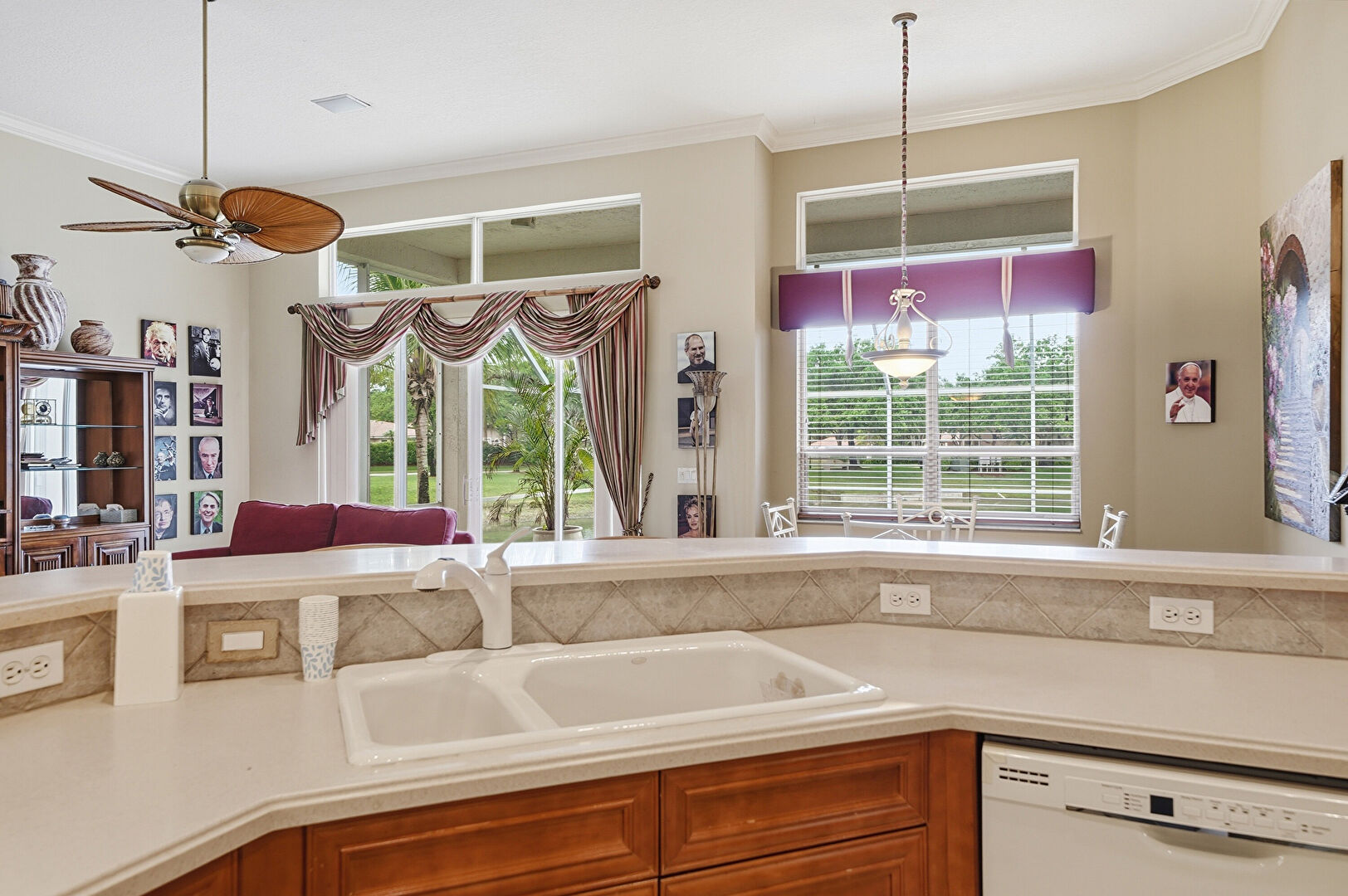 Arched Walkways, Baseboards Wall, Carpet, Ceiling Fan, Crown Molding, Decorative Columns, Double Oven, Drywall, G Shaped Kitchen, Kitchen Bar, Kitchen Peninsula, Medium Brown Cabinets, Natural Light, Opens To Living Area, Pendant Lighting, Recessed Lighting, Shaker Cabinets, Tile Floor, Vent, Wallpaper Wall, Crown Molding, Kitchen Peninsula, Opens To Living Area, Stone Countertops, Tile Floor, Vent
