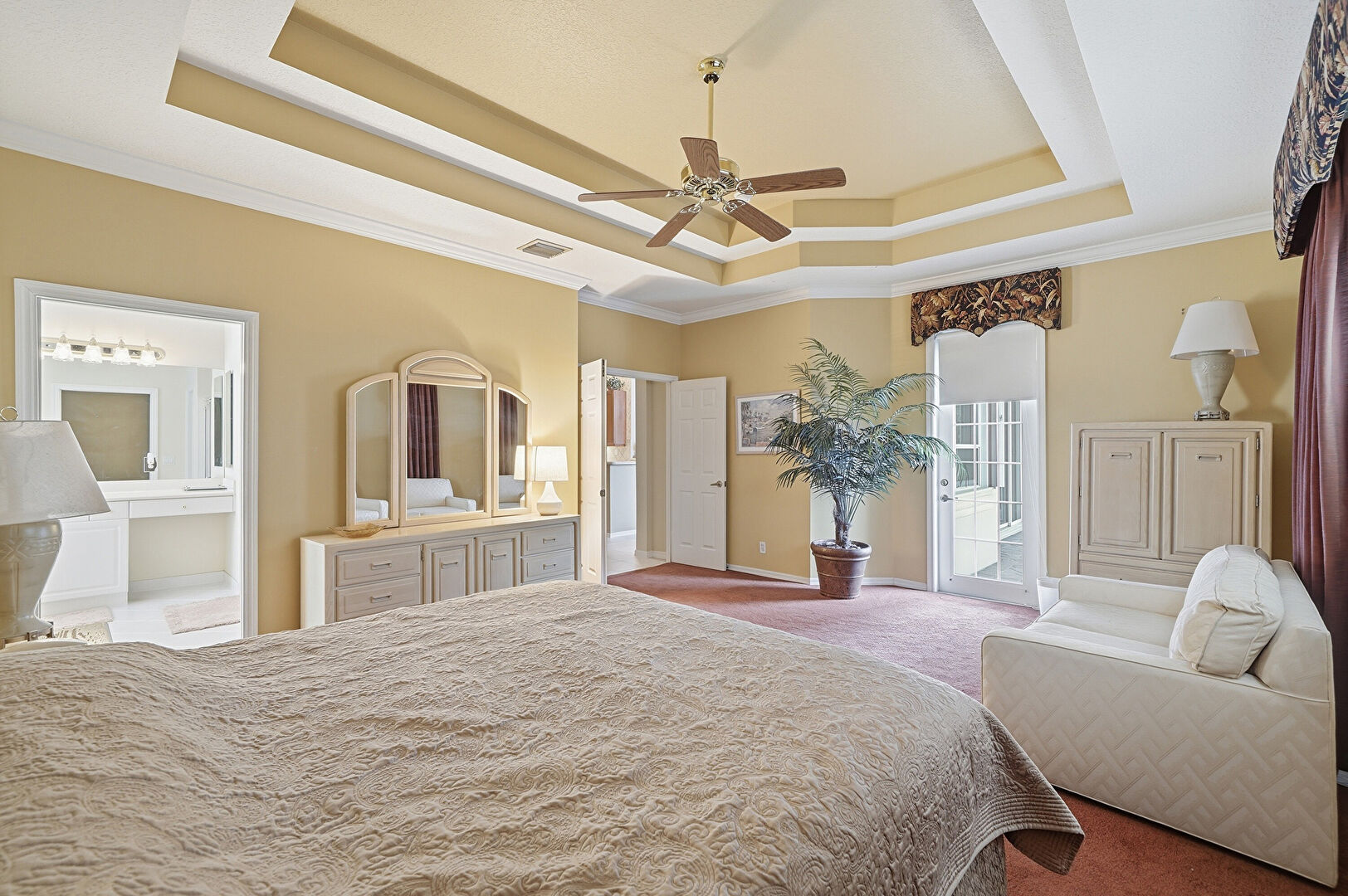 Access To Exterior, Baseboards Wall, Carpet, Ceiling Fan, Crown Molding, Drywall, Ensuite Bathroom, Natural Light, Tray Ceiling, Vent, Access To Exterior, Drywall, Tray Ceiling