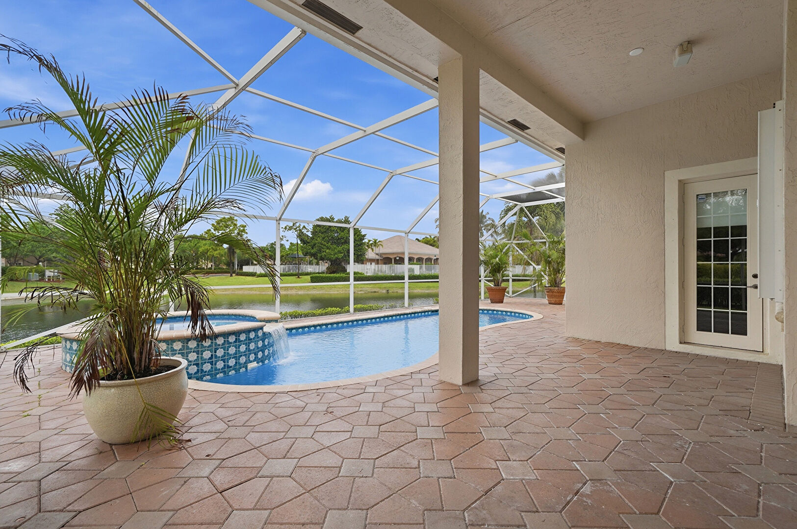 Hot Tub, Lanai, Lawn, Patio, Pool, Pool Hot Tub Combo, Sunroom, Water View, Waterfront, Fence, Pool, Pool Hot Tub Combo, Pool Water Feature, Sunroom
