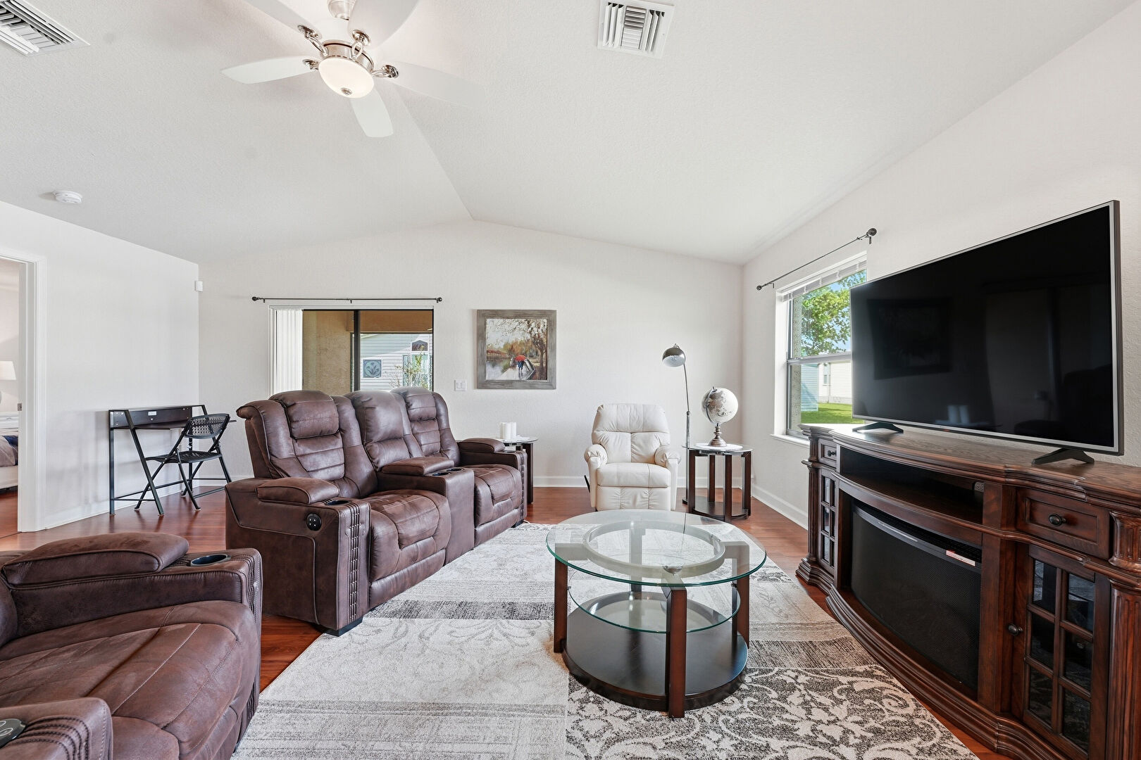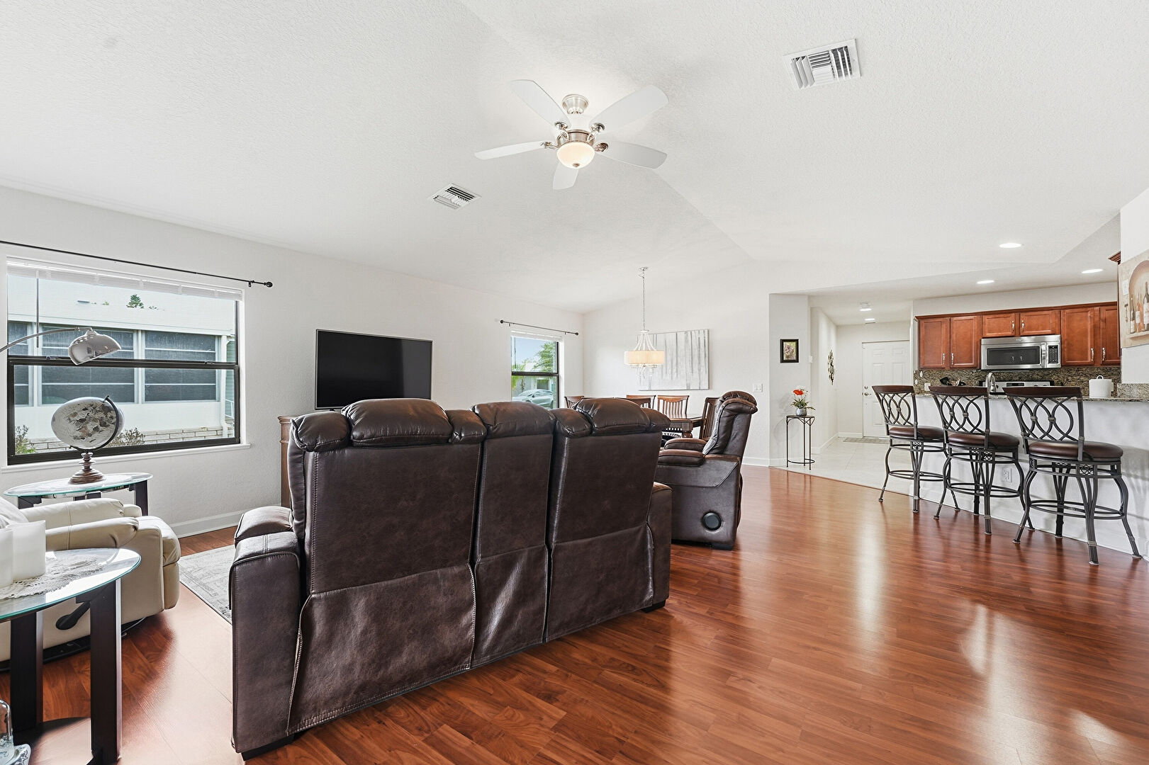 Baseboards Wall, Ceiling Fan, Natural Light, Notable Chandelier, Vaulted Ceiling, Vent, Wood Finish Floor, Drywall