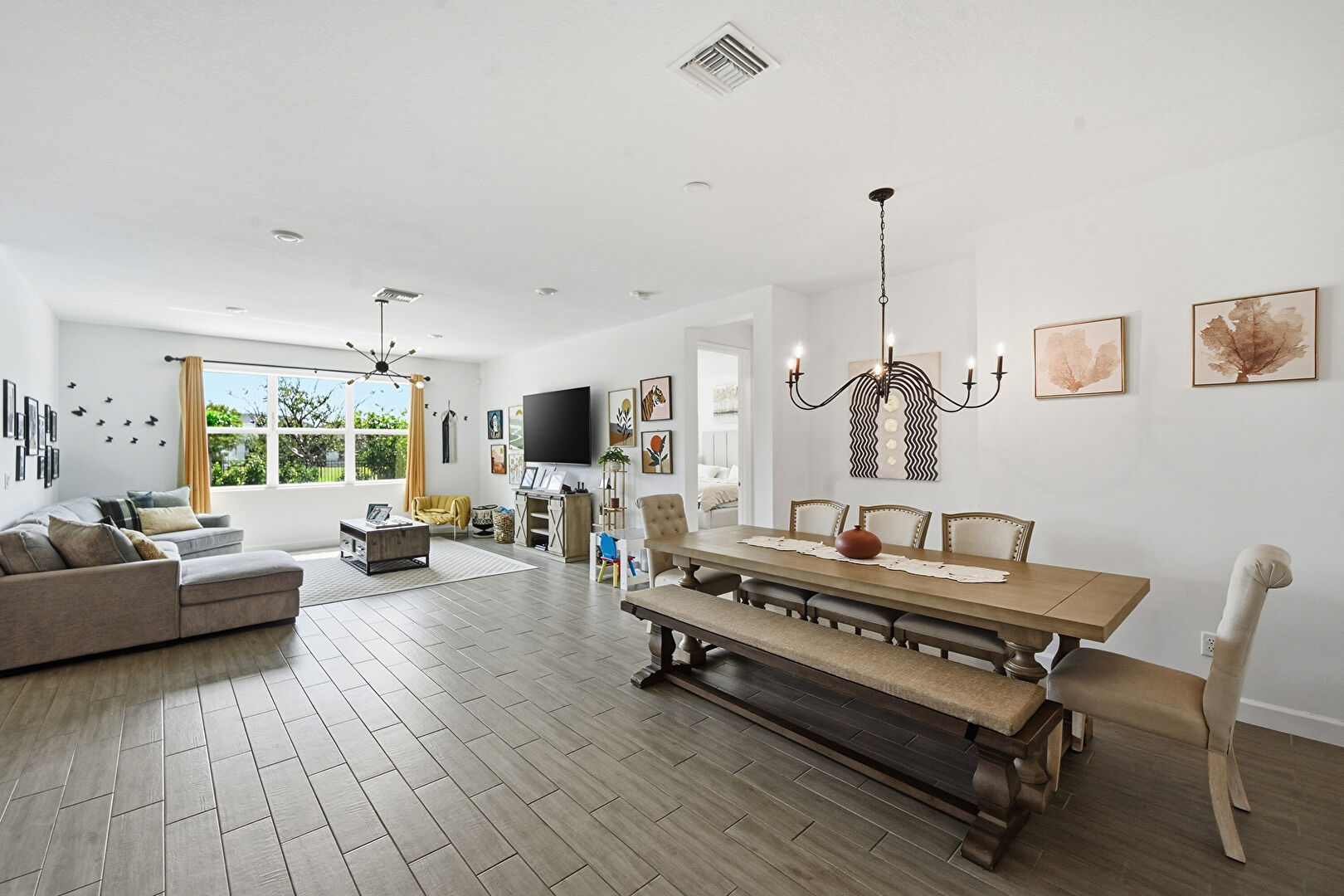 Baseboards Wall, Drywall, L Shaped Kitchen, Natural Light, Notable Chandelier, Recessed Lighting, Vent, Wood Finish Floor, Baseboards Wall, Notable Chandelier, Recessed Lighting, Wood Finish Floor