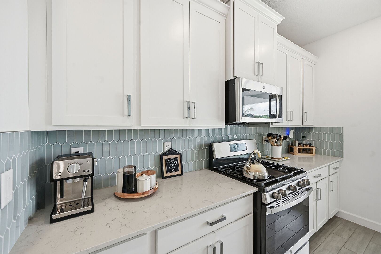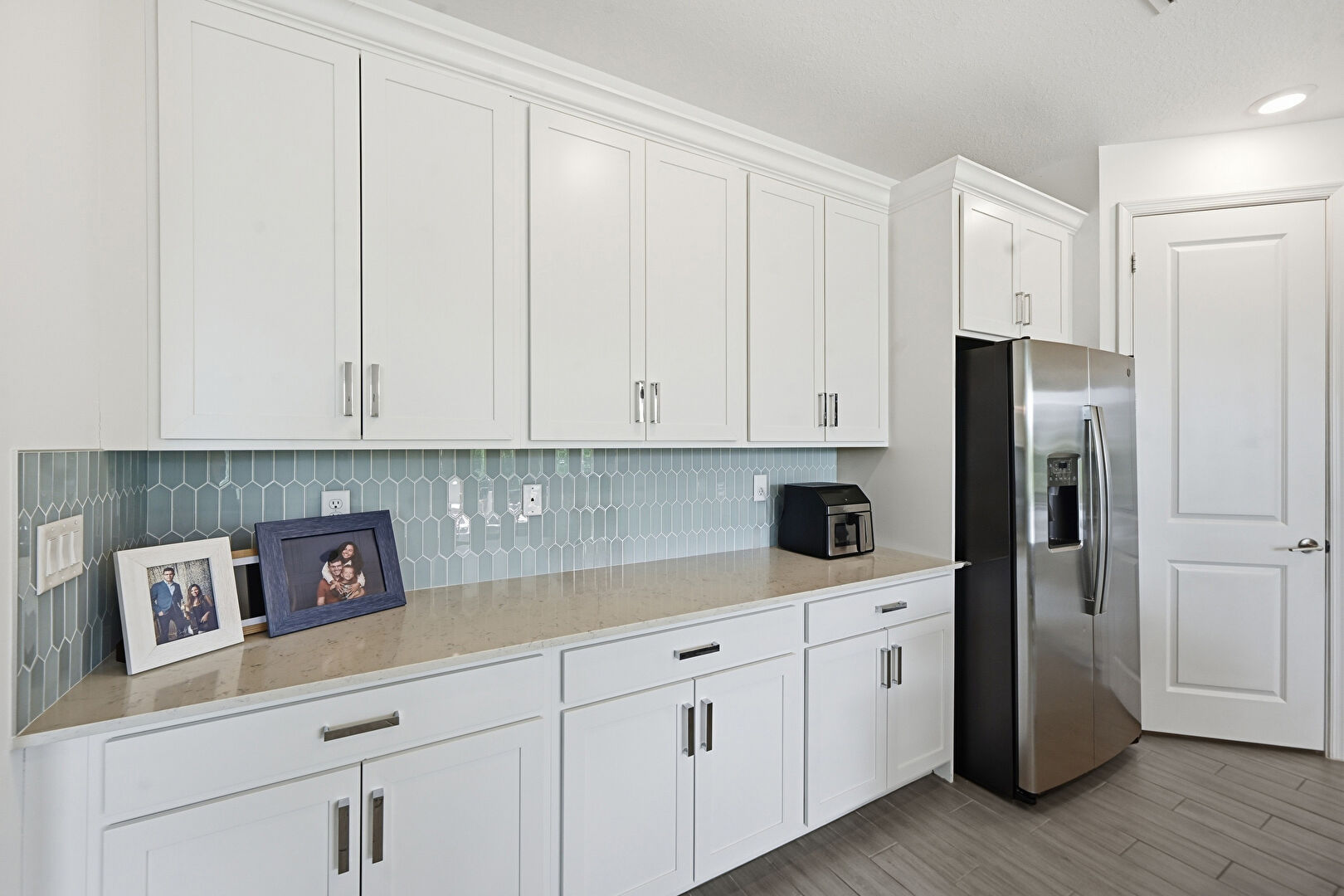 Baseboards Wall, Crown Molding Cabinets, Drywall, Kitchen Bar, Kitchen Island, L Shaped Kitchen, Natural Light, Notable Chandelier, Opens To Living Area, Pendant Lighting, Recessed Lighting, Shaker Cabinets, Stone Countertops, Vent, Wood Finish Floor, Baseboards Wall, Ceiling Fan, Kitchen Island, Stone Countertops