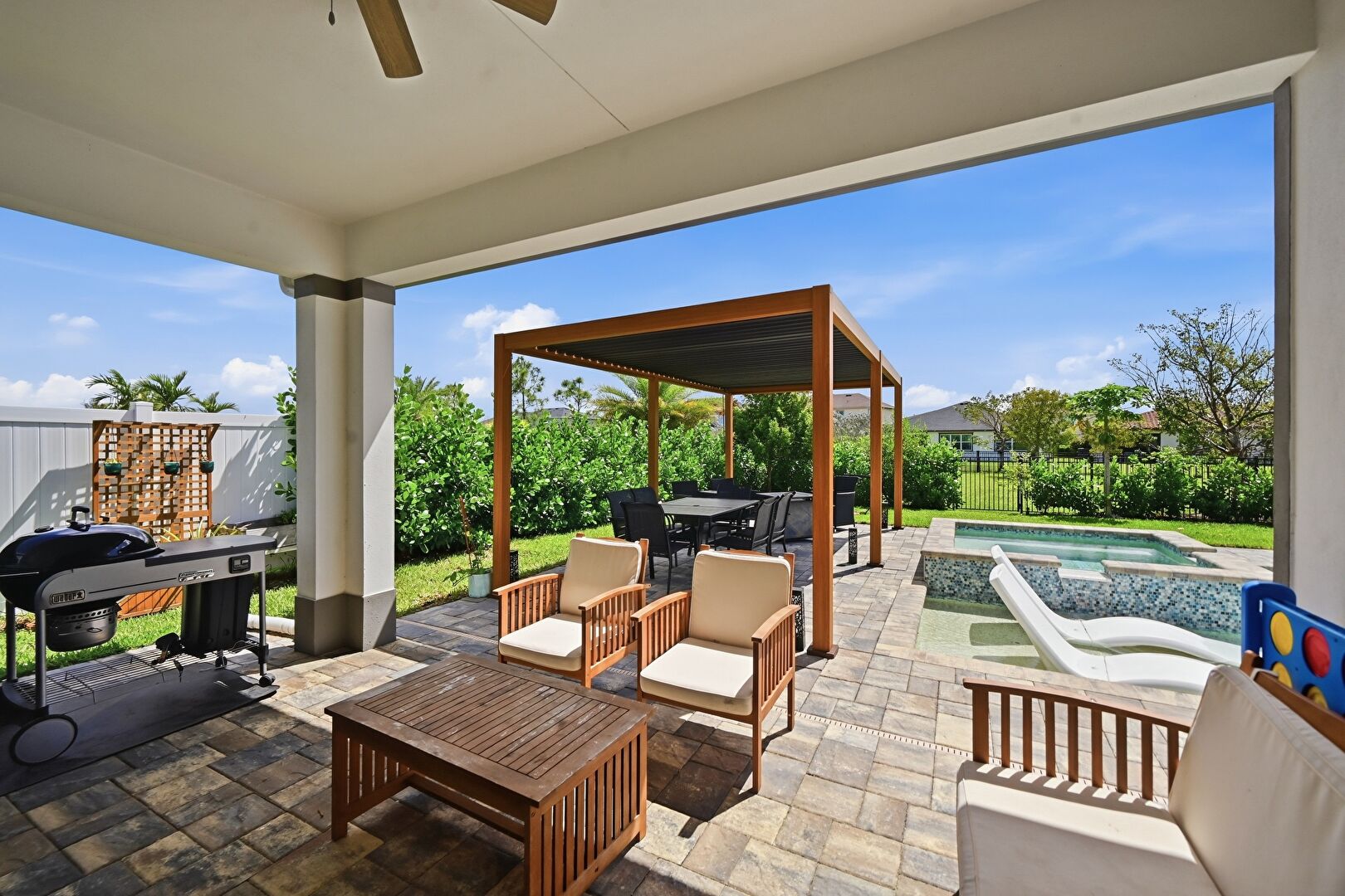 Ceiling Fan, Fence, Fire Pit, Hot Tub, Lawn, Outdoor Dining Area, Outdoor Living Space, Patio, Pergola, Pool, Pool Hot Tub Combo, Hot Tub, Outdoor Dining Area, Outdoor Living Space, Pool