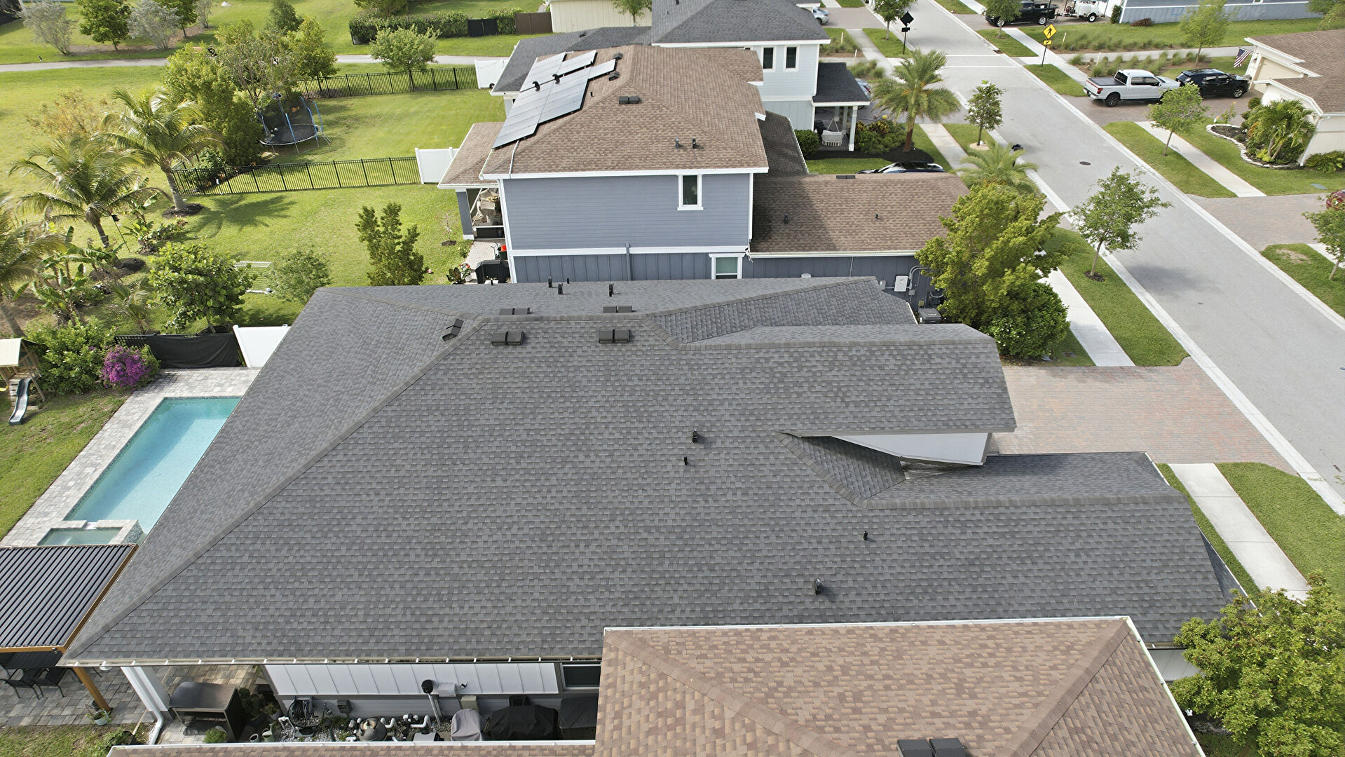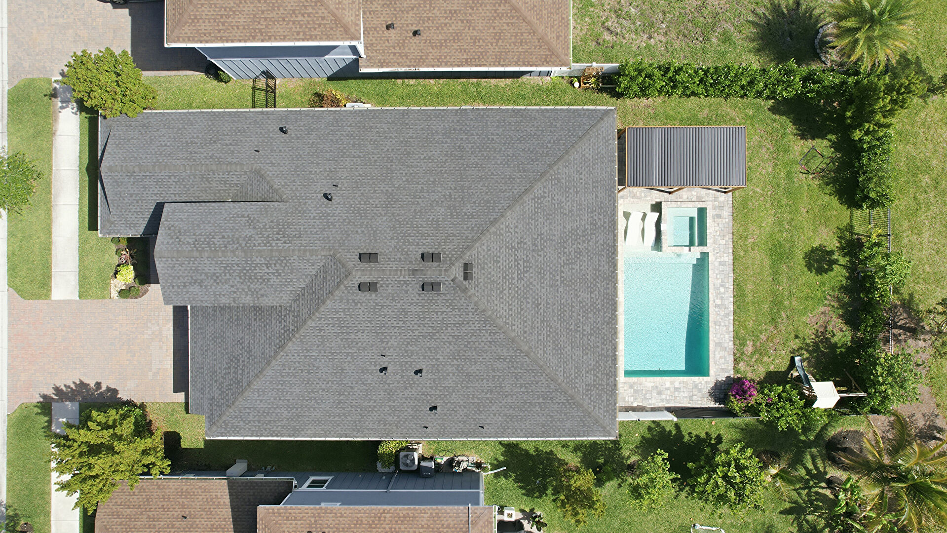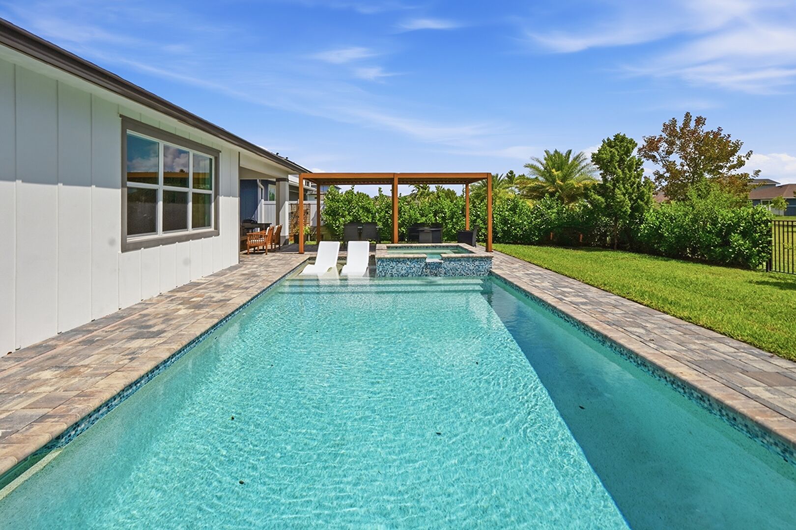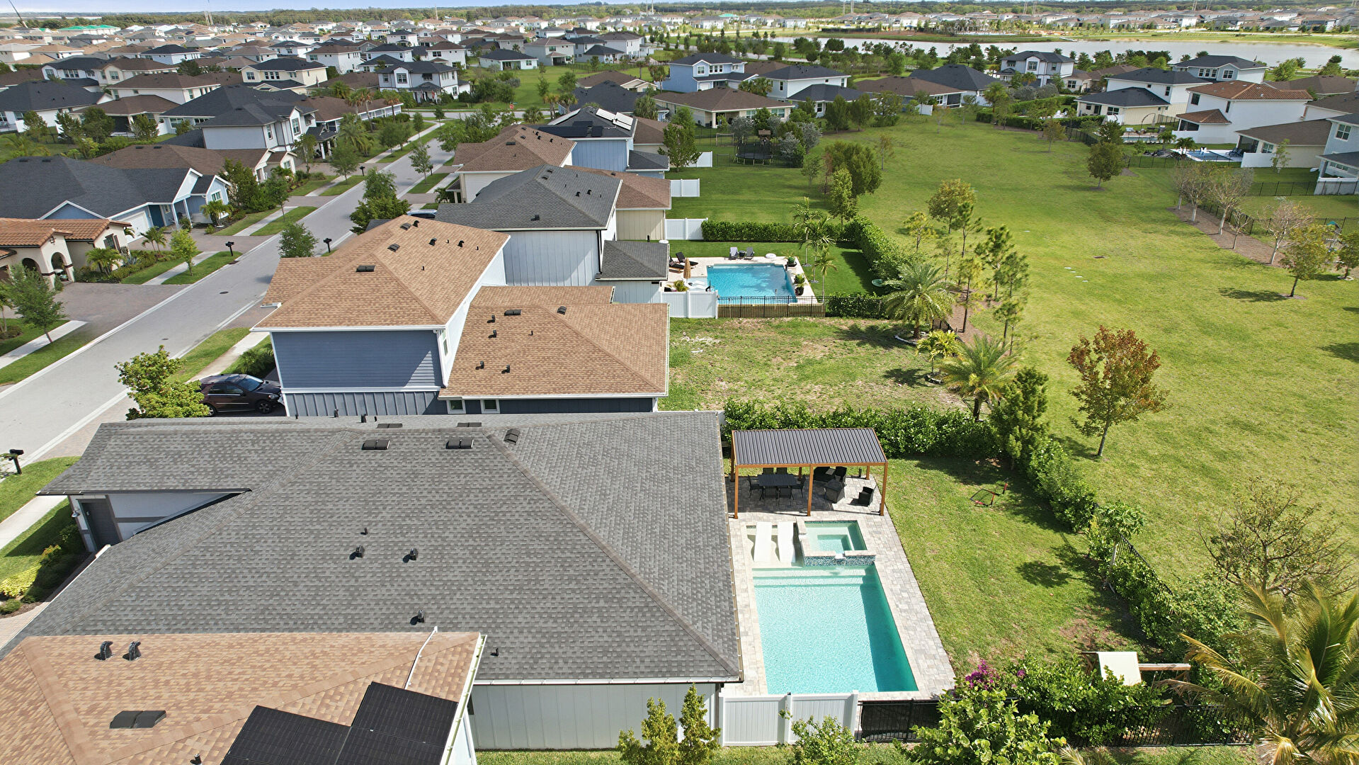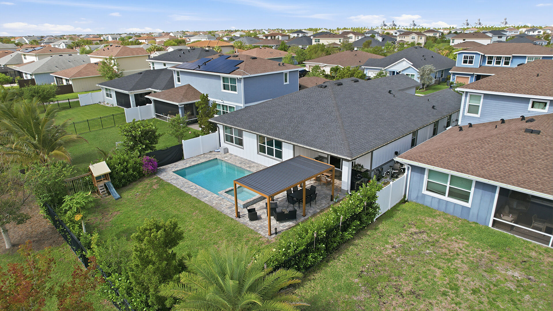 Board Batten Siding, Downspout, Fence, Gutters, Lawn, Patio, Pool, Shingle Roof, Vertical Siding, Patio, Pool