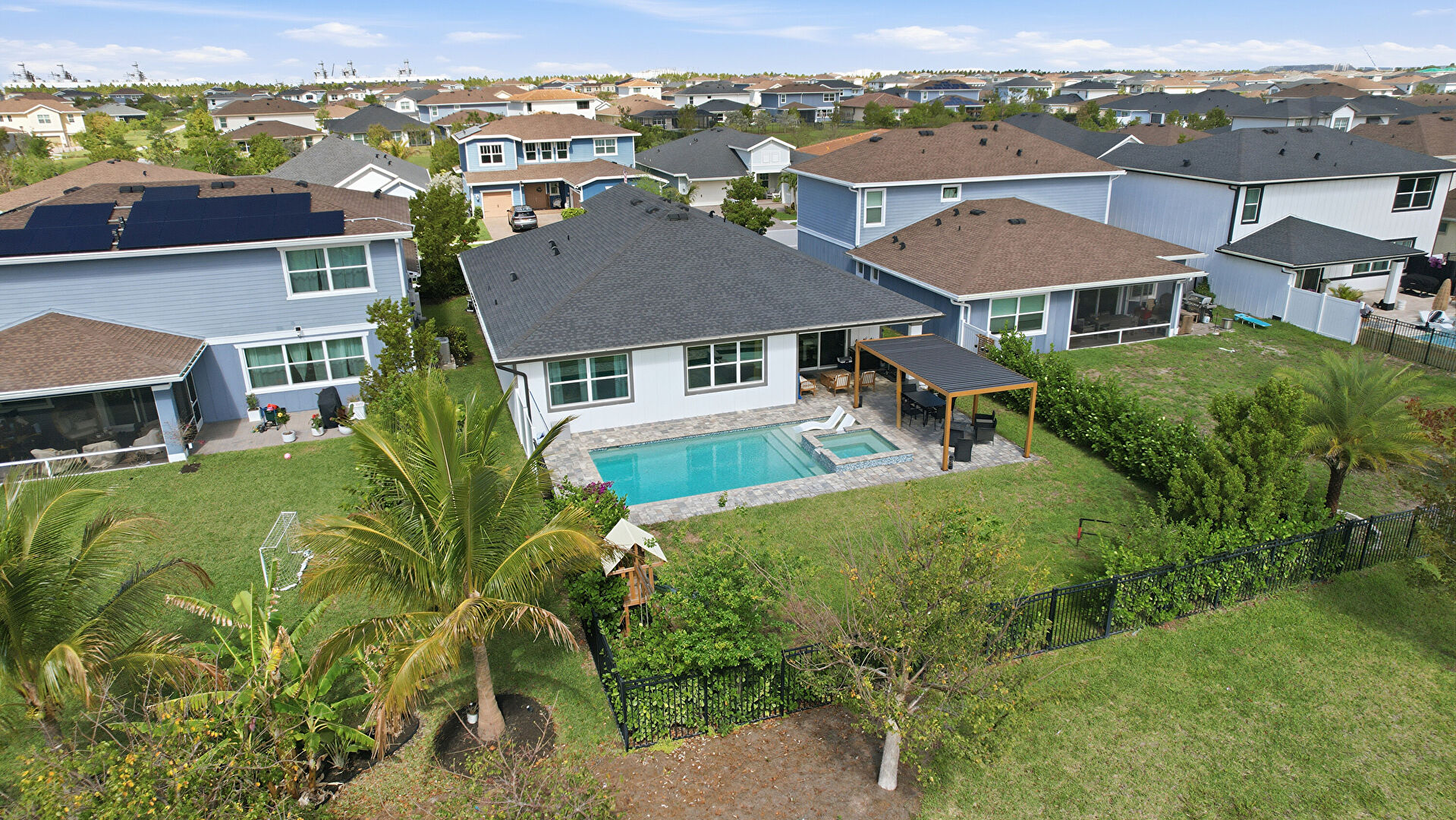 Downspout, Fence, Grill, Lawn, Patio, Pool, Pool Hot Tub Combo, Residential View, Shingle Roof, Sunroom, Water View, Fence, Pool, Residential View, Water View