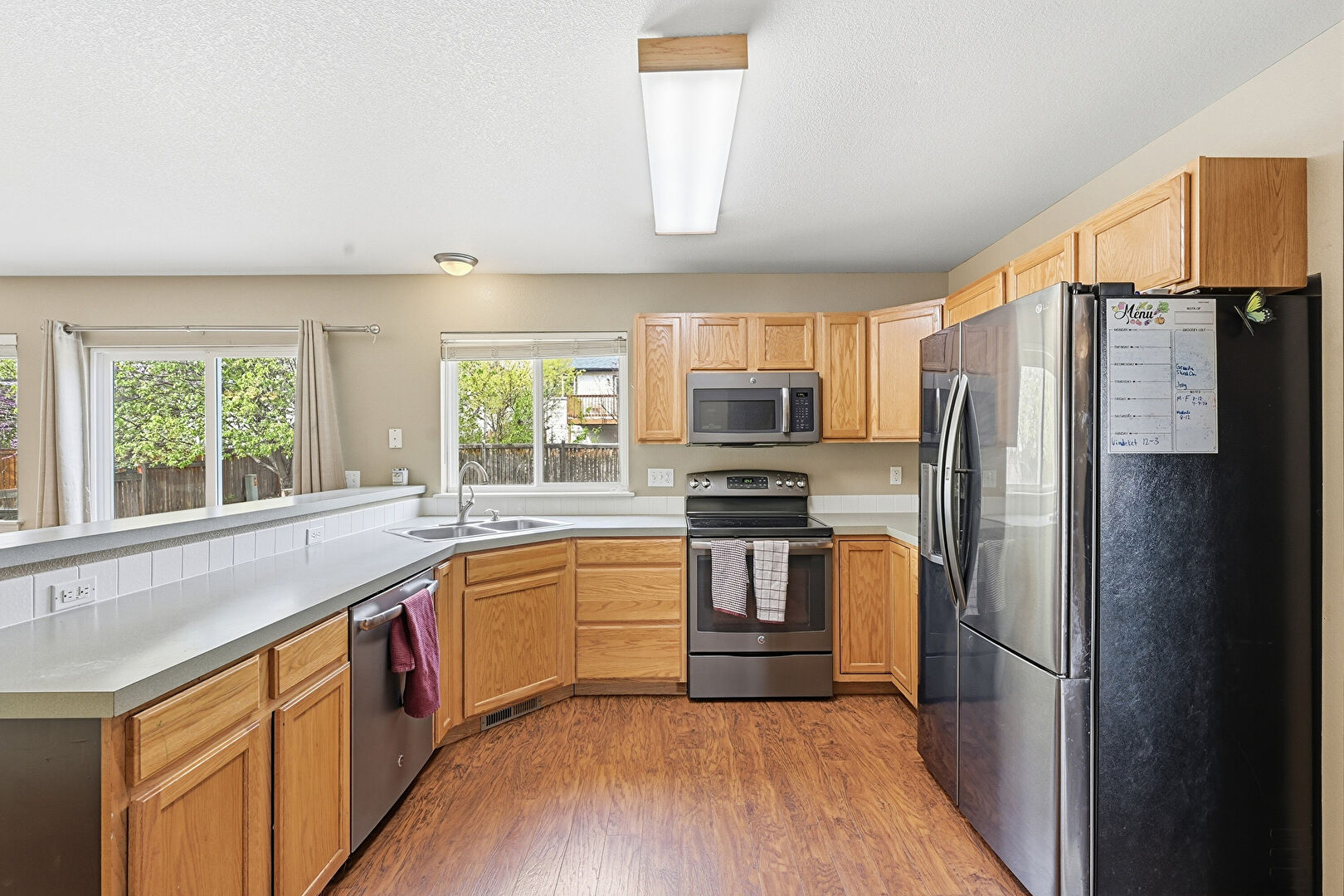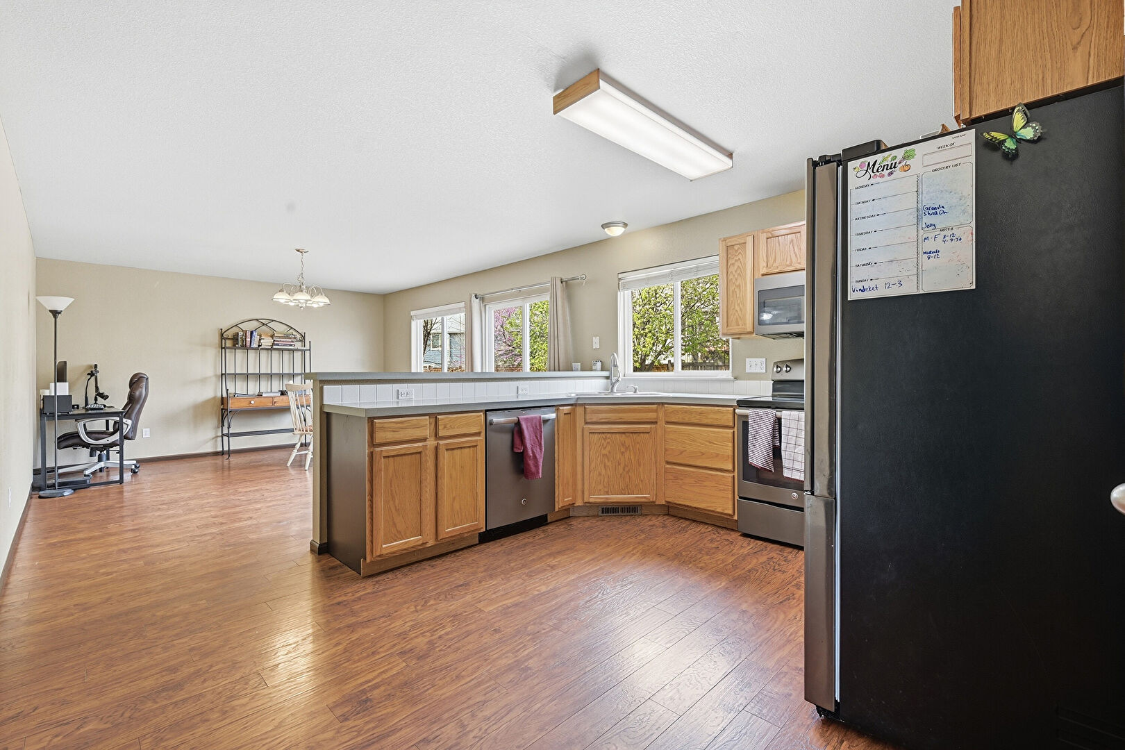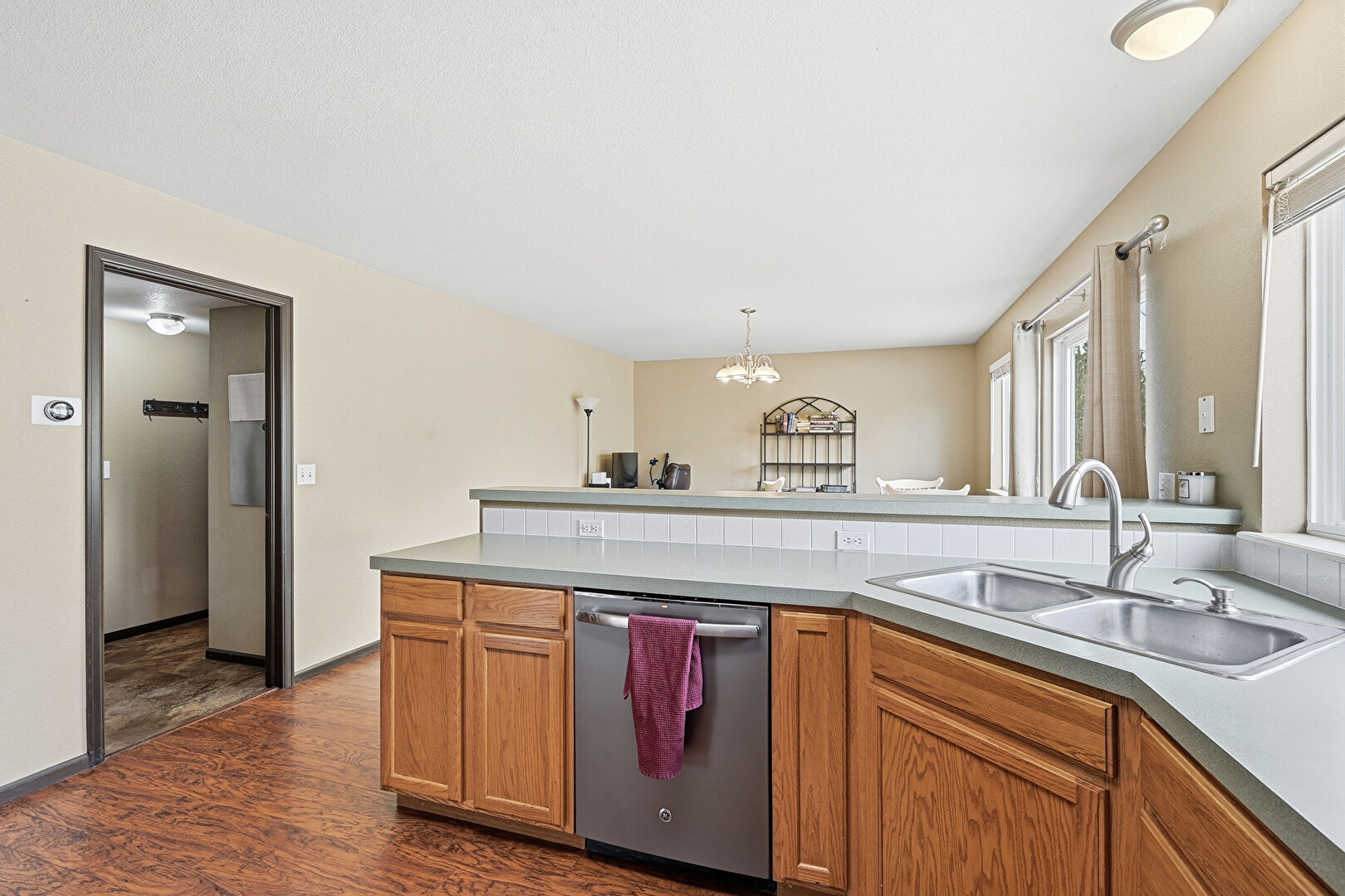 Baseboards Wall, Drywall, Kitchen Bar, Kitchen Peninsula, Medium Brown Cabinets, Natural Light, Notable Chandelier, Pendant Lighting, Shaker Cabinets, Textured Ceiling, U Shaped Kitchen, Vent, Wood Finish Floor, Baseboards Wall, Shaker Cabinets, Wood Finish Floor