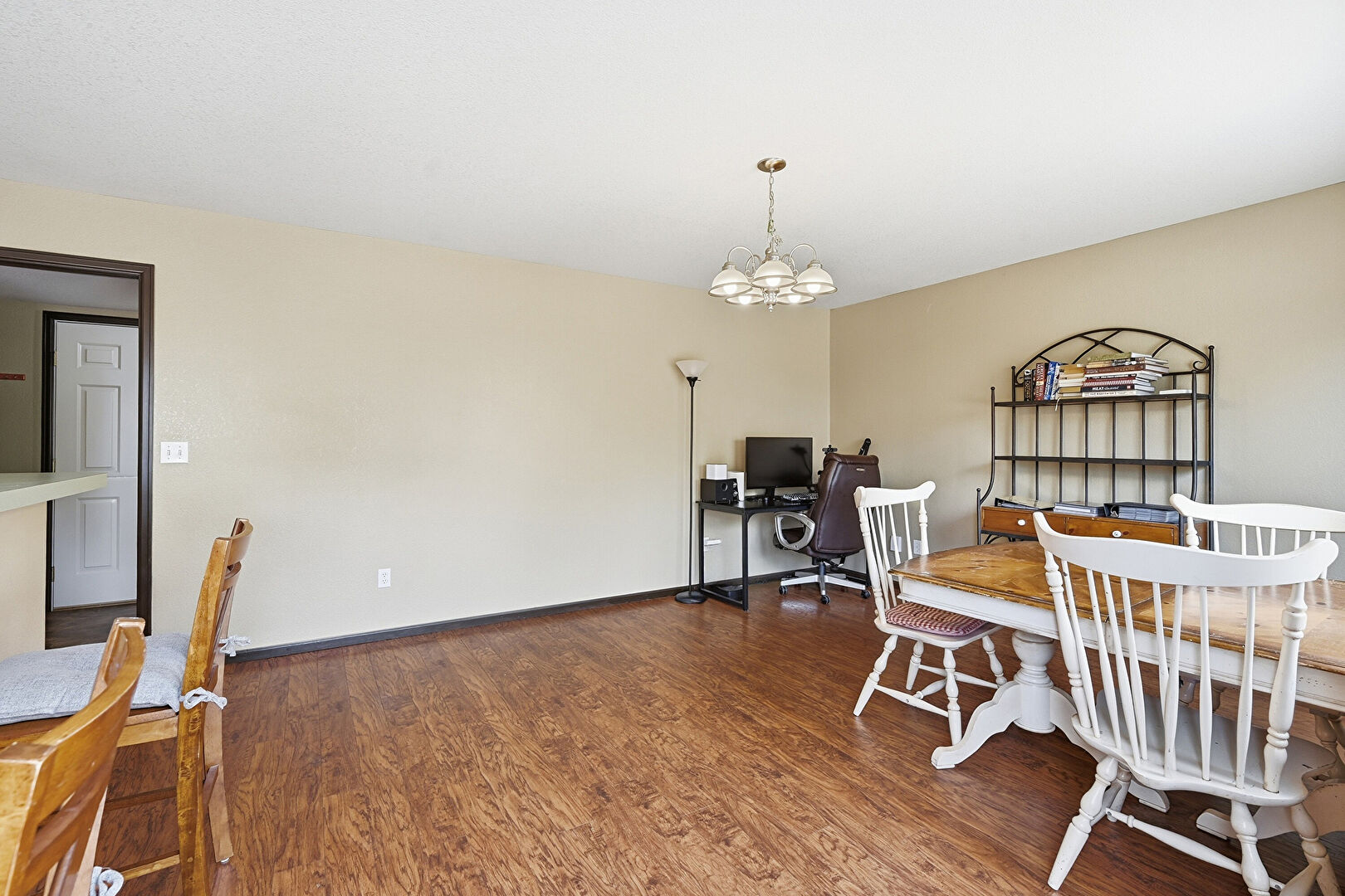 Baseboards Wall, Drywall, Natural Light, Notable Chandelier, Office Area, Vent, Wood Finish Floor, Baseboards Wall, Notable Chandelier