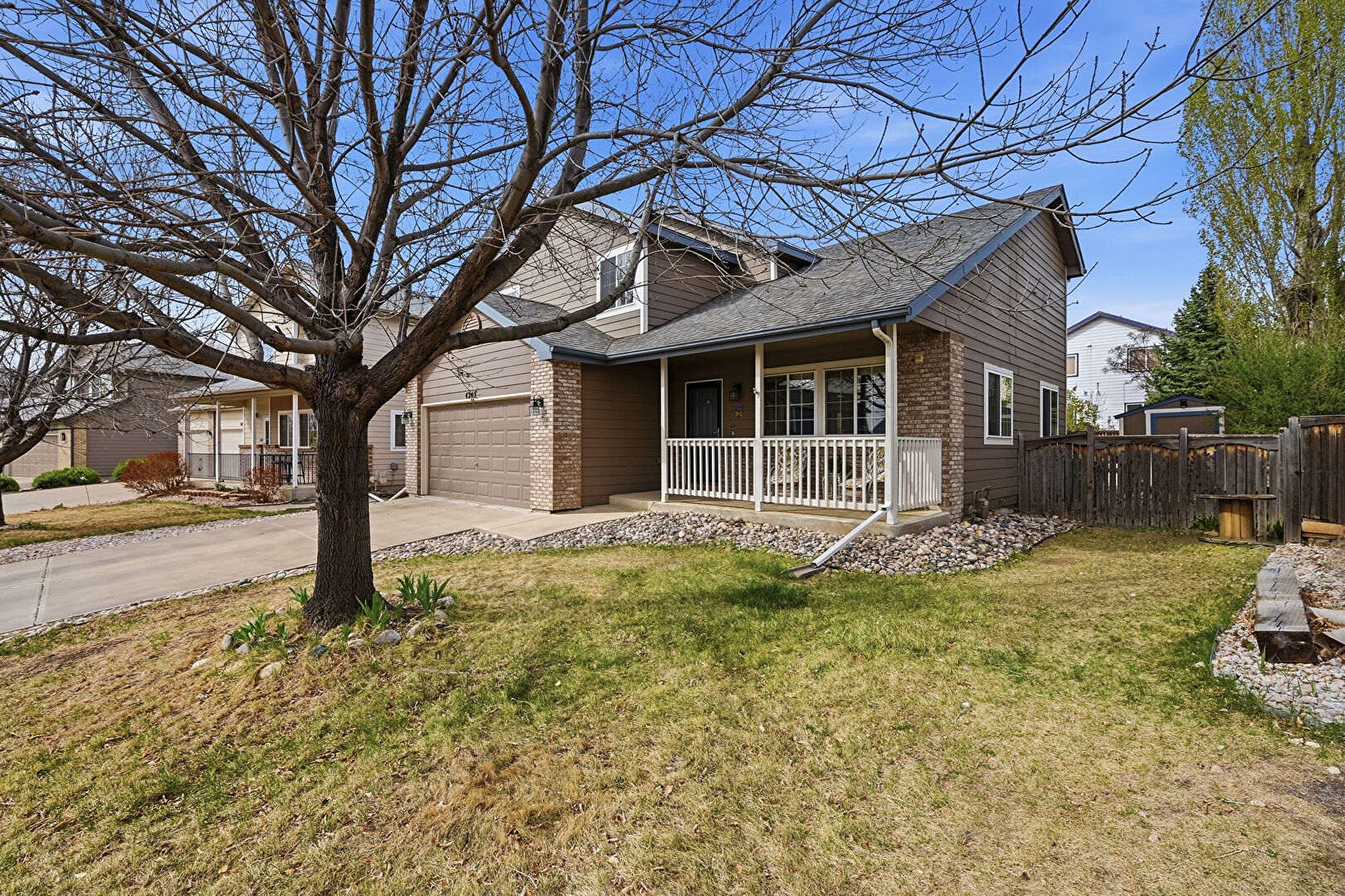 Brick Siding, Downspout, Driveway, Fence, Gutters, Horizontal Siding, Lawn, Porch, Shingle Roof, Concrete Foundation, Shingle Roof