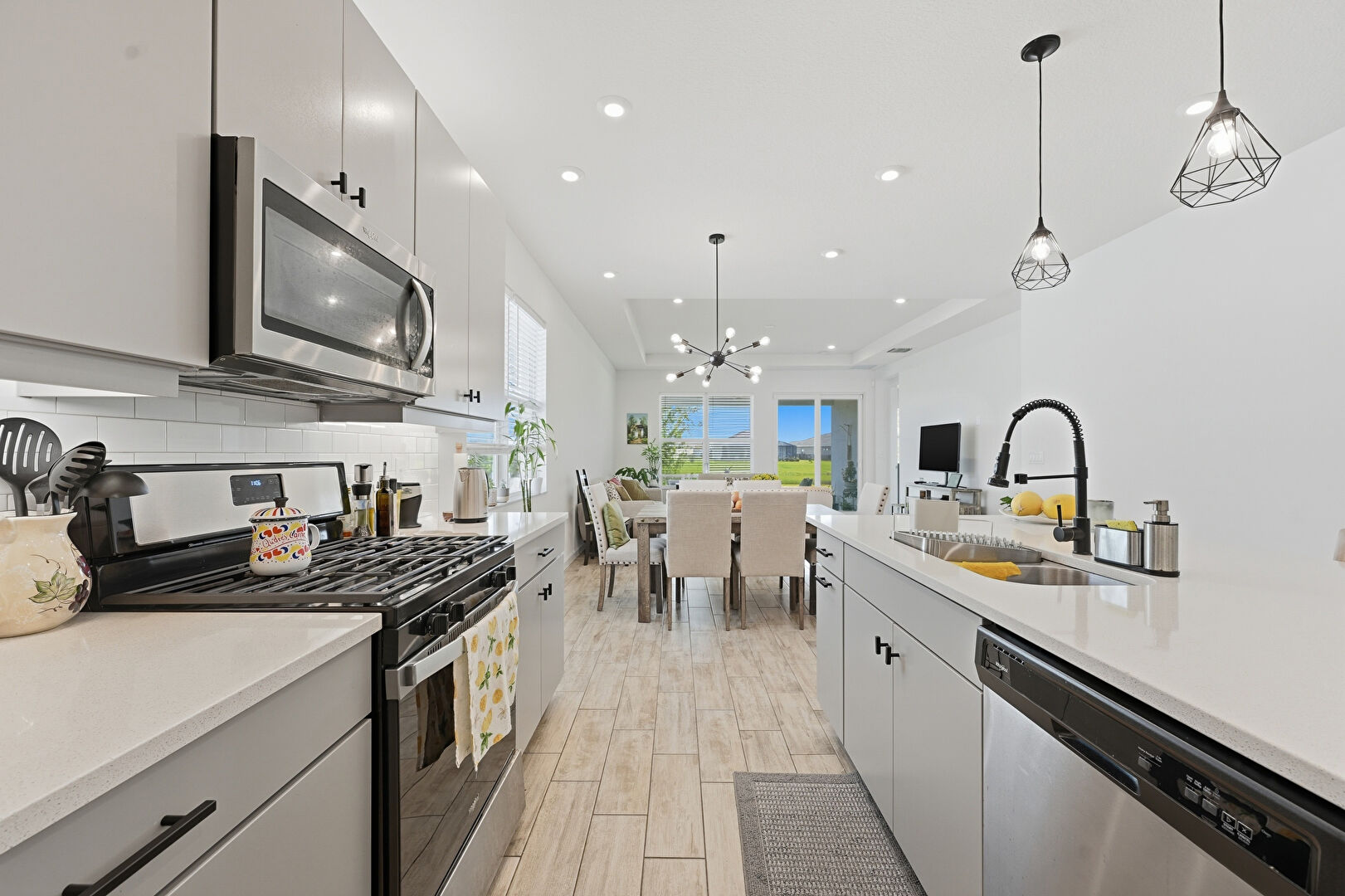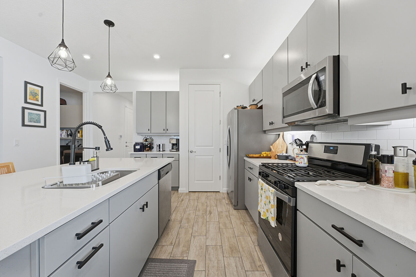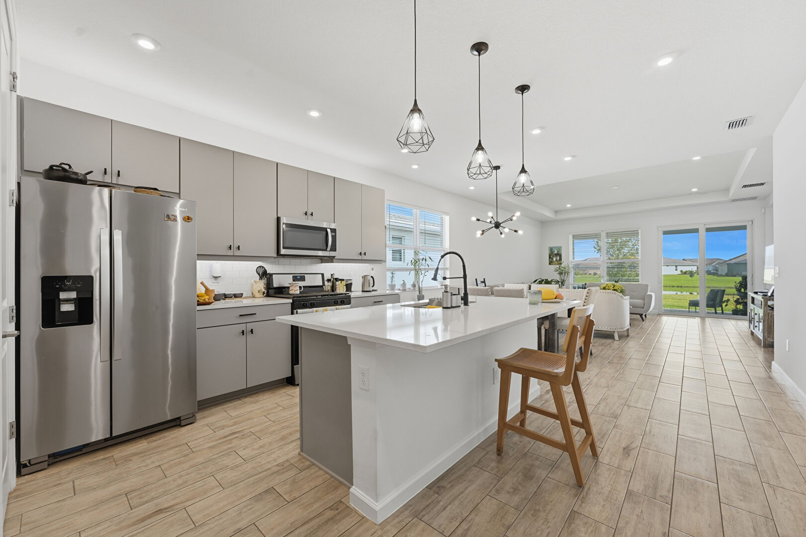 Baseboards Wall, Drywall, Flat Panel Cabinets, Gray Cabinets, Kitchen Bar, Kitchen Island, L Shaped Kitchen, Natural Light, Notable Chandelier, Opens To Living Area, Pendant Lighting, Recessed Lighting, Stone Countertops, Tray Ceiling, Vent, Wood Finish Floor, Drywall, Natural Light, Pendant Lighting, Stone Countertops