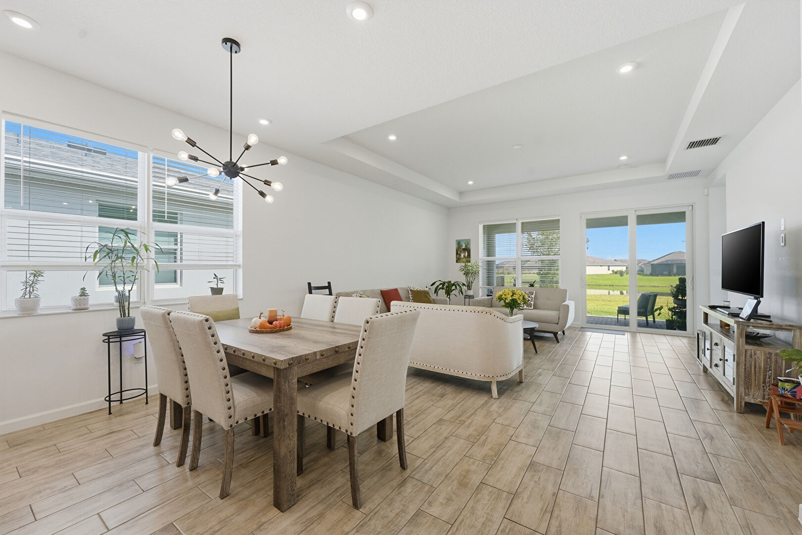 Baseboards Wall, Drywall, Notable Chandelier, Recessed Lighting, Tray Ceiling, Vent, Wood Finish Floor, Natural Light