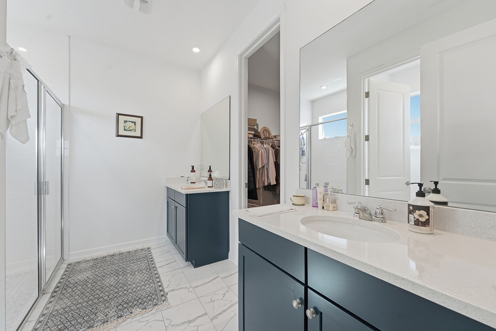 Baseboards Wall, Drywall, Full Bathroom, Marble Finish Floor, Natural Light, Recessed Lighting, Two Single Vanities, Vanity, Vent, Walk In Closet, Drywall, Full Bathroom