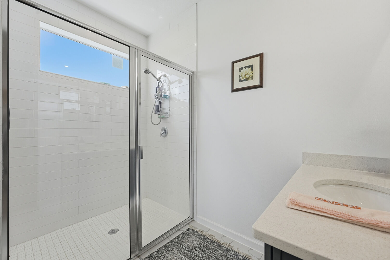 Combined Bath Shower, Drywall, Full Bathroom, Recessed Lighting, Vanity, Double Vanity, Natural Light