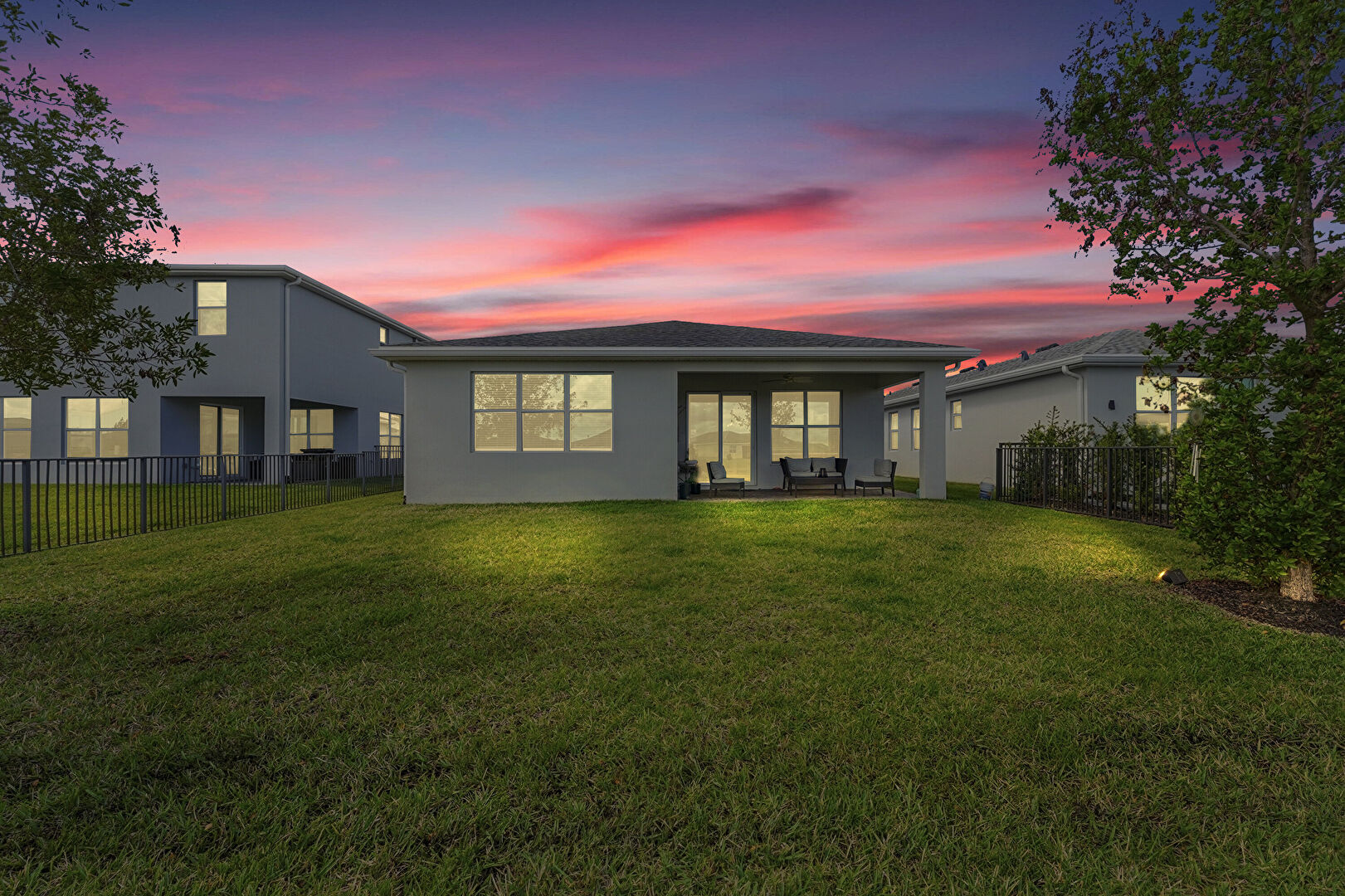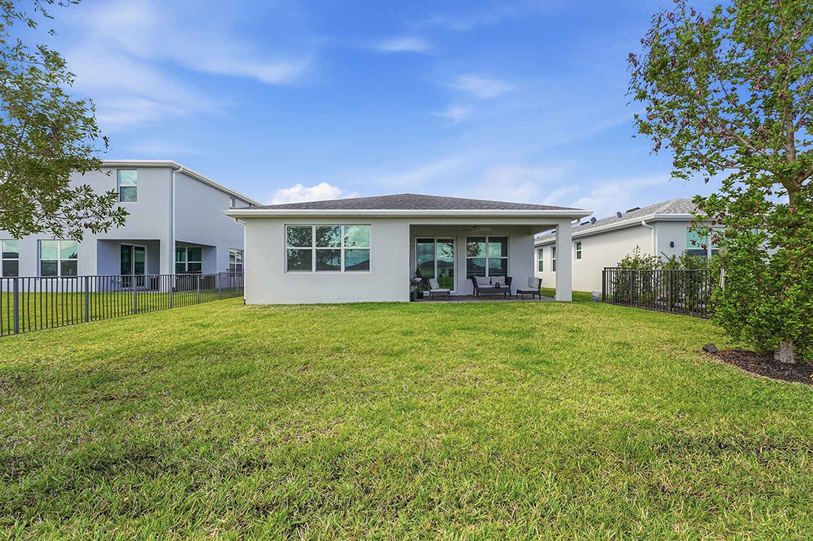Downspout, Fence, Gutters, Lawn, Patio, Stucco Siding