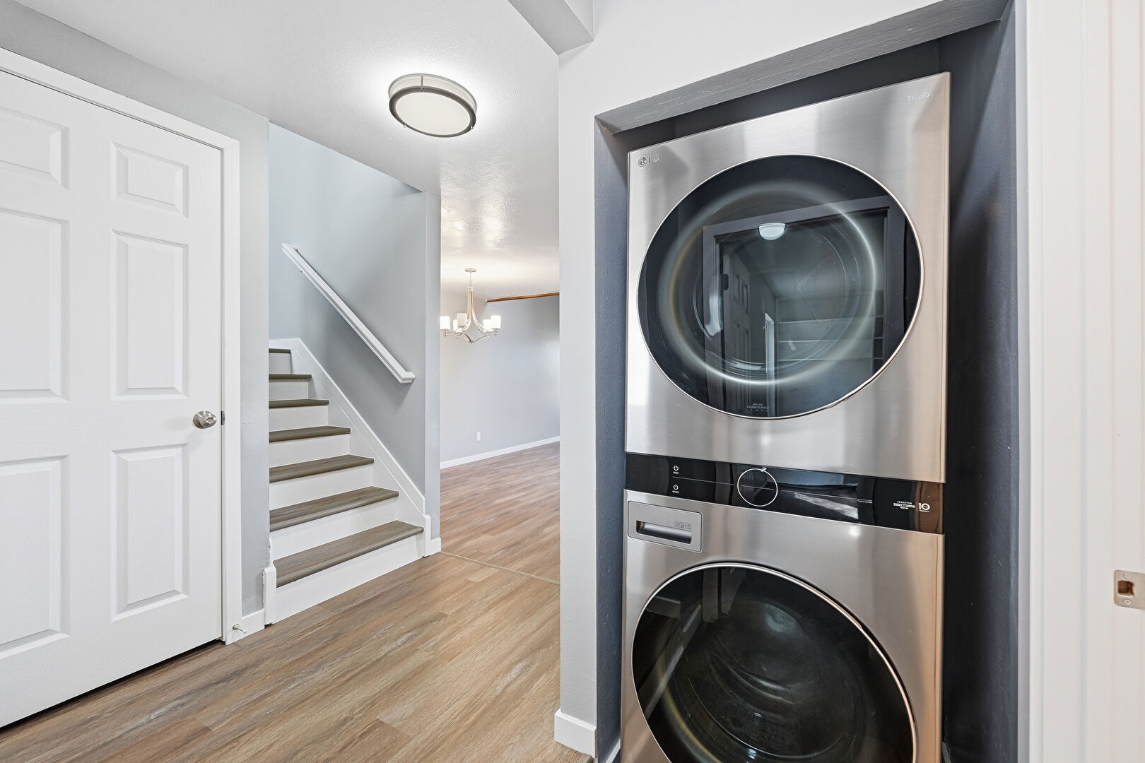 Baseboards Wall, Laundry, Notable Chandelier, Wood Finish Floor, Drywall