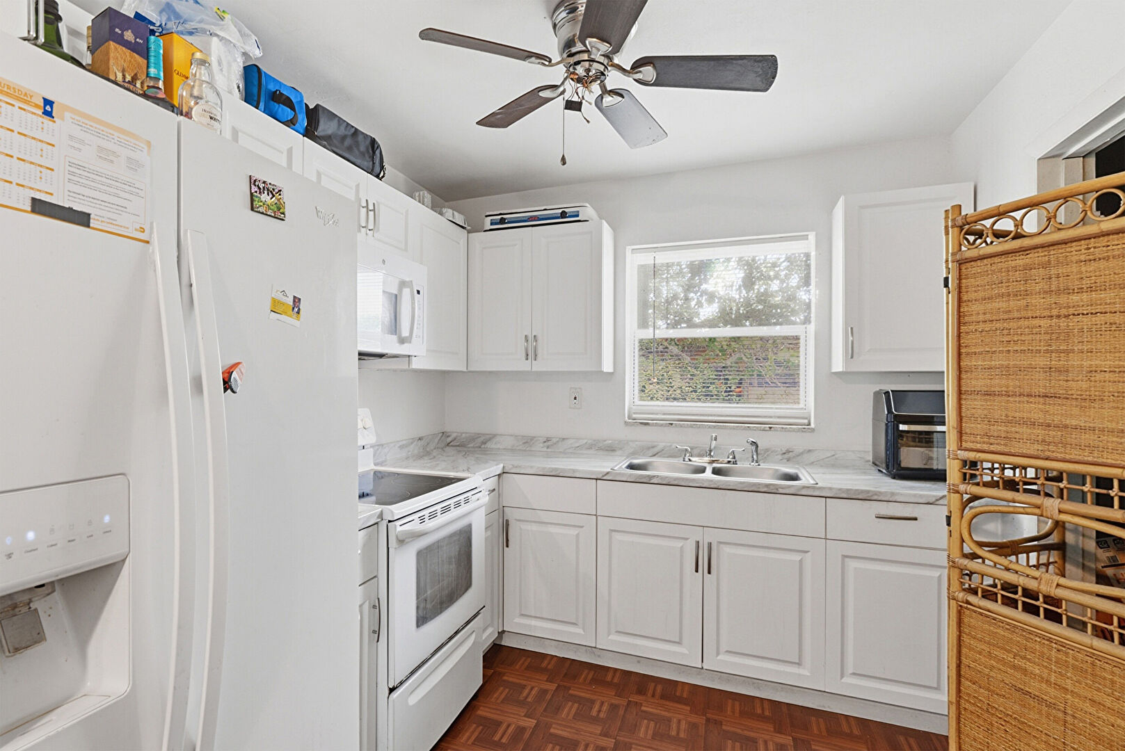 Ceiling Fan, Drywall, Raised Cabinets, Wood Finish Floor, Natural Light