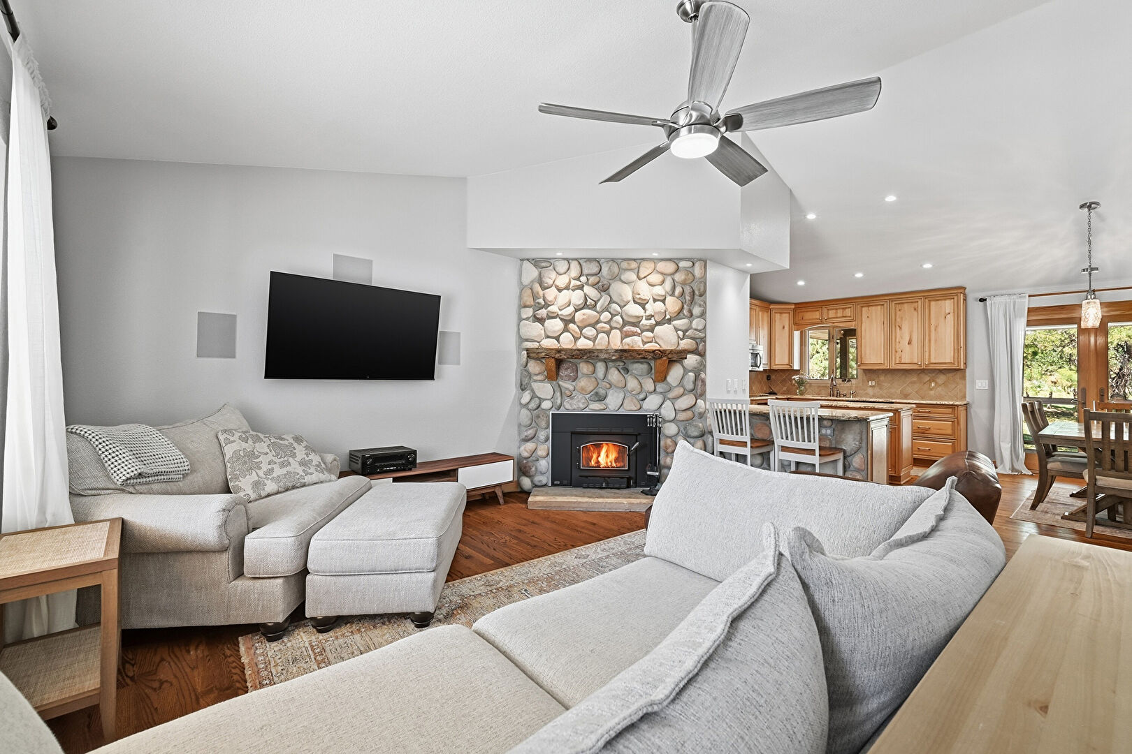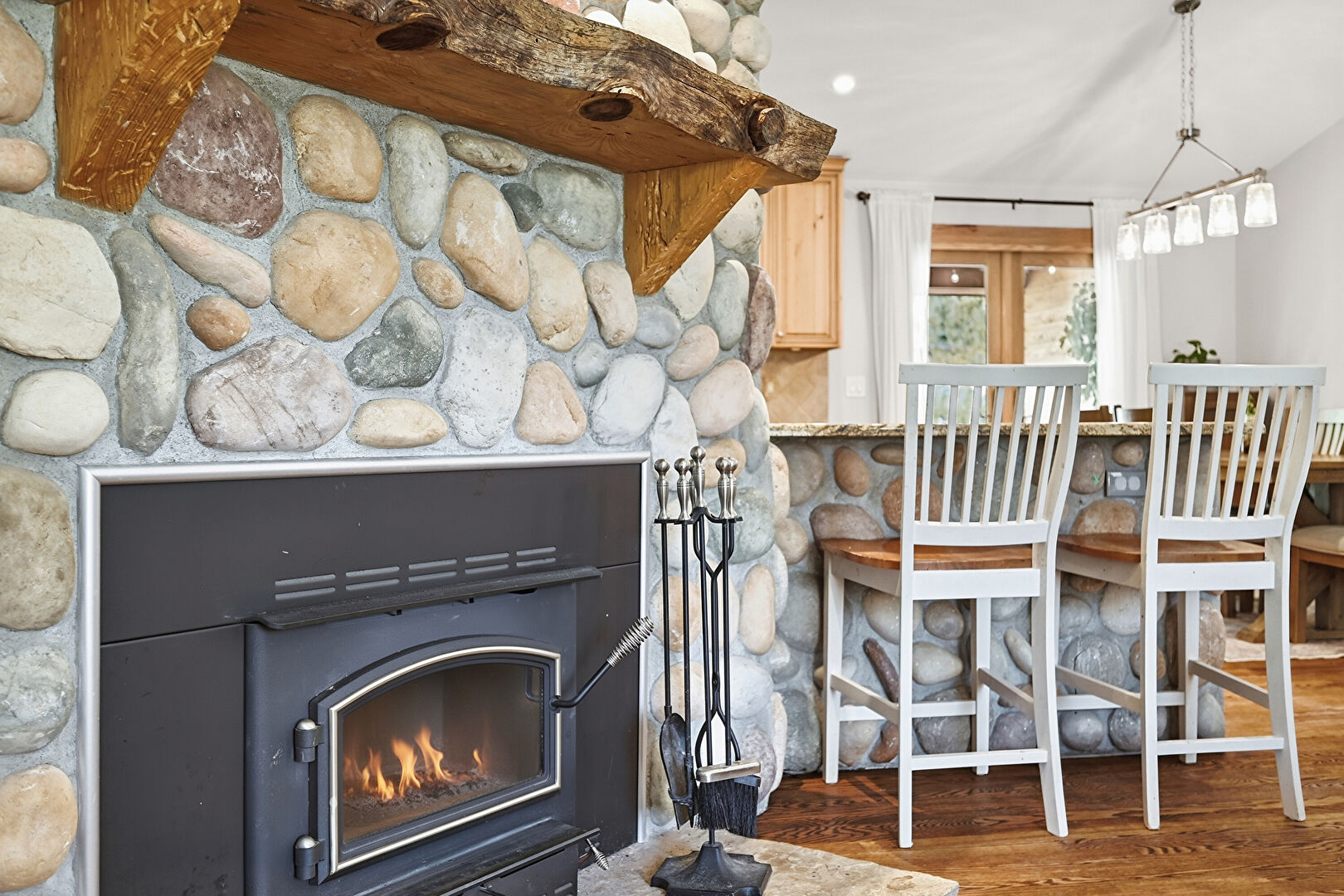 Drywall, Fireplace, Full Bathroom, Kitchen Bar, Kitchen Peninsula, Natural Light, Pendant Lighting, Raised Cabinets, Stone Countertops, Wood Finish Floor, Baseboards Wall, Drywall, Textured Wall