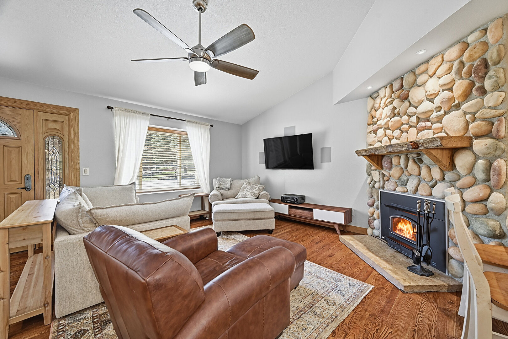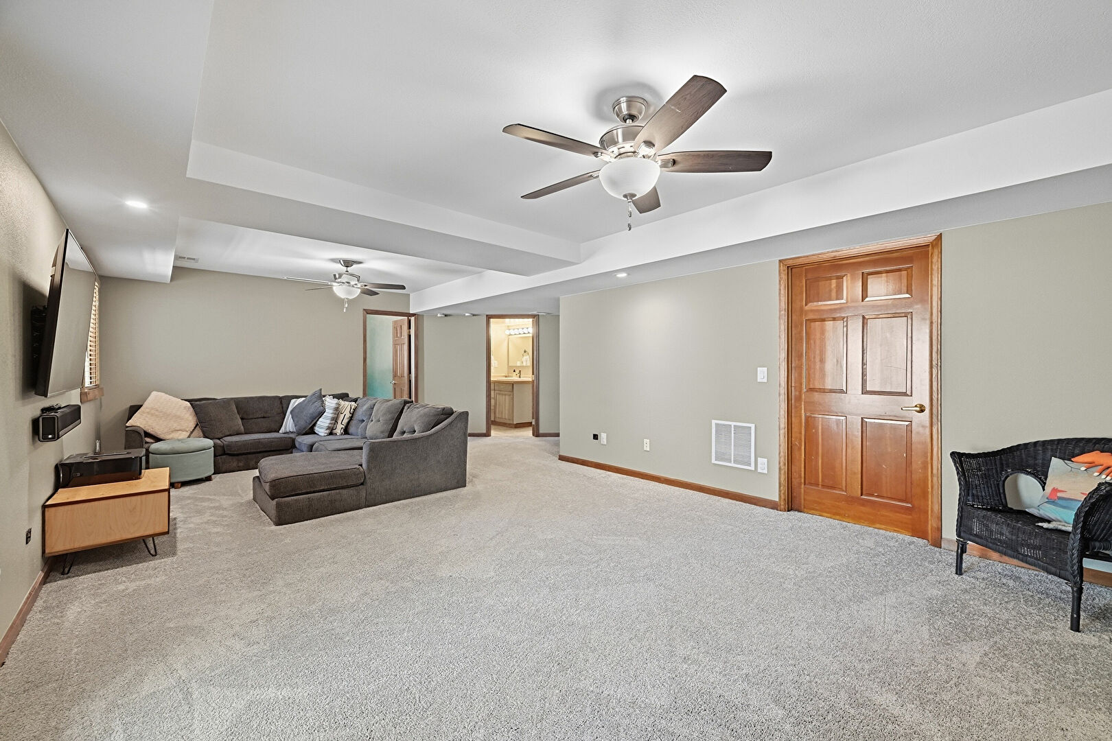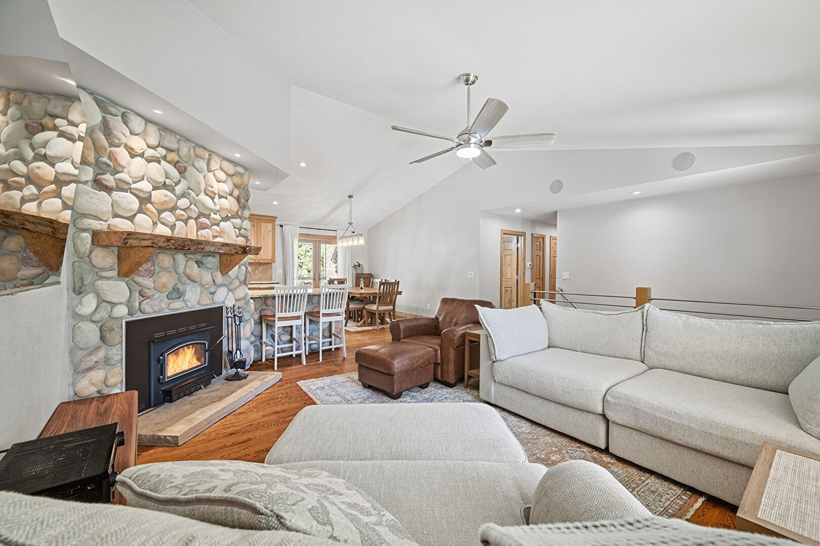 Baseboards Wall, Carpet, Cathedral Ceiling, Ceiling Fan, Drywall, Fireplace, High Ceiling, Natural Light, Recessed Lighting, Stone Wall, Vaulted Ceiling, Vent, Wood Finish Floor, Drywall, Recessed Lighting, Tray Ceiling, Vent, Wood Finish Floor