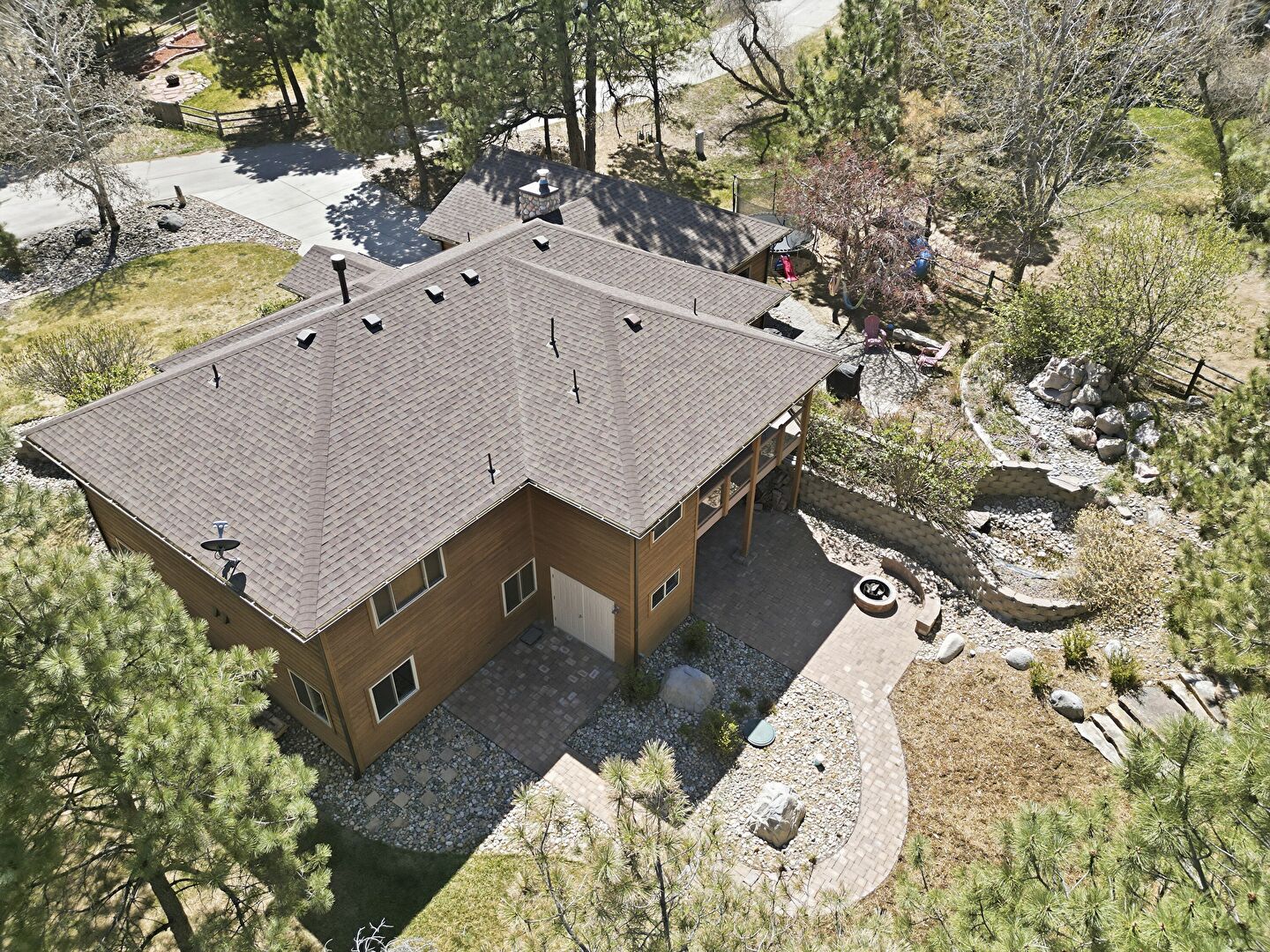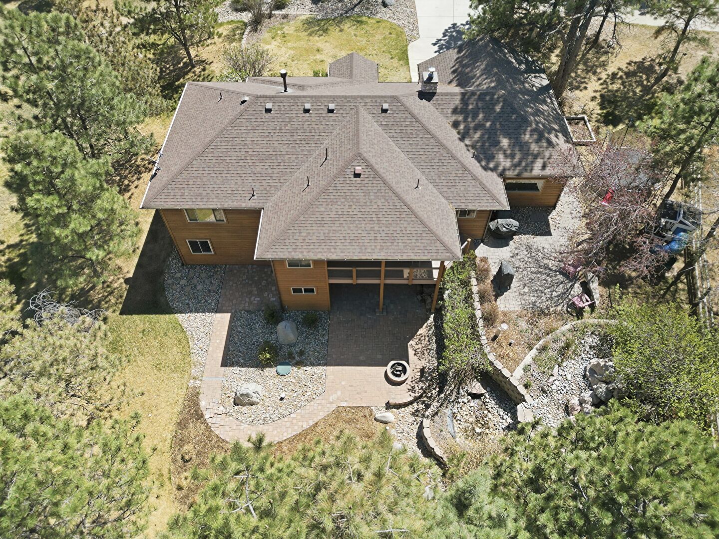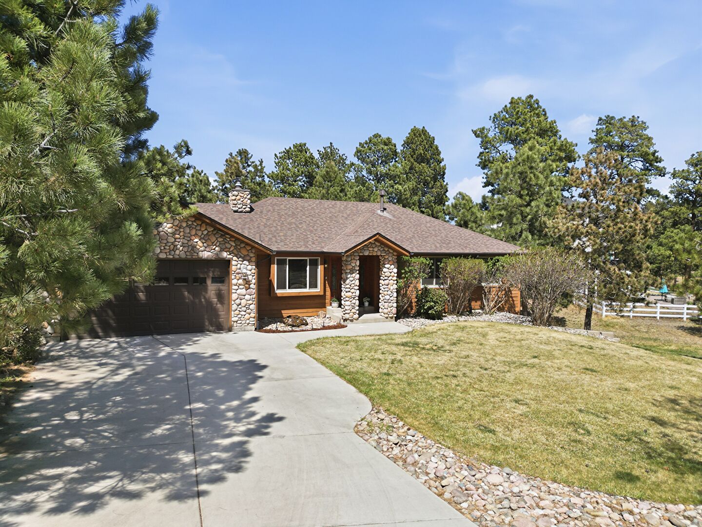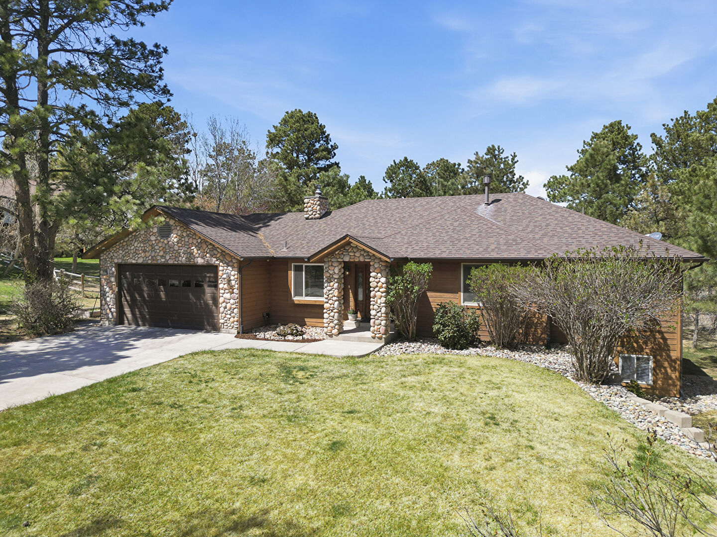 Chimney, Driveway, Shingle Roof, Stone Siding, Lawn