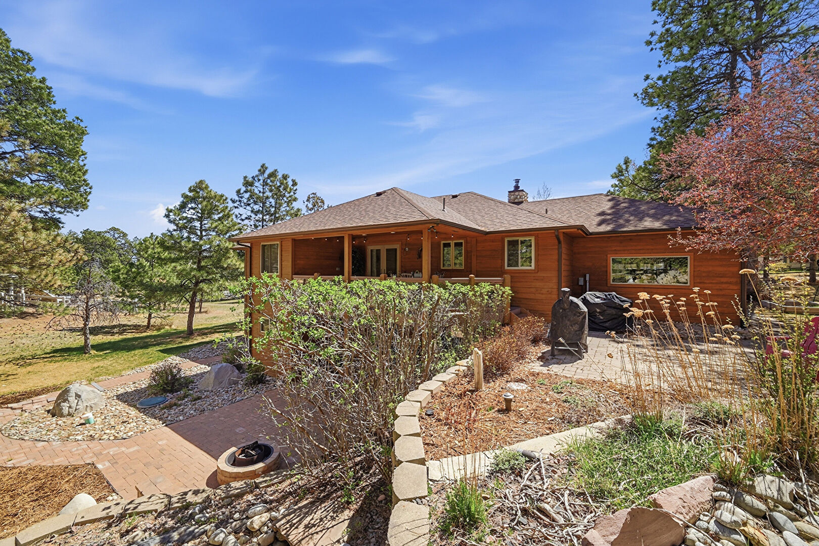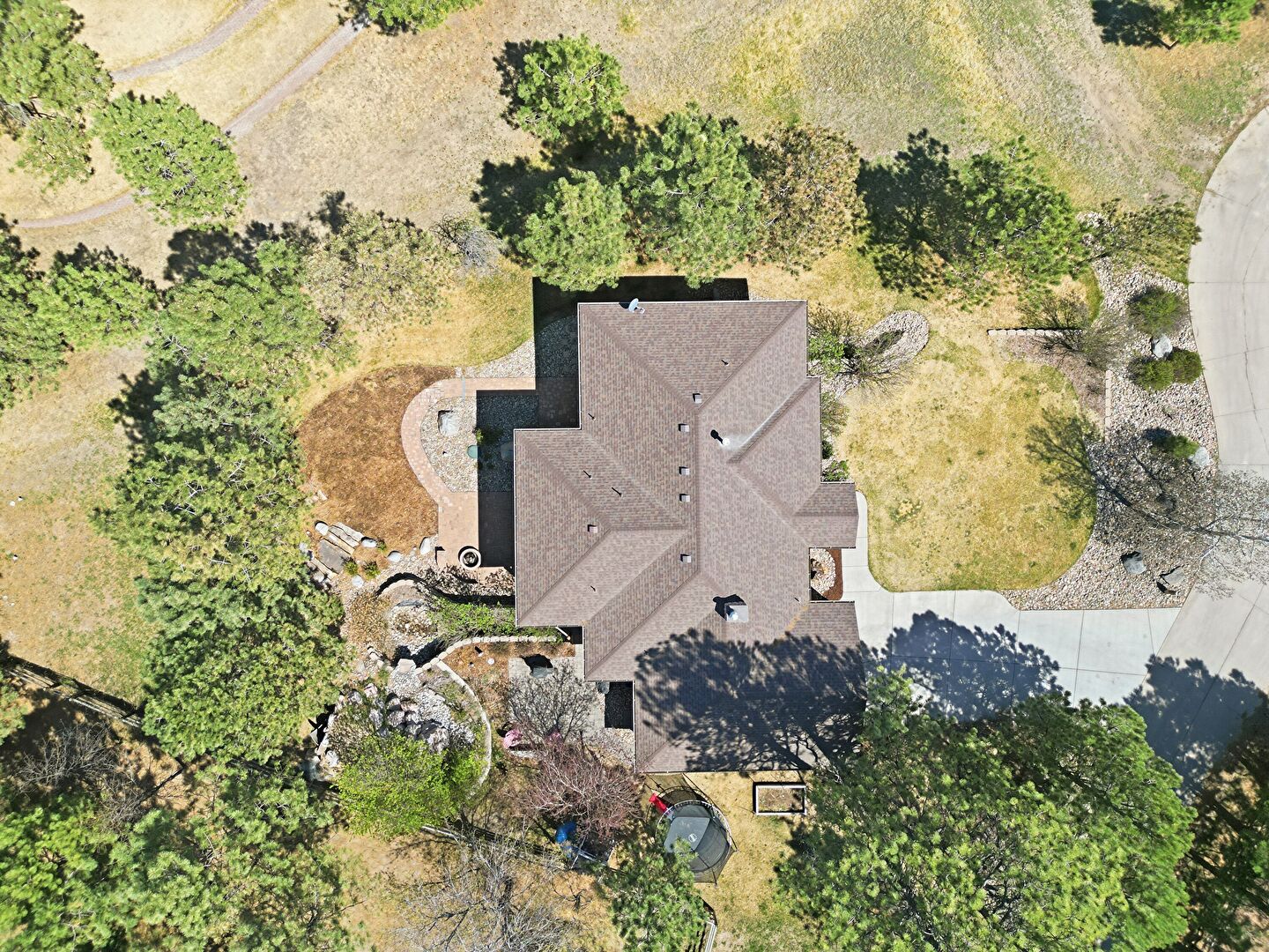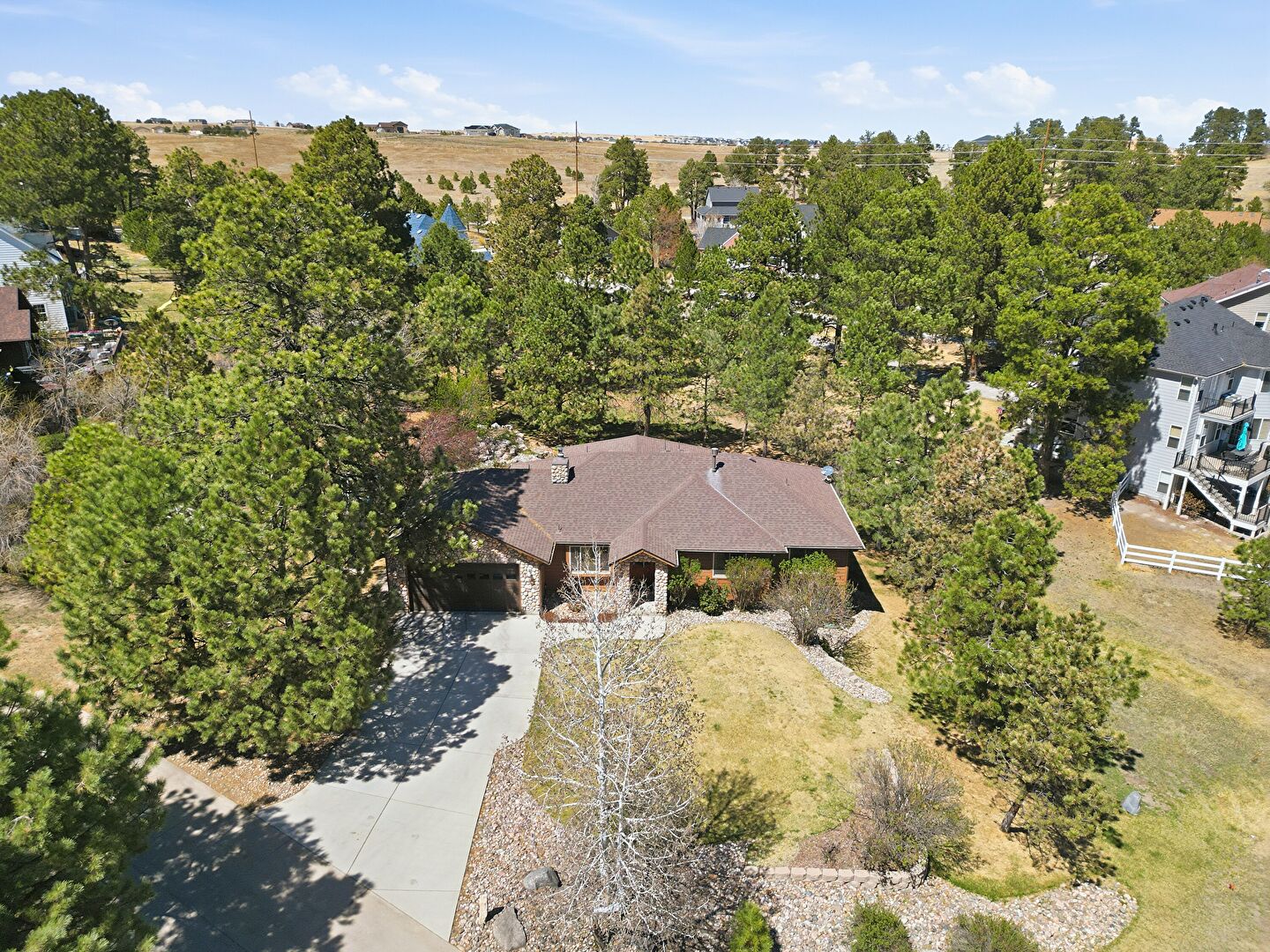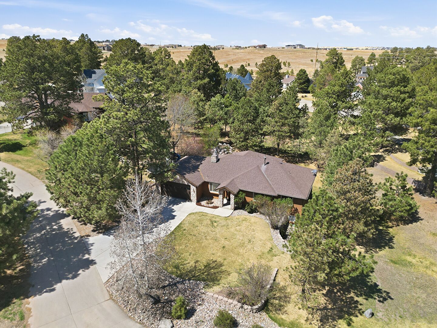 Chimney, Driveway, Shingle Roof, Stone Siding, Lawn