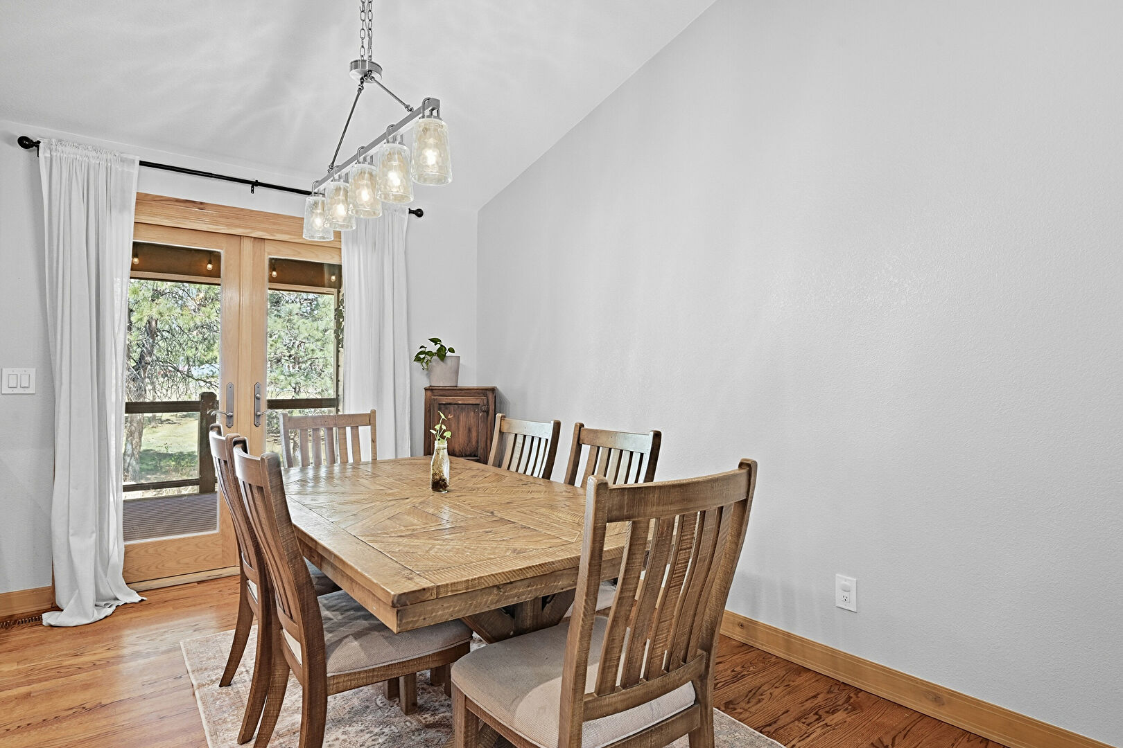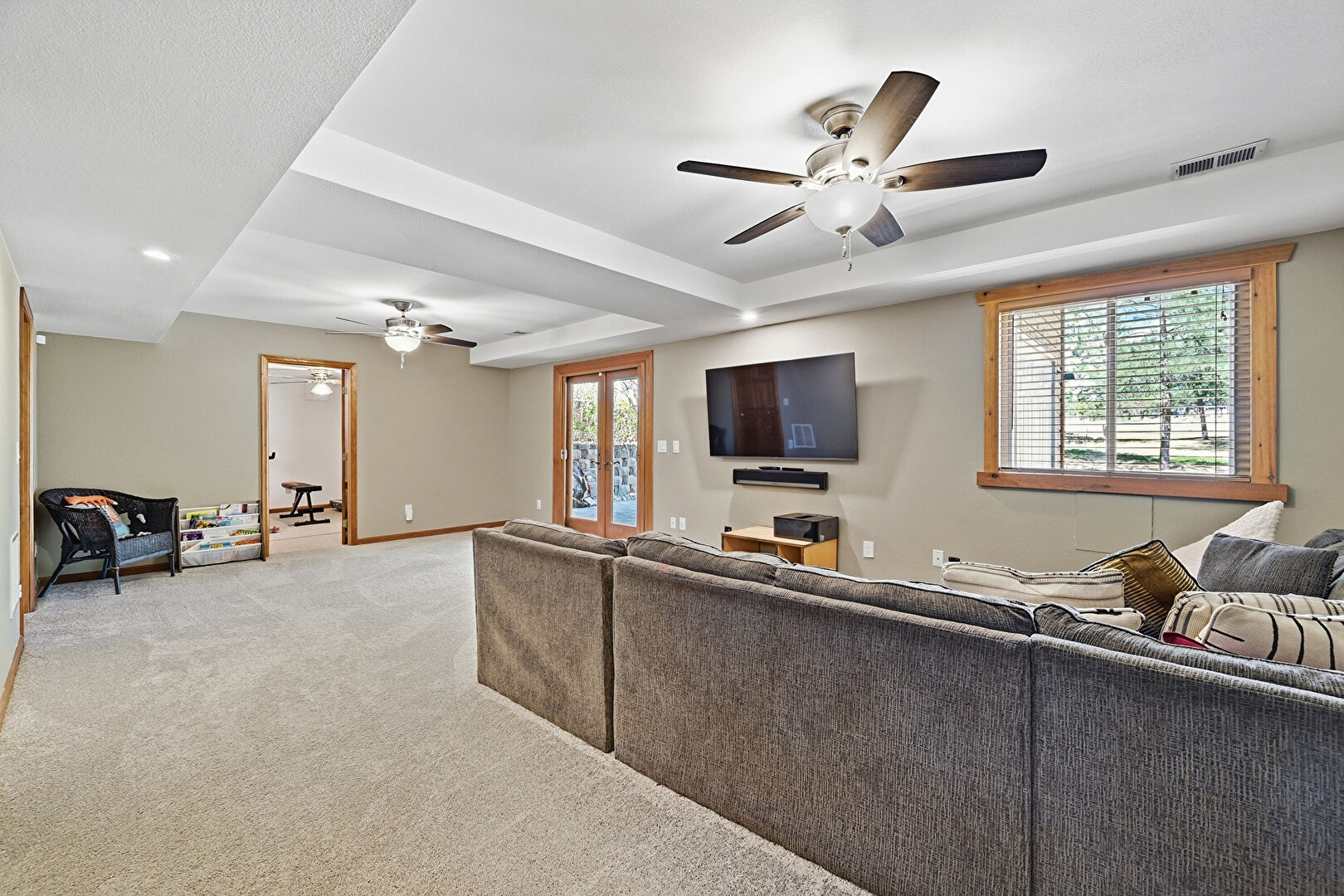 Baseboards Wall, Drywall, French Doors, Natural Light, Notable Chandelier, Recessed Lighting, Vaulted Ceiling, Wood Finish Floor, Baseboards Wall, Ceiling Fan, French Doors
