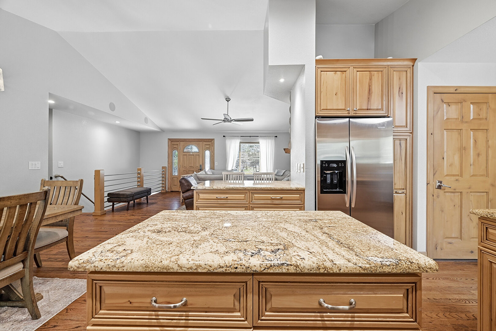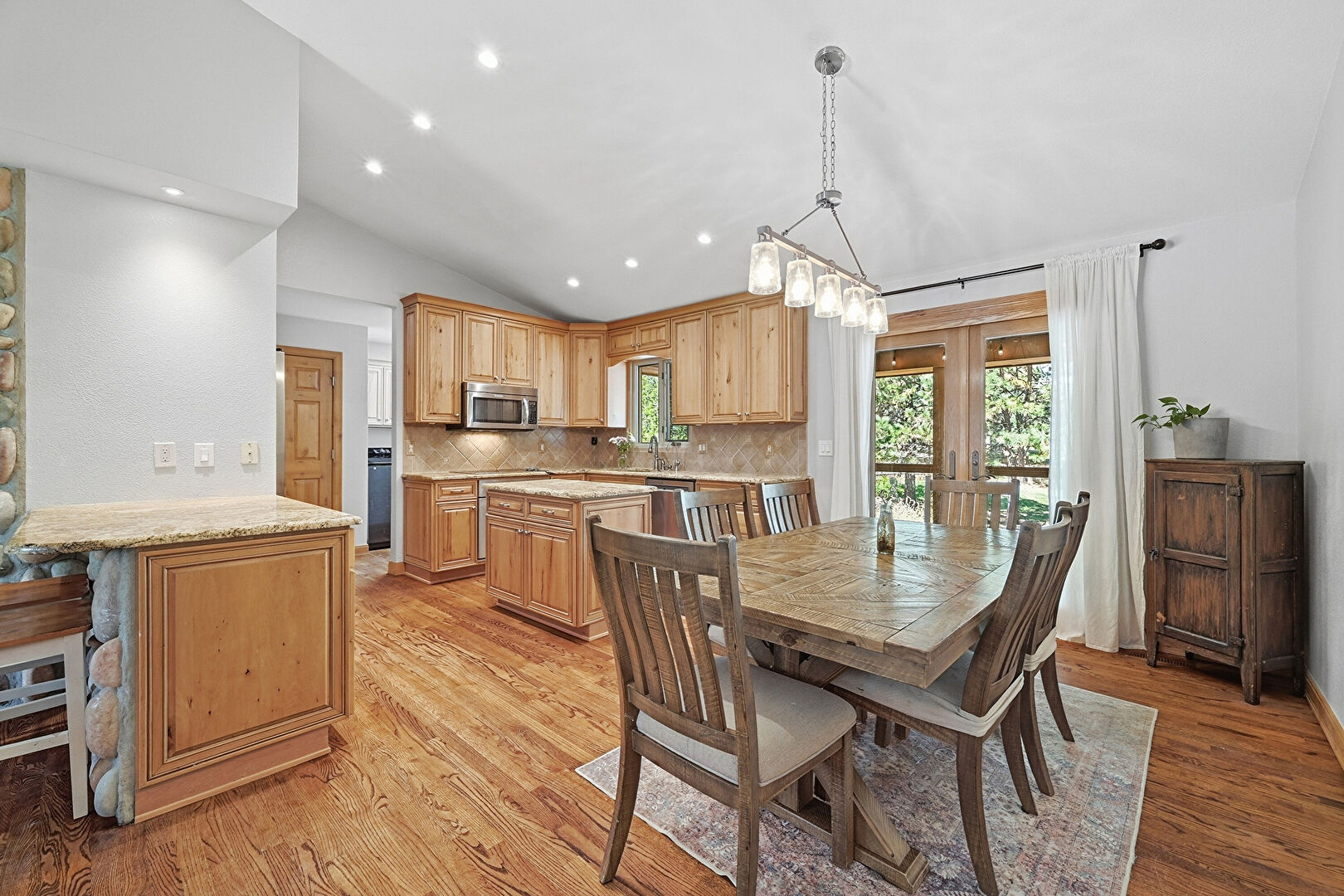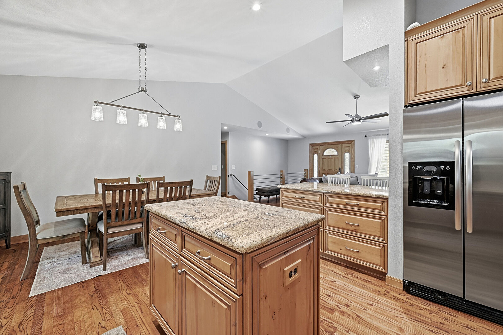 Baseboards Wall, Cathedral Ceiling, Ceiling Fan, Crown Molding Cabinets, Drywall, High Ceiling, Kitchen Island, Medium Brown Cabinets, Natural Light, Notable Chandelier, Opens To Living Area, Pendant Lighting, Raised Cabinets, Recessed Lighting, Stone Countertops, Vaulted Ceiling, Wood Finish Floor, Recessed Lighting, Stone Countertops, Vaulted Ceiling