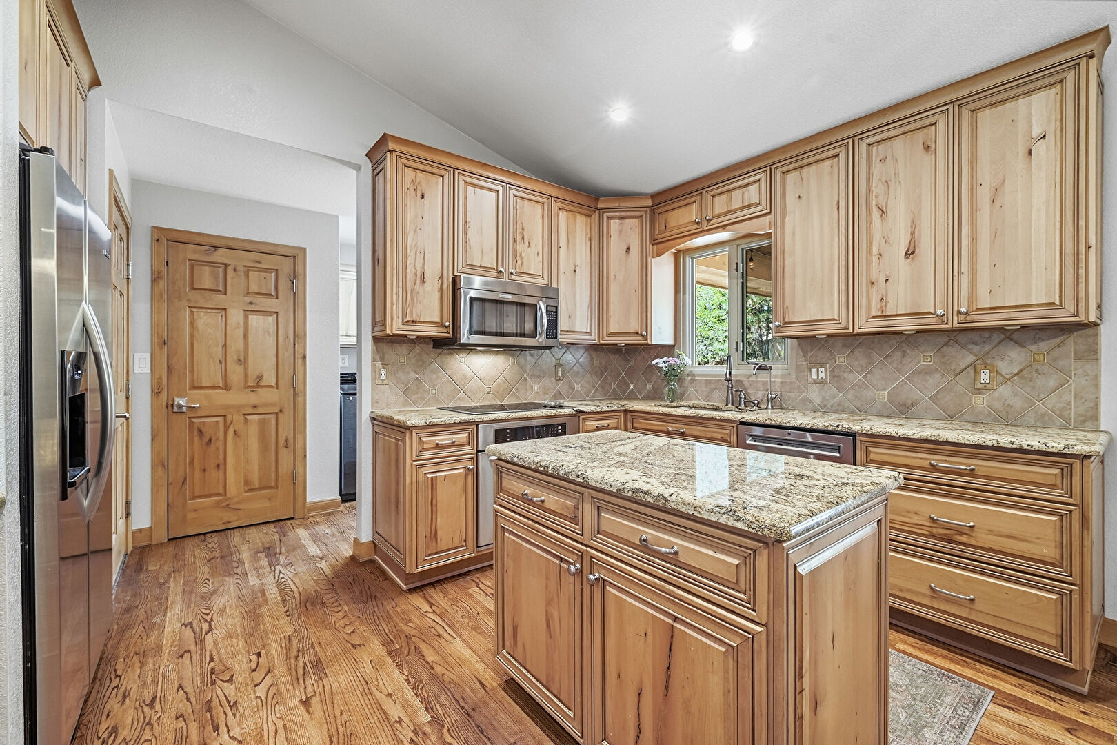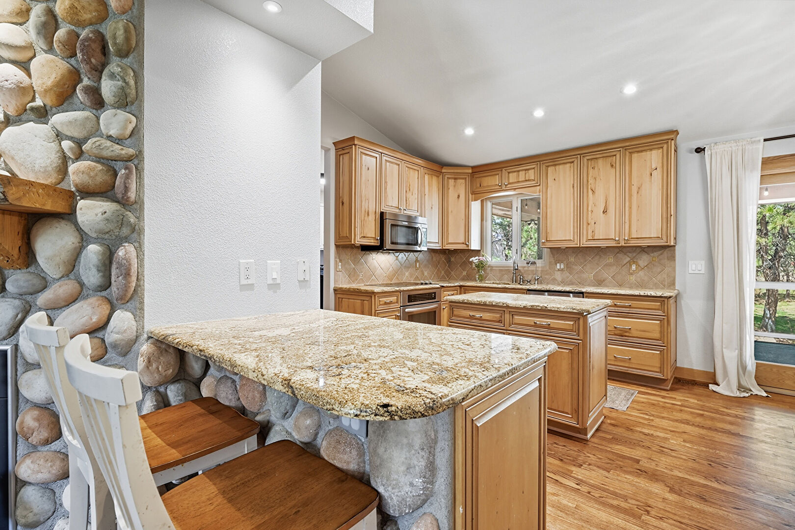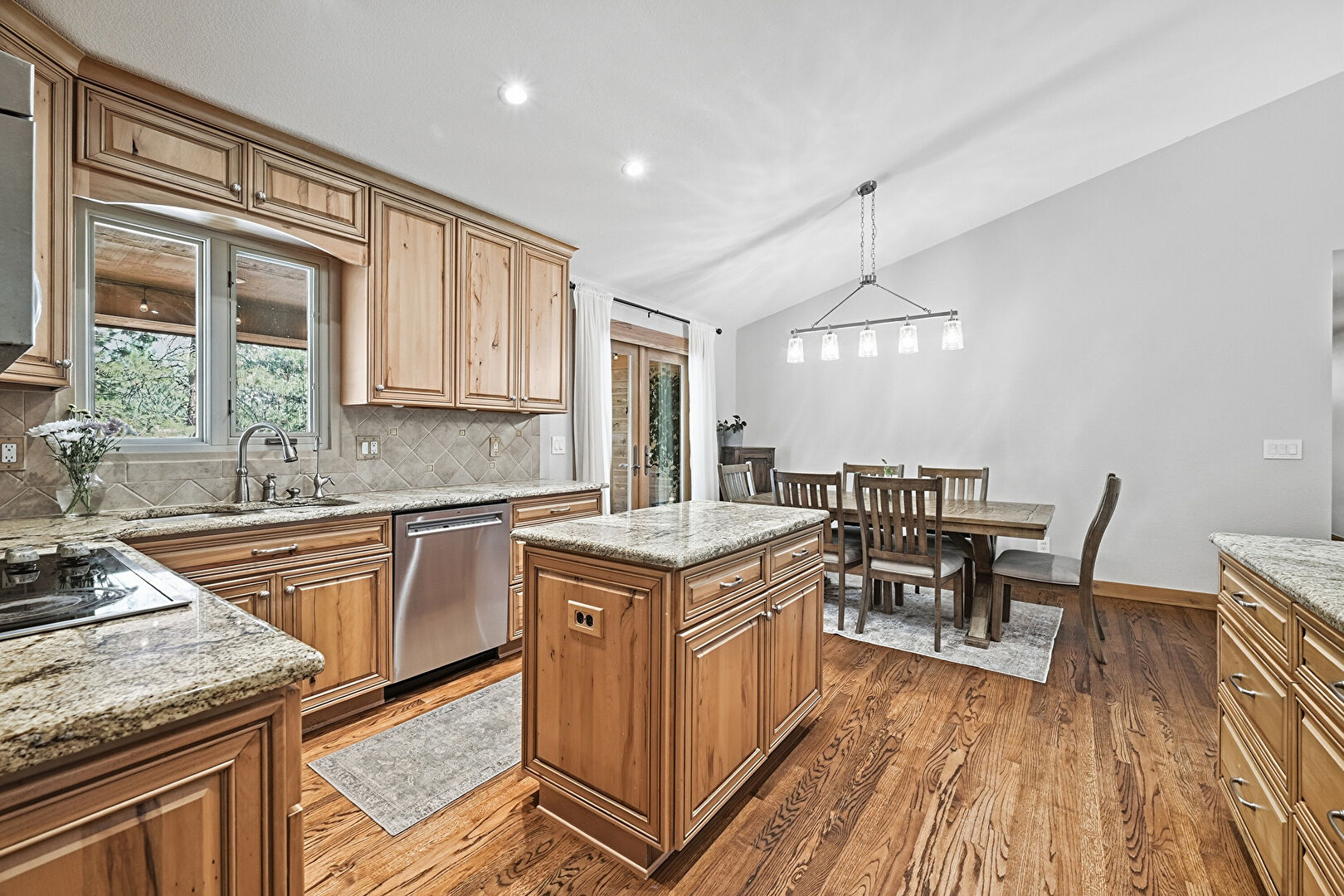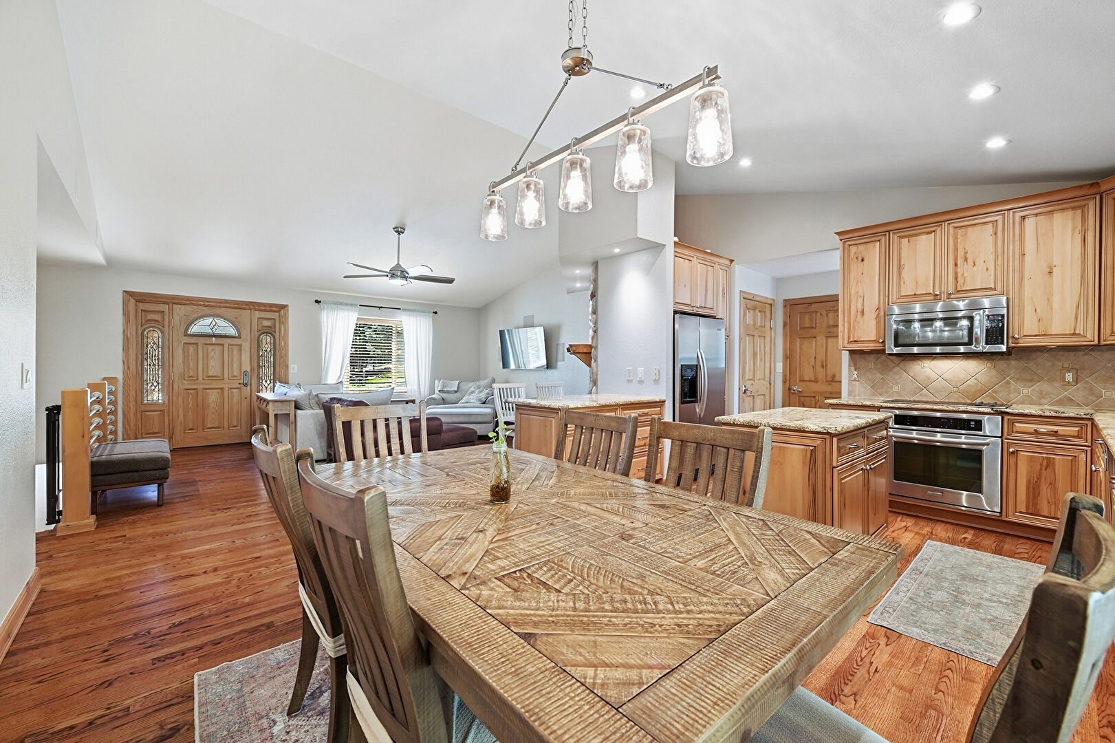 Baseboards Wall, Cathedral Ceiling, Ceiling Fan, Crown Molding Cabinets, Drywall, High Ceiling, Kitchen Island, Medium Brown Cabinets, Natural Light, Notable Chandelier, Opens To Living Area, Pendant Lighting, Raised Cabinets, Recessed Lighting, Stone Countertops, Vaulted Ceiling, Wood Finish Floor, Recessed Lighting, Stone Countertops, Vaulted Ceiling