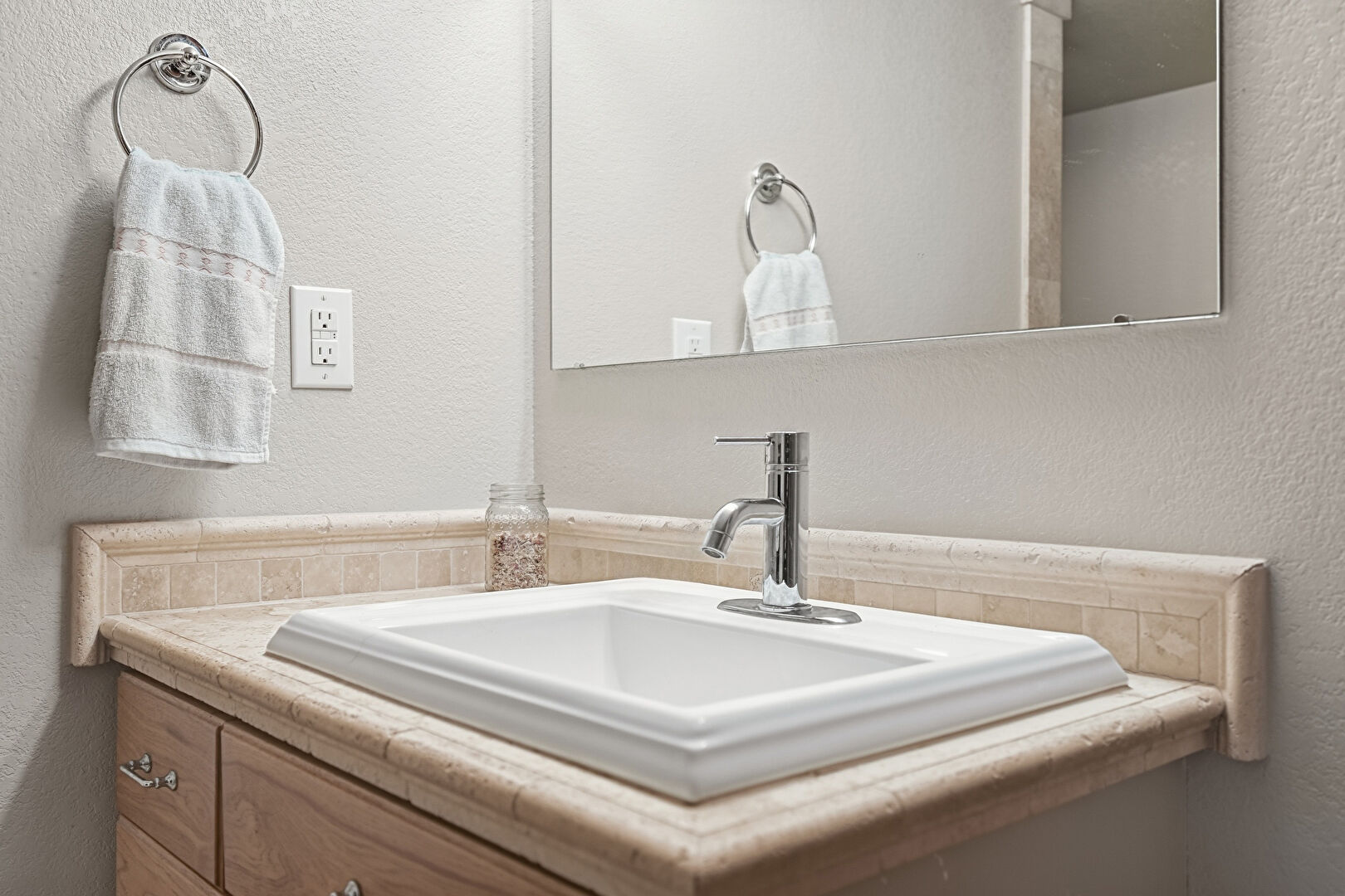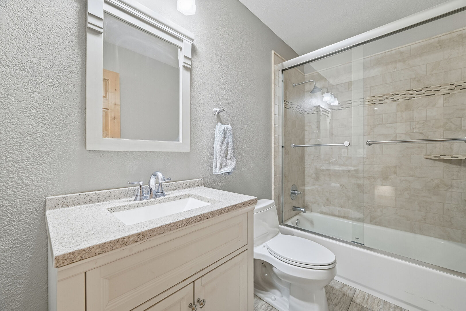 Baseboards Wall, Combined Bath Shower, Full Bathroom, Textured Ceiling, Tile Floor, Vanity, Textured Wall