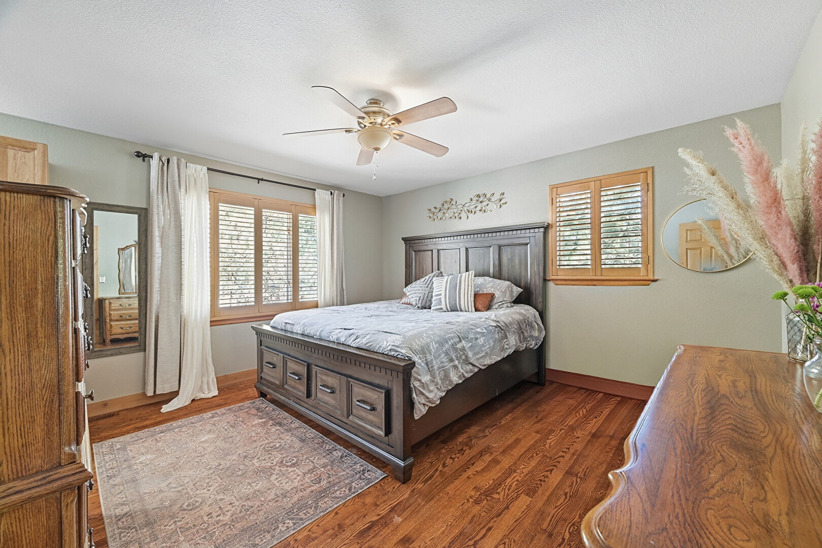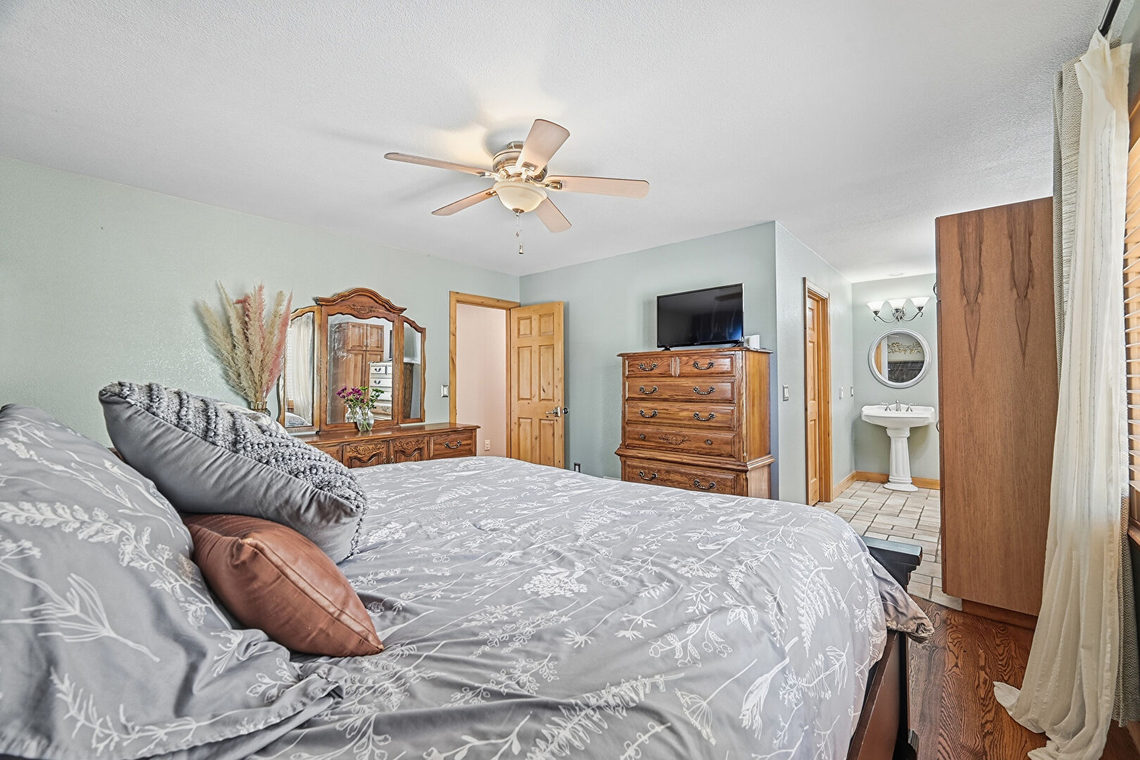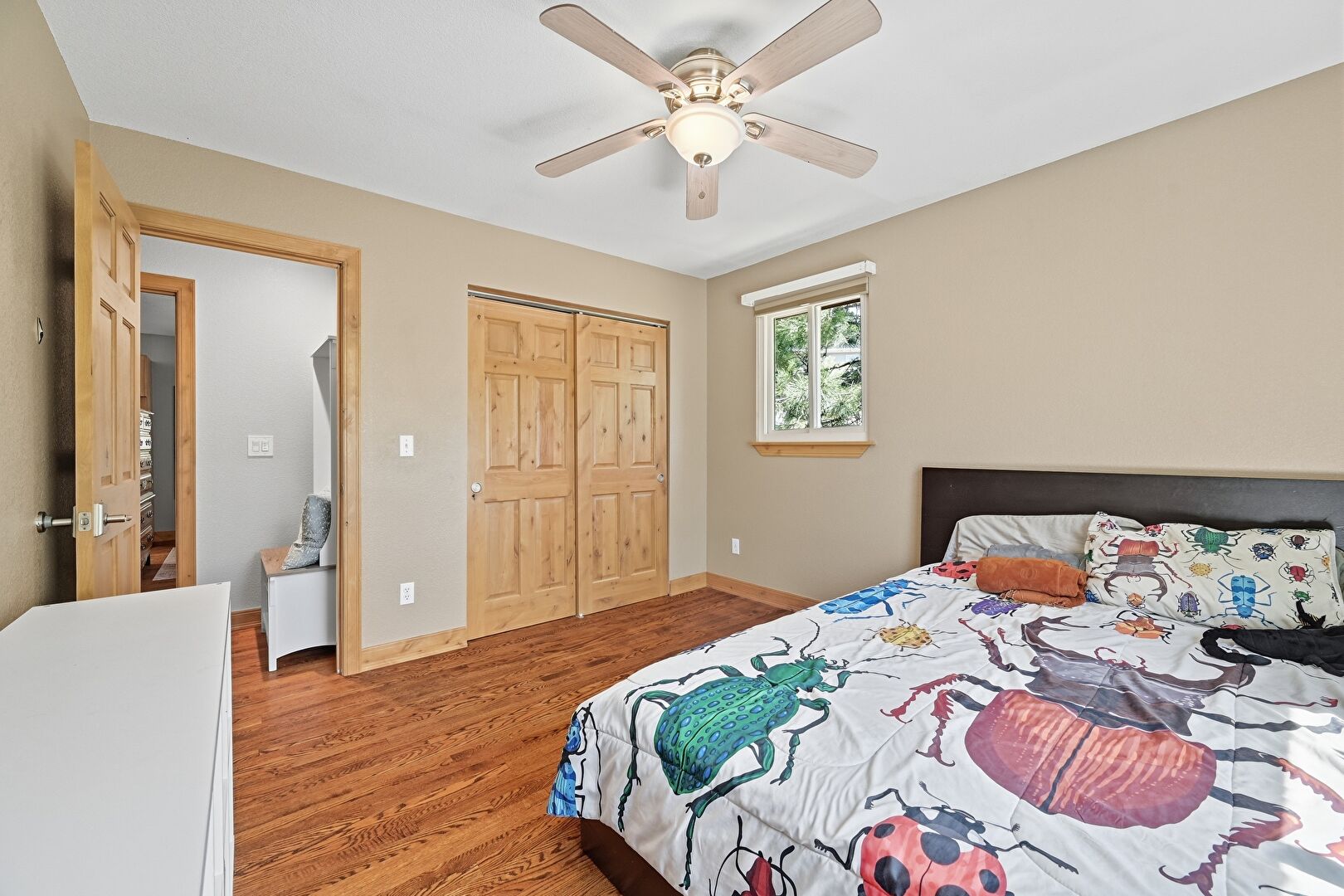 Ceiling Fan, Closet, Drywall, Ensuite Bathroom, Natural Light, Wood Finish Floor, Baseboards Wall