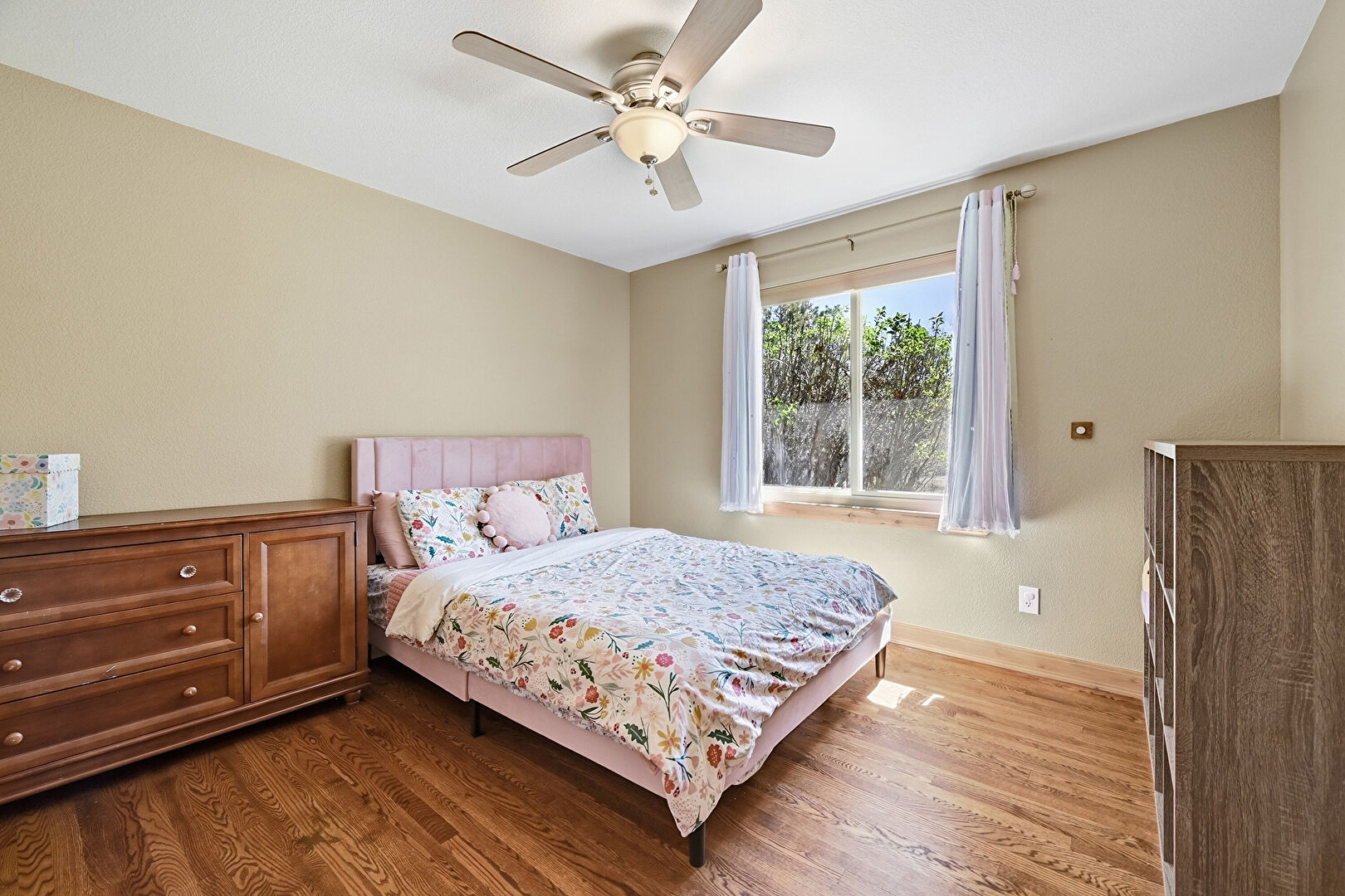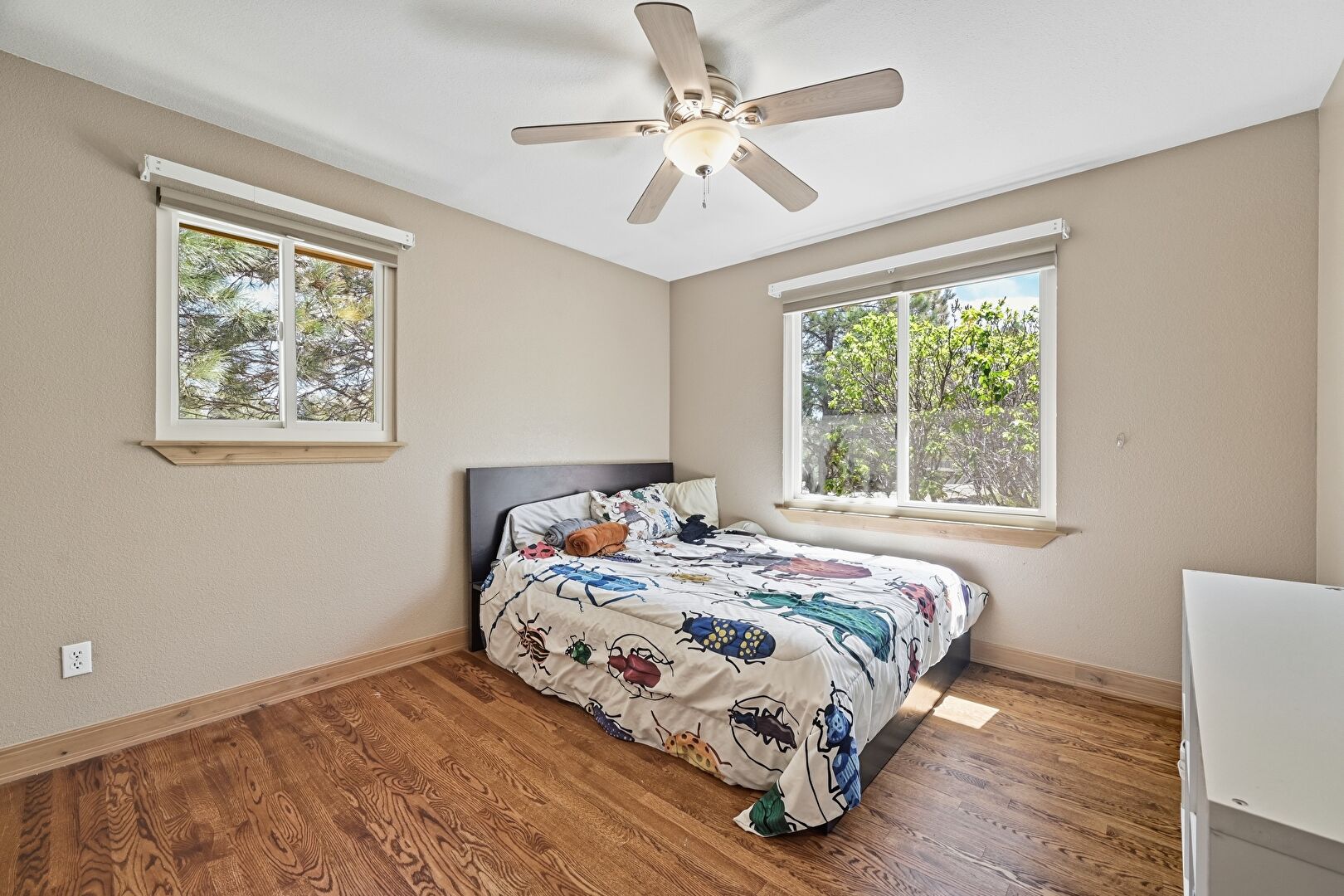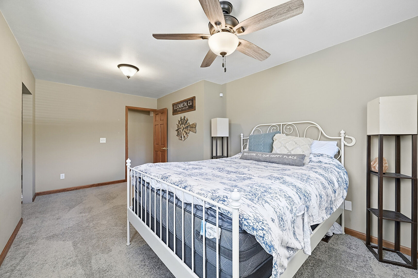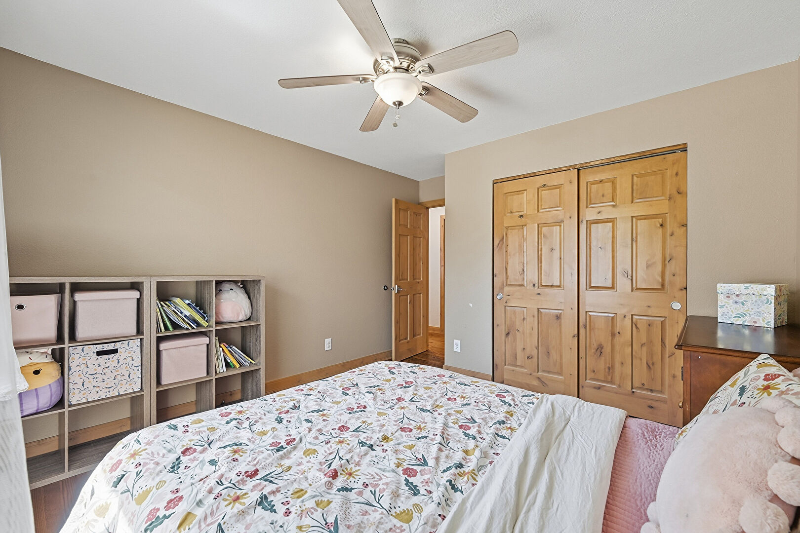 Ceiling Fan, Closet, Drywall, Ensuite Bathroom, Natural Light, Wood Finish Floor, Baseboards Wall