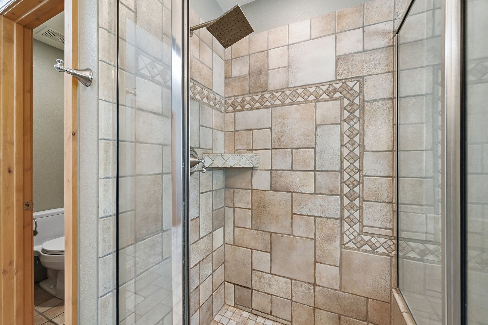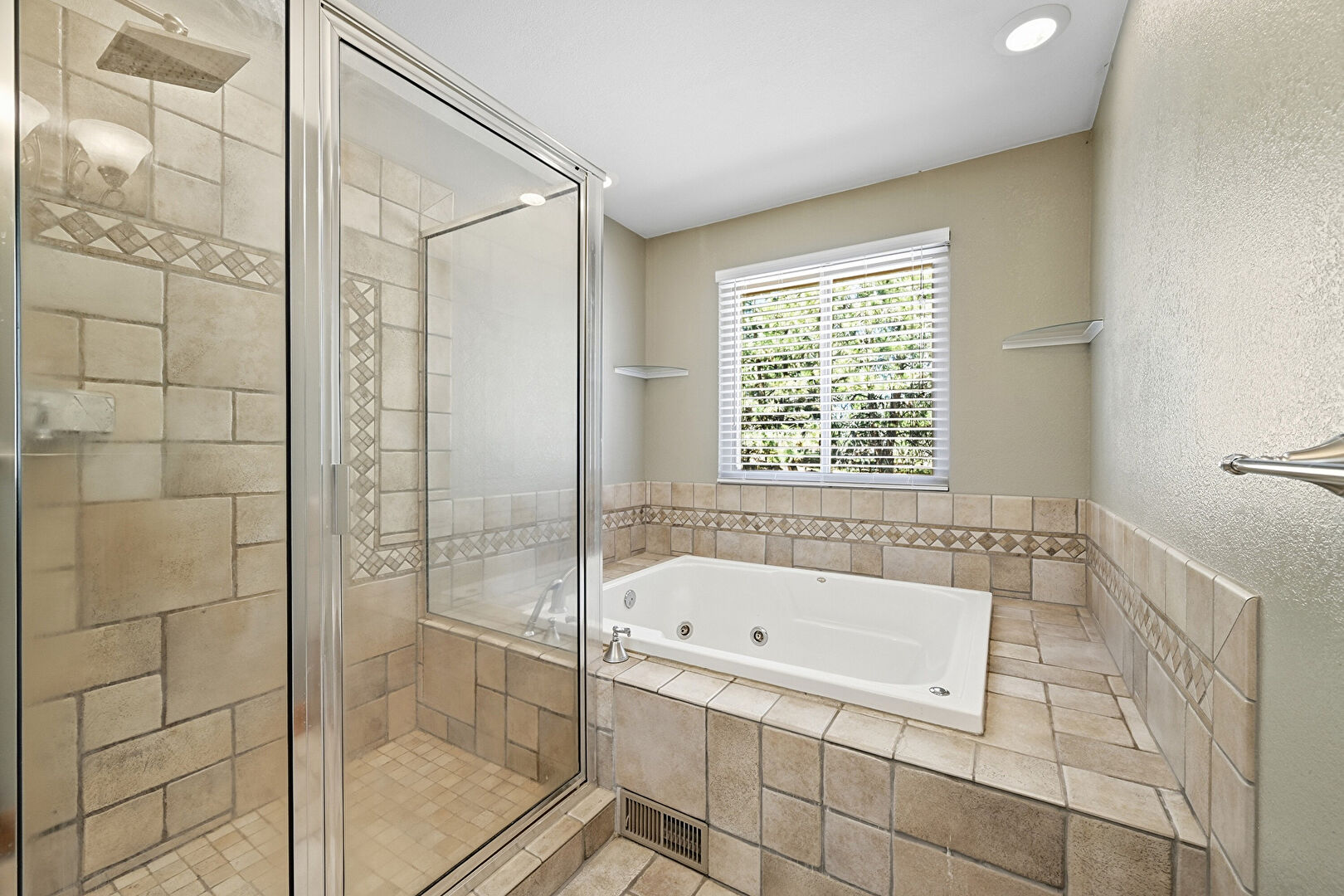 Full Bathroom, Natural Light, Textured Wall, Vent, Recessed Lighting