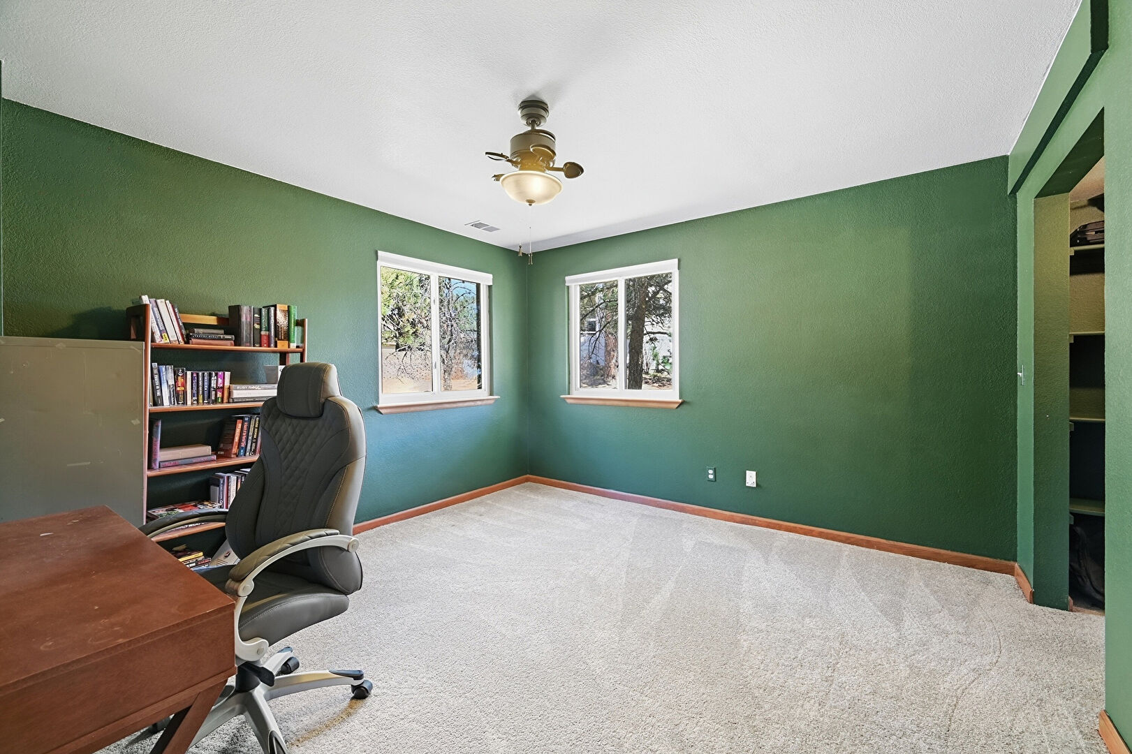 Baseboards Wall, Carpet, Ceiling Fan, Drywall, Natural Light, Office Area, Office Area, Vent