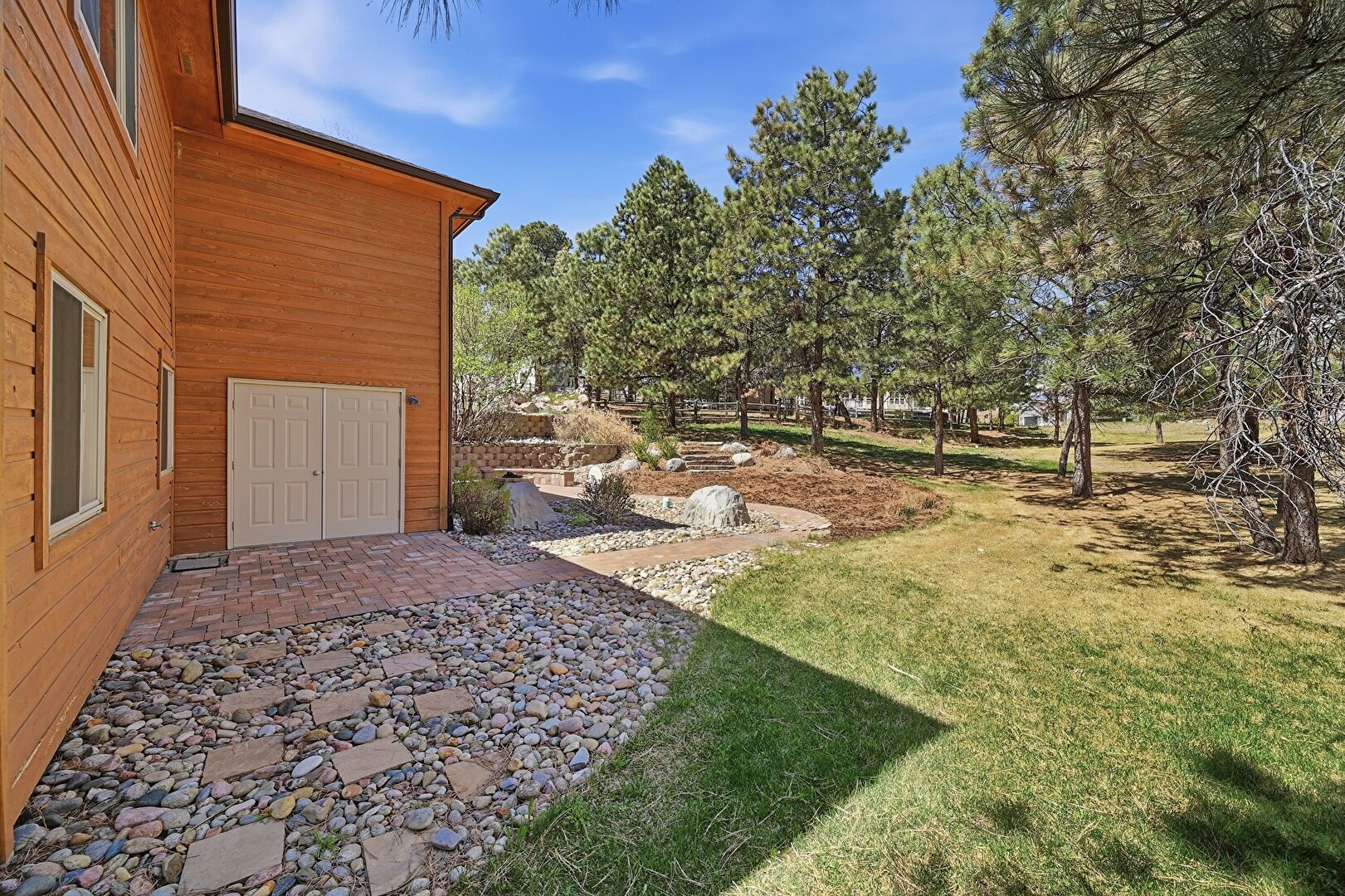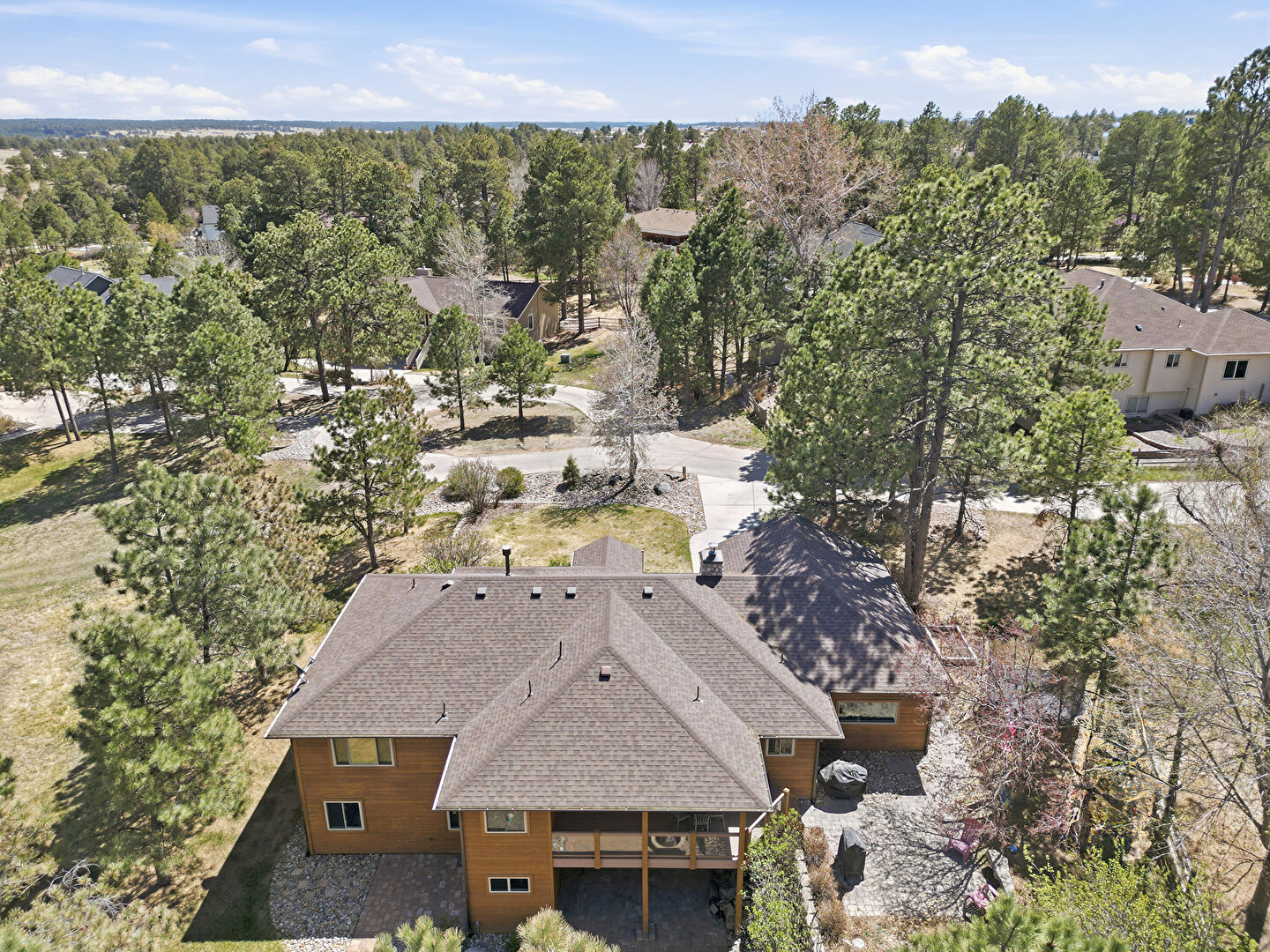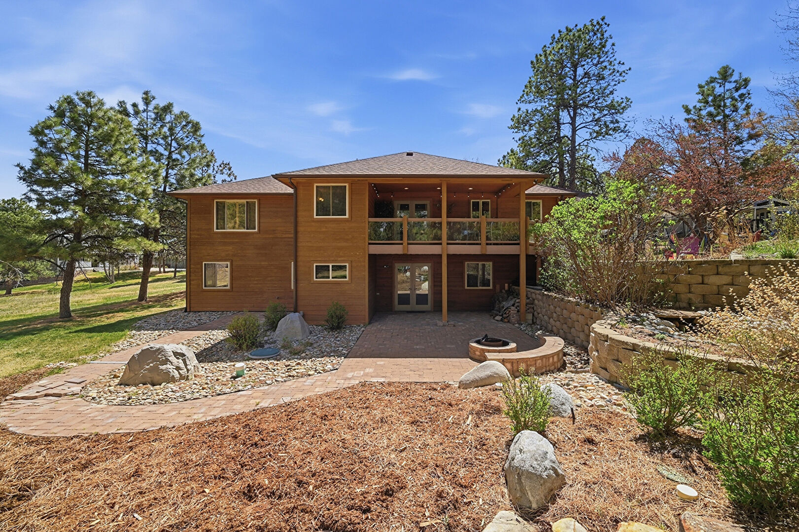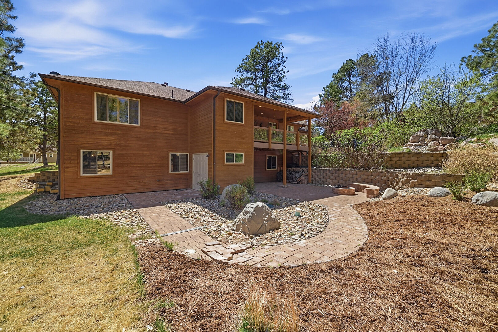 Balcony, Basement Walk Out, Chimney, Downspout, Gutters, Horizontal Siding, Lawn, Patio, Wood Siding, Gutters, Shingle Roof