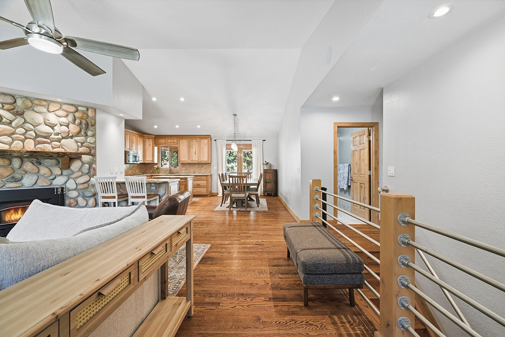 Baseboards Wall, Ceiling Fan, Drywall, Natural Light, Recessed Lighting, Wood Finish Floor, Vaulted Ceiling