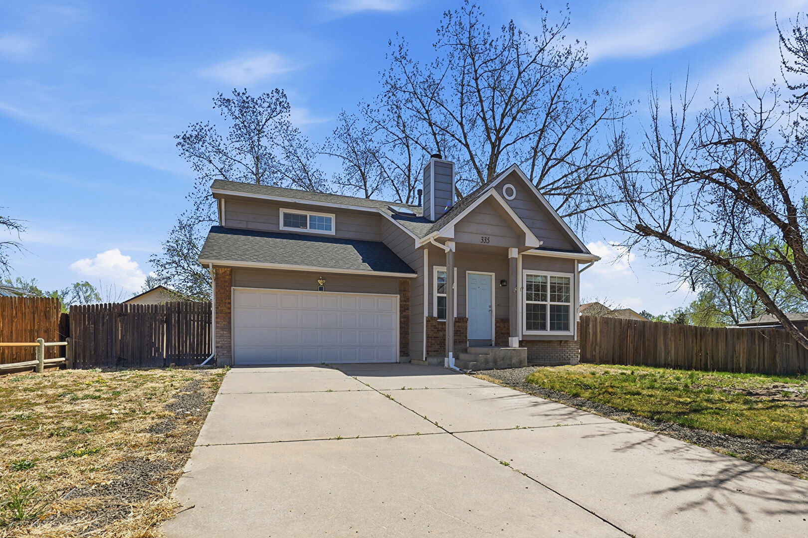 Brick Siding, Built In Garage, Chimney, Concrete Foundation, Downspout, Driveway, Fence, Garage, Gutters, Horizontal Siding, Lawn, Shingle Roof, Brick Siding, Fence, Gutters