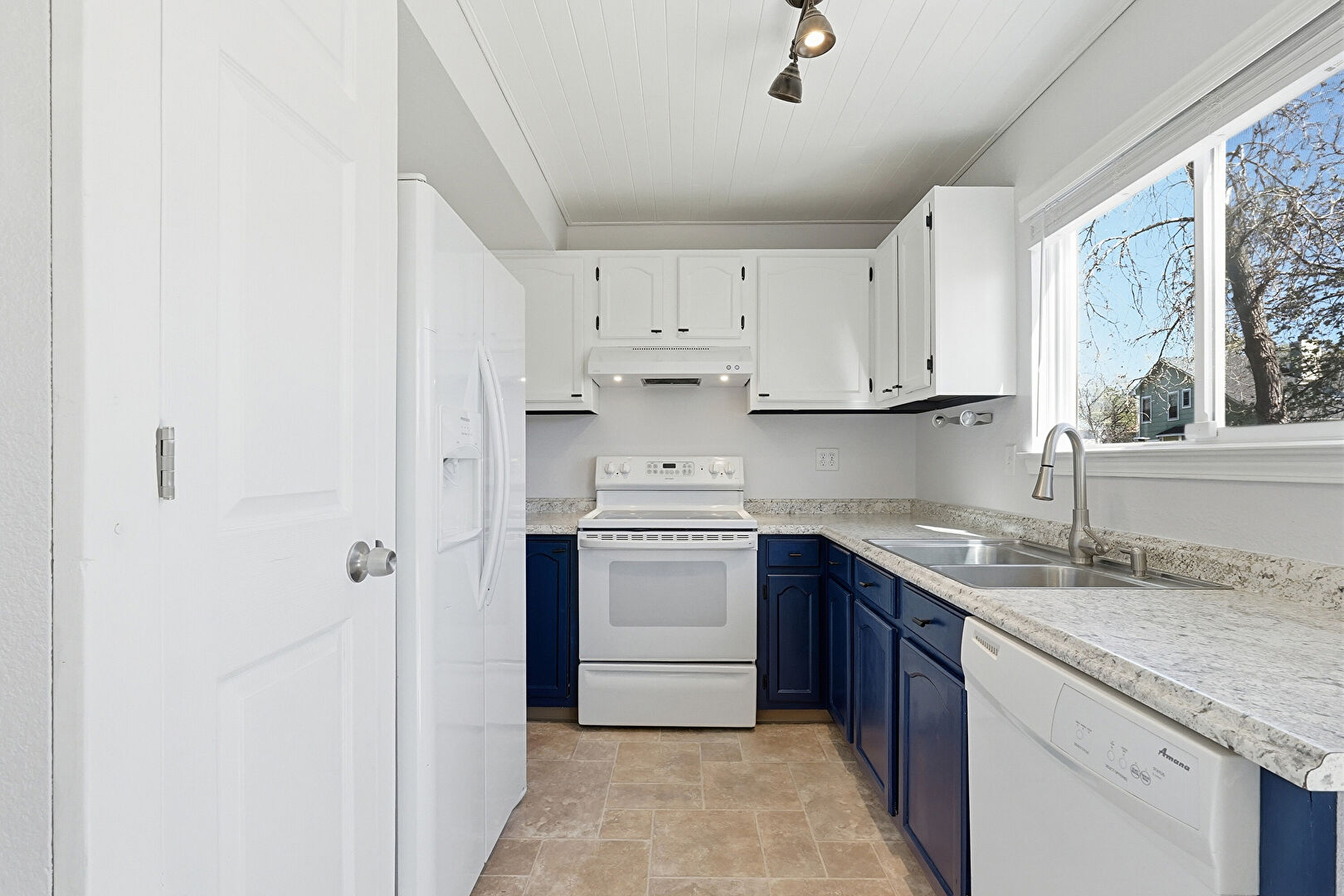 Arched Cabinets, Blue Cabinets, Crown Molding, Drywall, Natural Light, Shaker Cabinets, Stone Countertops, Stone Finish Floor, Track Lighting, U Shaped Kitchen, Visible Hinge Cabinets, Wood Ceiling, Baseboards Wall, Drywall, Shaker Cabinets