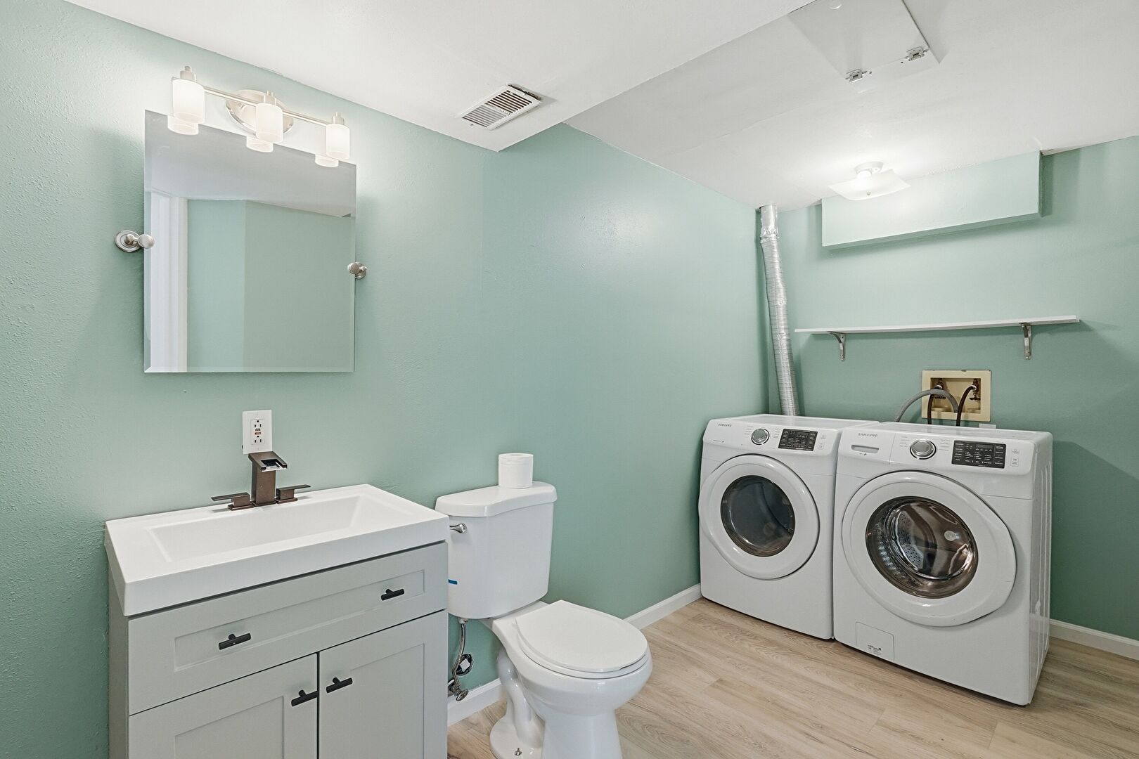 Baseboards Wall, Basement, Drywall, Half Bathroom, Laundry, Vanity, Washer Hookup, Wood Finish Floor, Vent