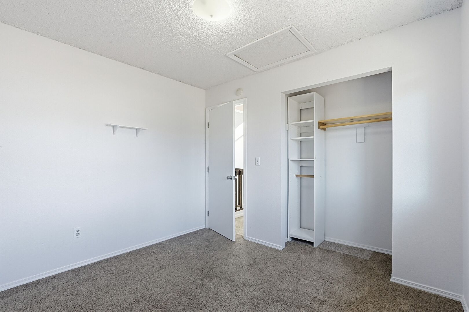 Baseboards Wall, Carpet, Closet, Drywall, Natural Light, Textured Ceiling, Vent, Baseboards Wall, Scuttle