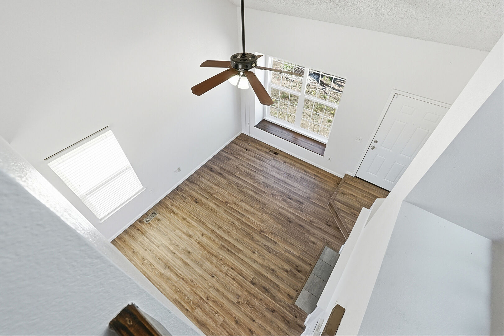Ceiling Fan, Drywall, High Ceiling, Natural Light, Textured Ceiling, Wood Finish Floor, Vaulted Ceiling