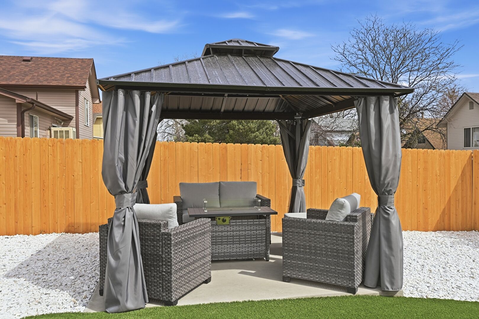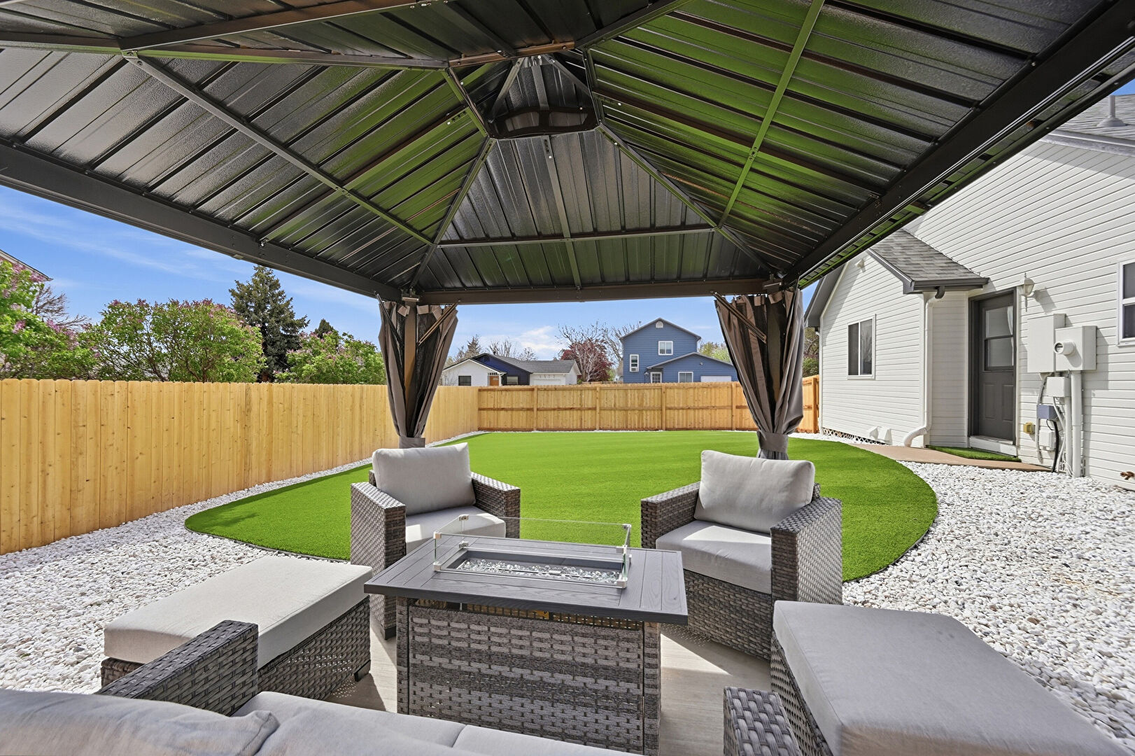 Electric Meter, Fence, Fire Pit, Gazebo, Grill, Lawn, Outdoor Living Space, Patio, Residential View, Fence, Patio